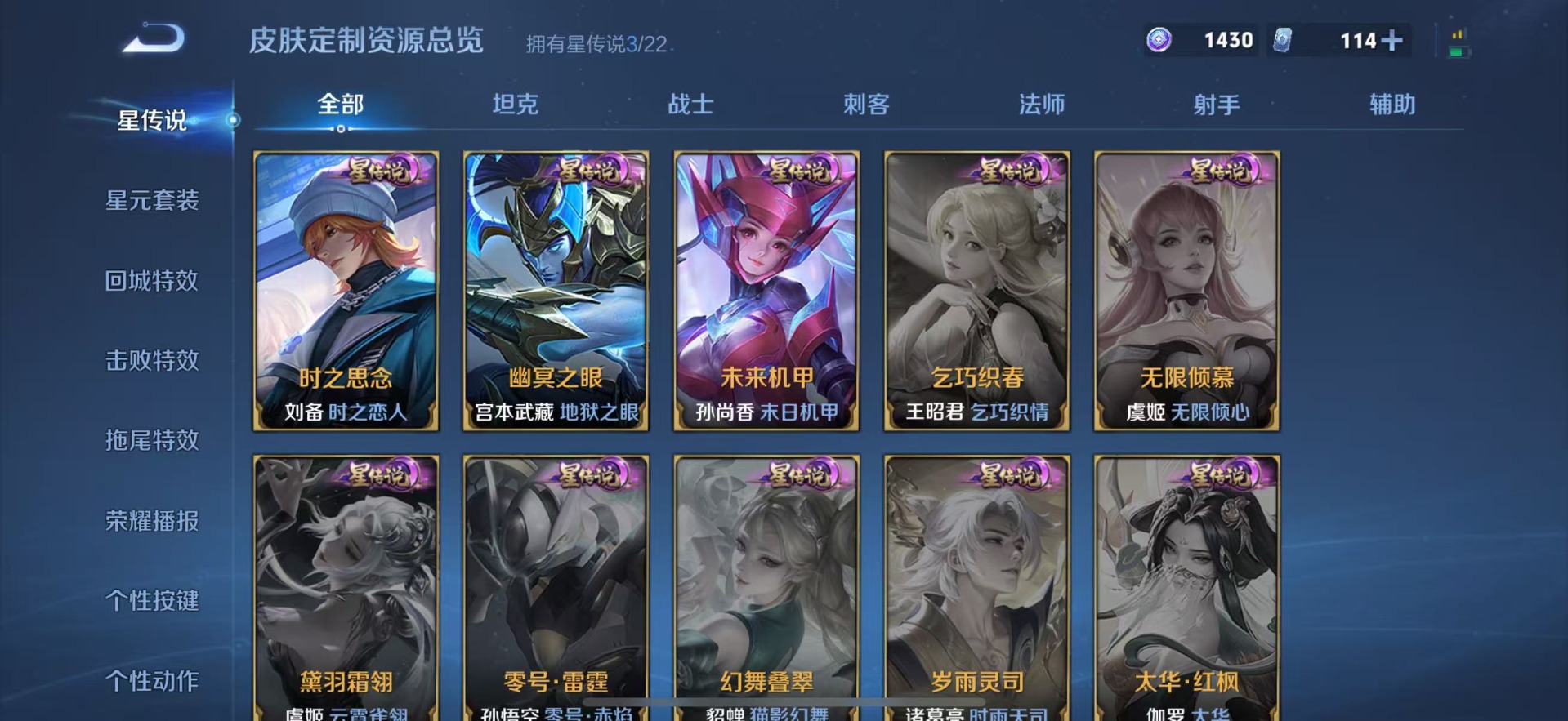 铠绛天战甲,刘备时之恋人,赵云淬星耀世,干将莫邪久胜战神,典韦战鼓燎原,小乔音你心动,李信一念神魔,孙策挚爱之约,达摩黄金狮子座,海月金乌负日,王昭君乞巧织情,露娜霜月吟,吕布遇见神鼓,后羿千劫归真,镜炽阳神光,周瑜音你心动,宫本武藏惊梅引,裴擒虎祥瑞亨通,貂蝉猫影幻舞,艾琳觅芳踪,西施续相思,曜云鹰飞将,曜李逍遥,马超无双飞将,墨子黄金天蝎座,云缨幻光神枪
