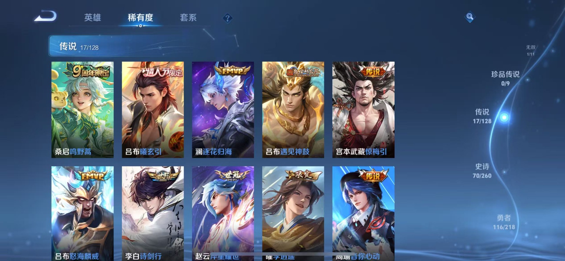 - PX_2062092-贵族等级: V5 英雄数: 112 皮肤数: 88 传说皮: 一念神魔,无双飞将,澜逐花归海 限定皮: 李小龙,神器·万象笔,鸣野蒿,愿照·九州拓