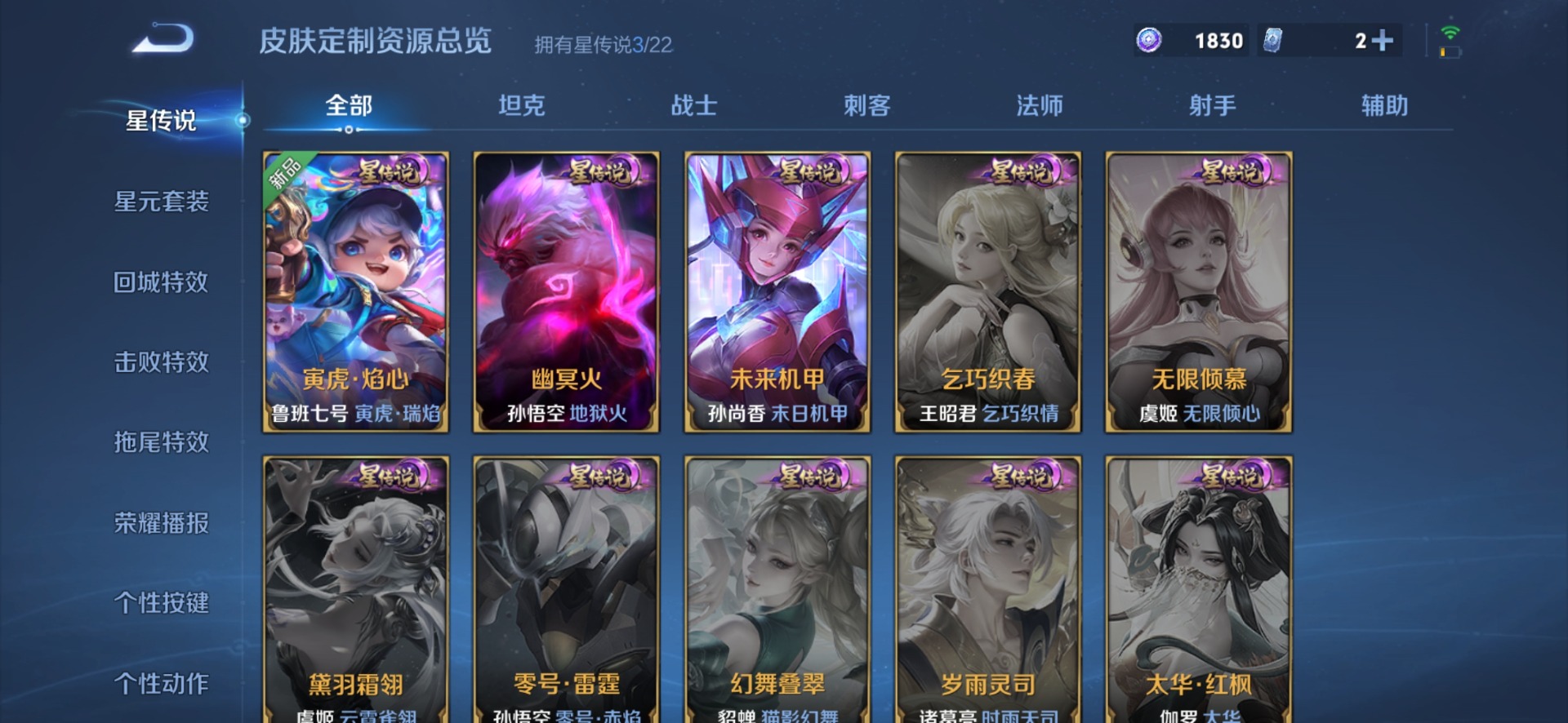 黄忠烈魂,铠青龙志,赵云龙胆,典韦岱宗,鲁班七号寅虎·瑞焰,诸葛亮时雨天司,裴擒虎李小龙,上官婉儿梁祝,李白诗剑行,桑启鸣野蒿,孙悟空孙行者,孙悟空至尊宝,孙悟空美猴王,妲己时之奇旅,韩信傲雪梅枪,百里守约朱雀志