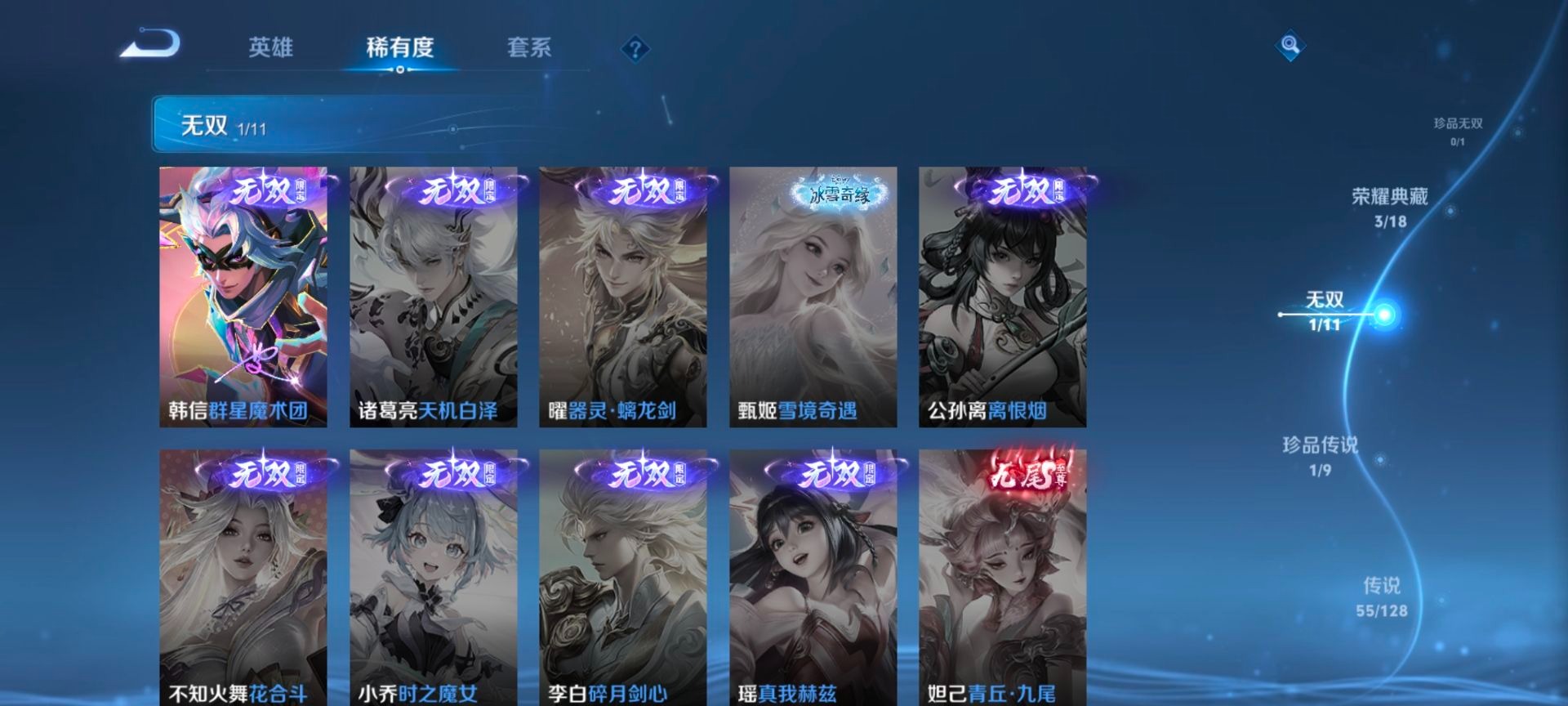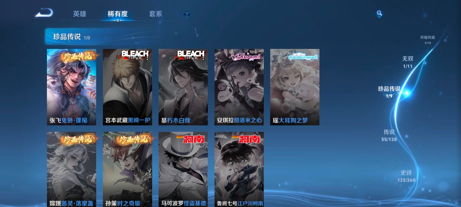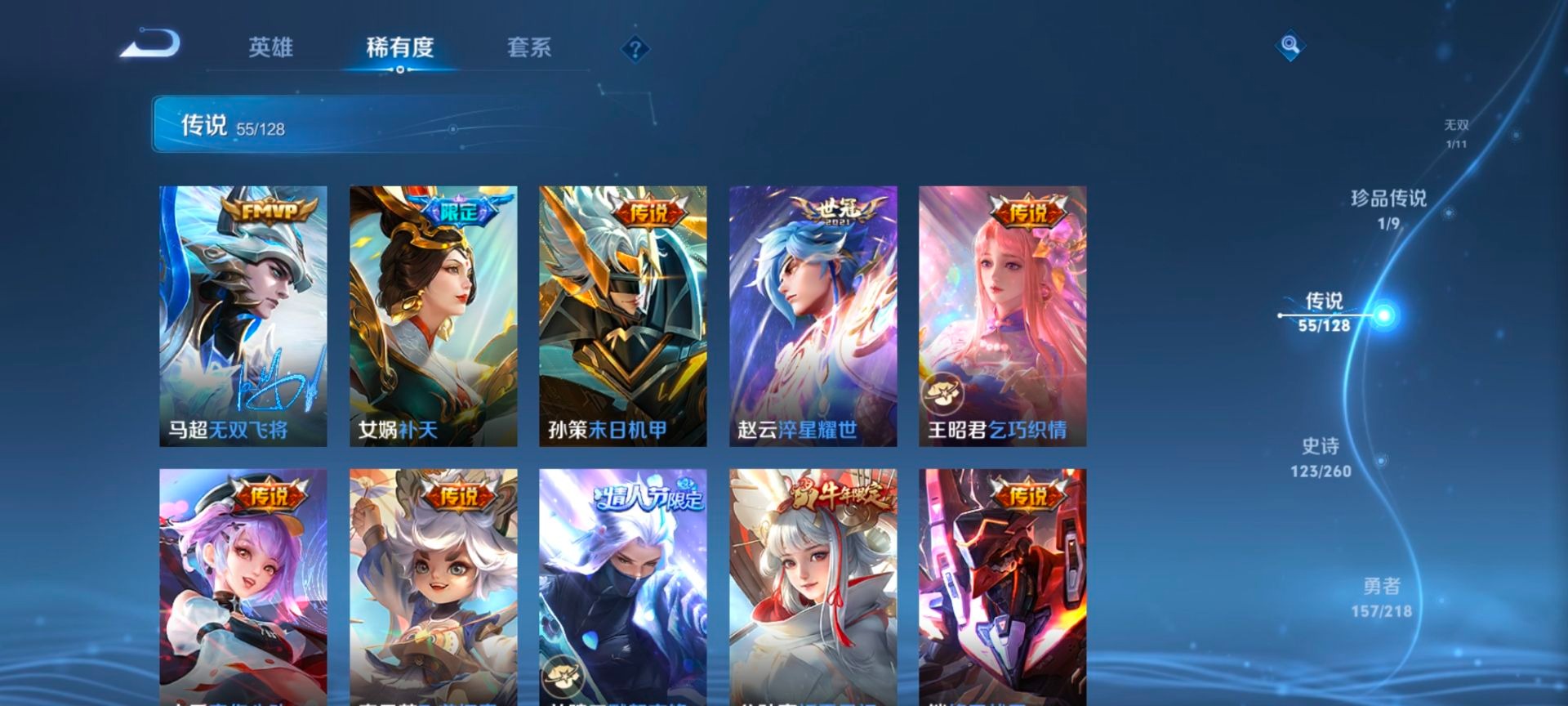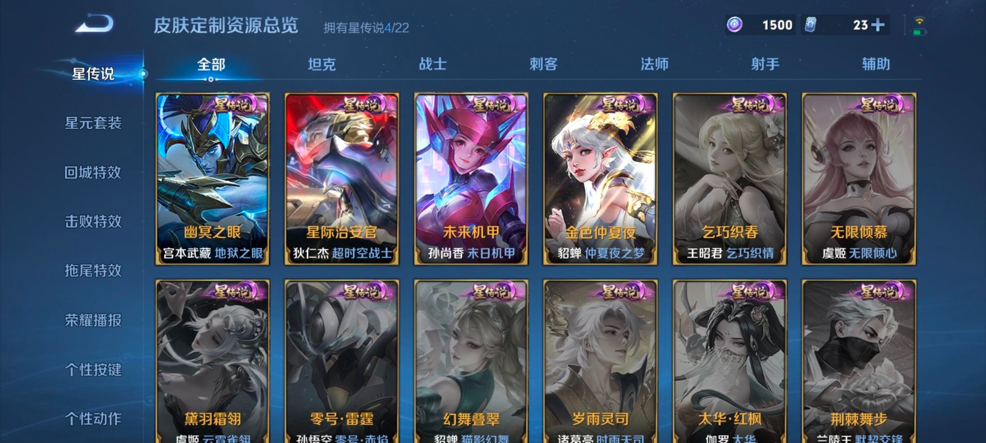 刘备时之恋人,铠绛天战甲,铠琥珀纪元,张飞百相守梦,赵云淬星耀世,干将莫邪久胜战神,小乔音你心动,干将莫邪画中仙,李信一念神魔,孙尚香音你闪耀,孙策末日机甲,达摩黄金狮子座,王昭君乞巧织情,露娜霜月吟,镜炽阳神光,公孙离记忆之芯,宫本武藏惊梅引,裴擒虎祥瑞亨通,艾琳觅芳踪,狄仁杰神器·狴犴令,狄仁杰夜礼服假面,曜云鹰飞将,马超琥珀纪元,马超无双飞将,李元芳飞鸢探春,百里守约碎云,澜逐花归海,虞姬云霓雀翎,王昭君永恒水手月亮,云缨幻光神枪