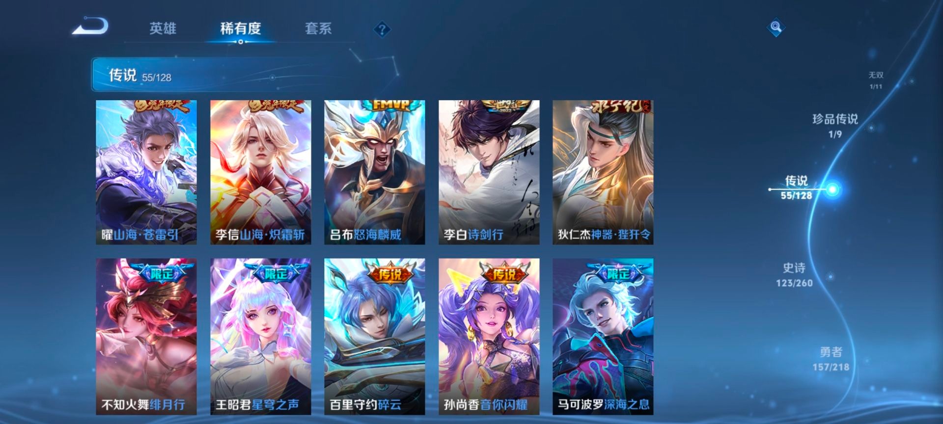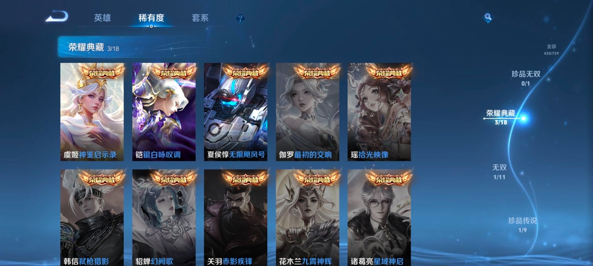 夏侯惇朔风刀,老夫子醍醐杖,沈梦溪大漠名商,盾山御銮,苏烈千军破阵,典韦穷奇,典韦蓝屏警告,达摩沙漠行僧,牛魔御旌,元歌云间偶戏,兰陵王金庭之子,裴擒虎擒涛扼浪,鲁班大师探海日志,明世隐疑决卦,马可波罗暗影游猎,鬼谷子原初探秘者,张良古海寻踪,女娲朔望之晖,桑启海盐诗旅,嬴政白昼王子,狄仁杰万华元夜,芈月重明,程咬金演武夺筹,李元芳银河之约,李元芳云中旅人,弈星混沌棋,米莱狄御霄,钟馗驱傩正仪,狂铁御狮