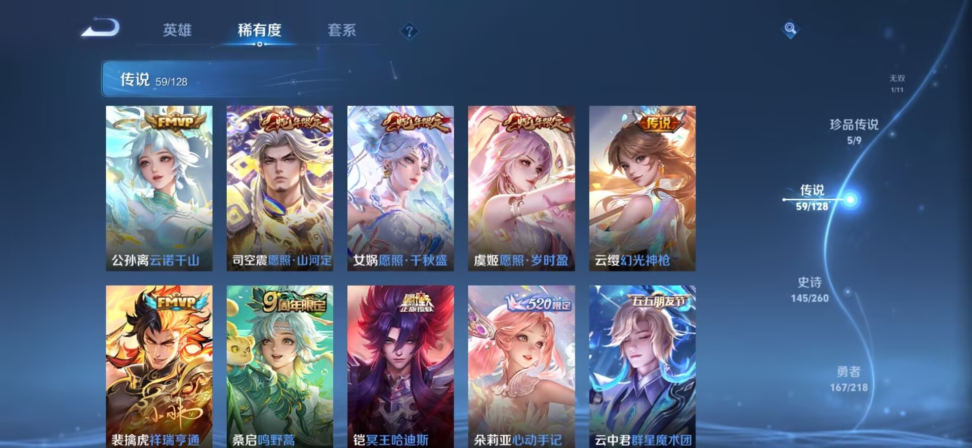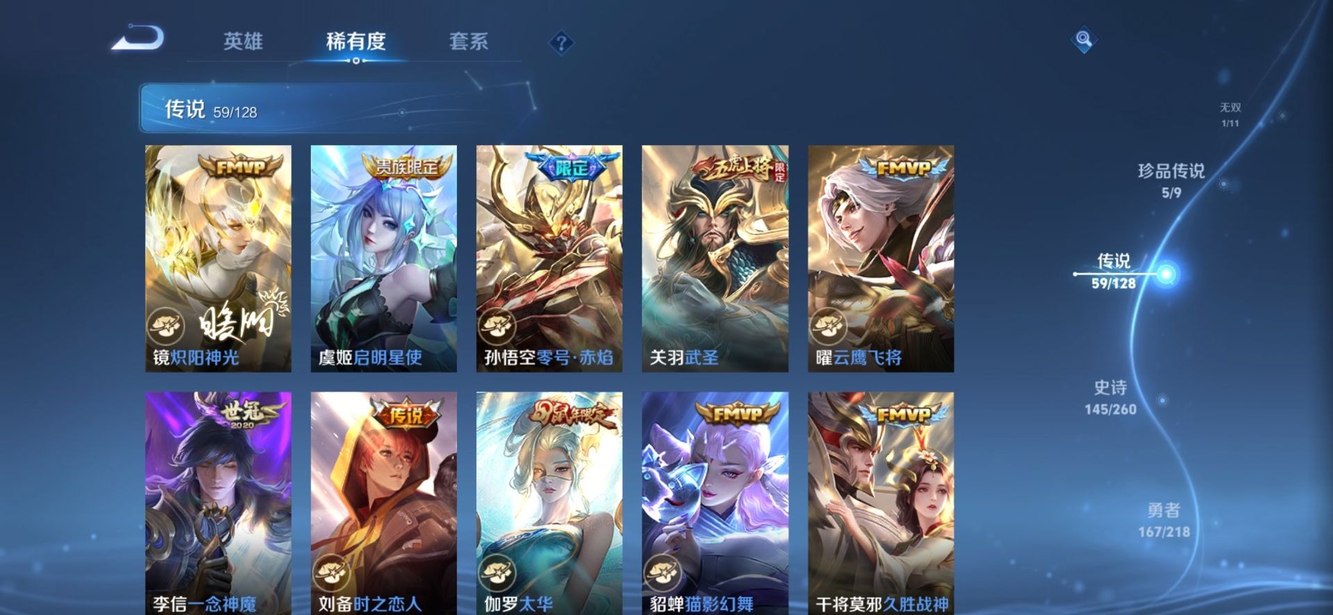 铠青龙志,伽罗天狼溯光者,伽罗太华,孙膑天狼运算者,干将莫邪冰霜恋舞曲,典韦岱宗,孙尚香异界灵契,牛魔奔雷神使,吕布御风骁将,后羿如梦令,诸葛亮时雨天司,公孙离祈雪灵祝,公孙离蜜橘之夏,司空震愿照·山河定,裴擒虎李小龙,上官婉儿梁祝,上官婉儿神器·万象笔,上官婉儿天狼绘梦者,李白诗剑行,花木兰默契交锋,安琪拉魔法小厨娘,马可波罗山海·玄木吟,桑启鸣野蒿,女娲愿照·千秋盛,孙悟空孙行者,孙悟空大圣娶亲,芈月白晶晶,孙悟空至尊宝,百里玄策白虎志,马超神威,妲己时之奇旅,虞姬愿照·岁时盈,关羽武圣,橘右京枫霜尽
