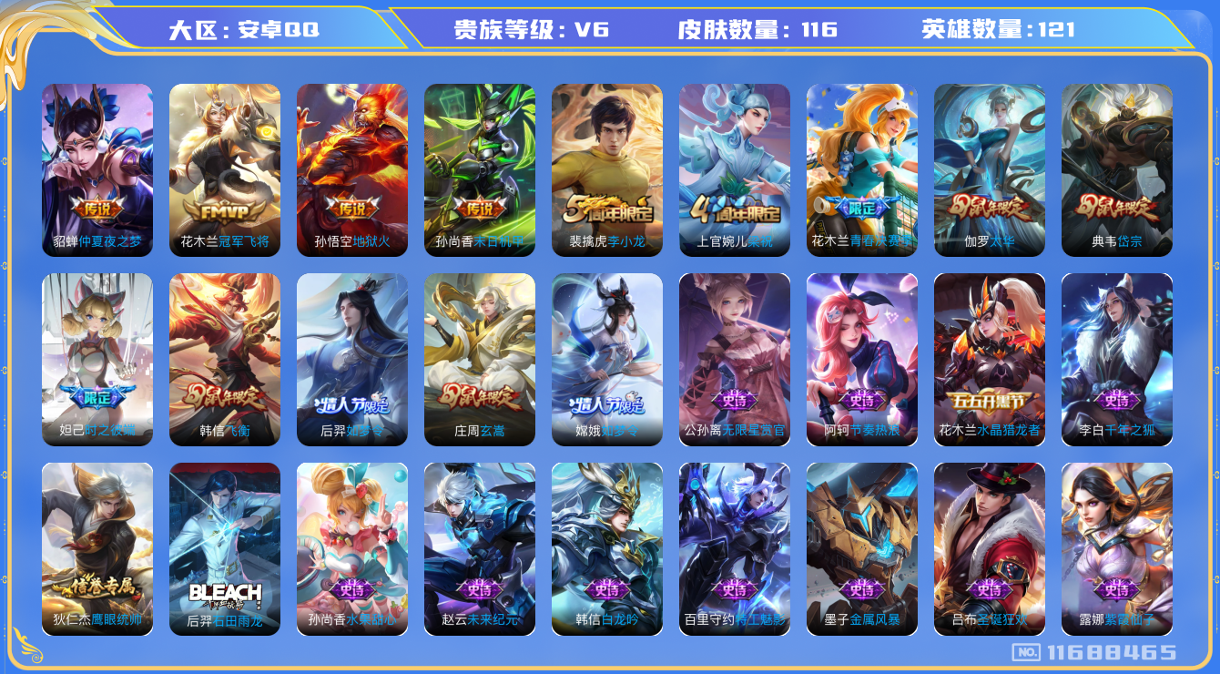 - [11297544]V8 3典藏 1珍品传说 11传说 125英雄 347皮肤 可修改实名 优质装备:鸣剑·曳影,弑枪猎影(韩信典藏),最初的交响(伽罗典藏),怪盗基德,黄金白羊座,炽阳神光,末日机甲-孙尚香(绿蚂蚱),时之恋人-刘备(电焊工),超时空战士-狄仁杰 传说皮:乘龙·问璇玑(孙尚香年限),乘龙·铭钟鼎(赵云年限),幻光神枪 珍宝阁皮:妄想食味,万物之道,优雅恋人 限定皮:愿照·九州拓(澜年限),逐霄战戟,鸣野蒿,傲雪梅枪,高山流水,匿光决锋者,五谷丰年,游园惊梦,梁祝,天狼狩猎者,李小龙,孙行者,玉兔公主,神器·万象笔,山海·玄木吟(马可年限) 史诗皮:星界战将,茶境仙,器灵·浮梦炉,鸭鸭历险记-刘禅,龙之律动,石田雨龙,百相守梦-百里守约,蔬乡物语(鲁班七号),琥珀纪元伽罗,化蝶舞,破空之剑,紫霞仙子,苍穹之光,电玩小子(小书包),黄金分割率,特工魅影,千年之狐,电玩·兔顽号,江河有灵,高渐离燃音魔法,雪夜绮愿(周瑜),百解令(蒙犽),偶像歌手,无限星赏官,魅语,白蛇,电玩·爆裂旋风,百相守梦(刘备),暗夜猫娘,龙骑士(小龙虾),末日机甲-吕布,猫狗日记-孙策,猫狗日记-大乔,时之恋人-孙尚香,乱世虎臣,节奏热浪,修罗,女仆咖啡,水果甜心,绅士熊喵,天才门将,星夜王子,心灵骇客,功夫厨神,德古拉伯爵,暗隐猎兽者,幽灵船长,鬼剑武藏,心灵战警,乐园奇幻夜,天秀·启明,舞动绿茵,地狱岩魂,纤云弄巧,拒霜思,缤纷独角兽,乘风破浪,逐浪之夏,月团寄思,水晶猎龙者,曙光守护者,箭羽风息,唤灵魅影,金属风暴,原初追逐者,圣诞狂欢,圣诞恋歌,鹰眼统帅,奇遇舞章,天秀·音浪,千筹问战,无心,未来纪元-赵云