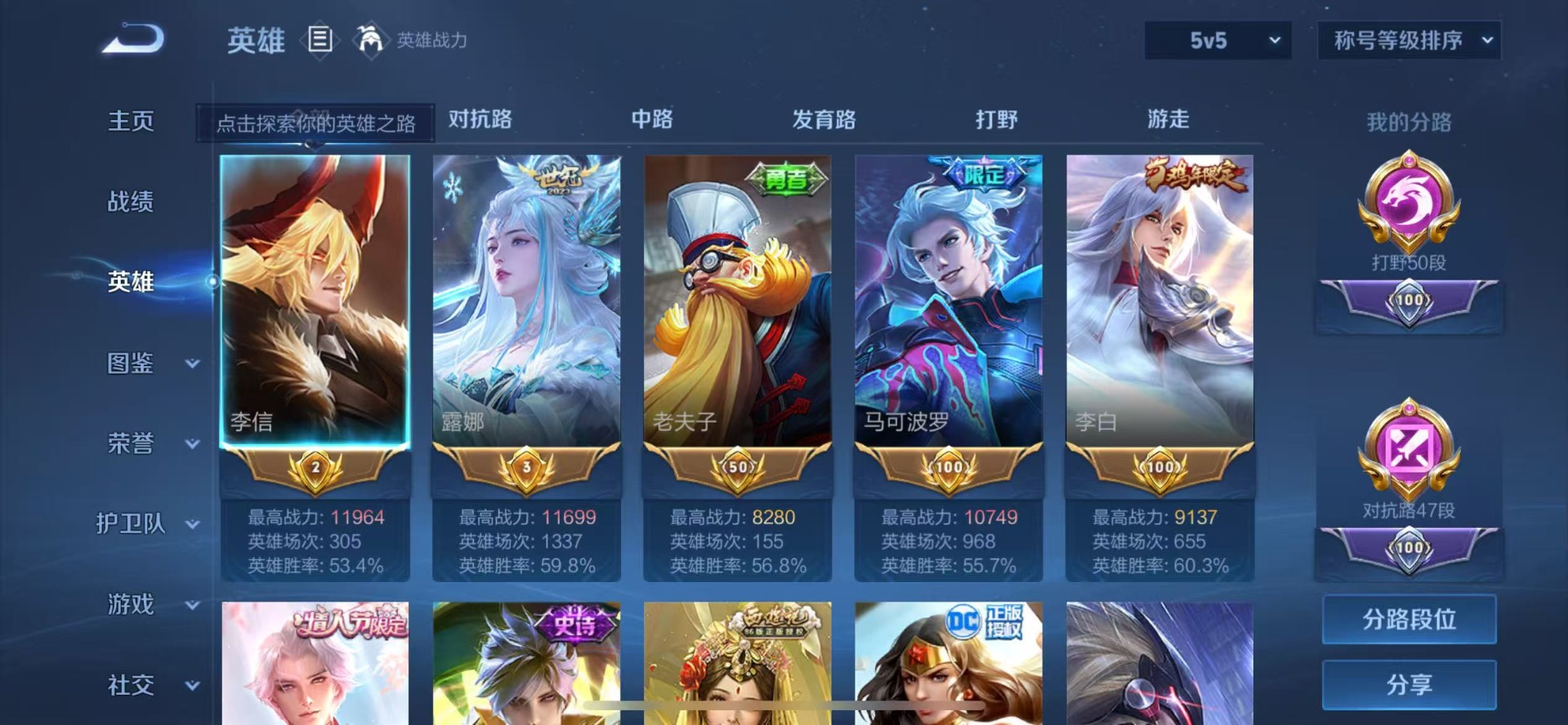 - PX_2058709-贵族等级: V7 英雄数: 123 皮肤数: 150 荣耀水晶: 全息碎影 星传说: 幽冥火 传说皮: 地狱火,零号·赤焰 限定皮: 冰锋战神,遇见飞天,李小龙,飞衡,逐梦之影,至尊宝,高山流水,五谷丰年