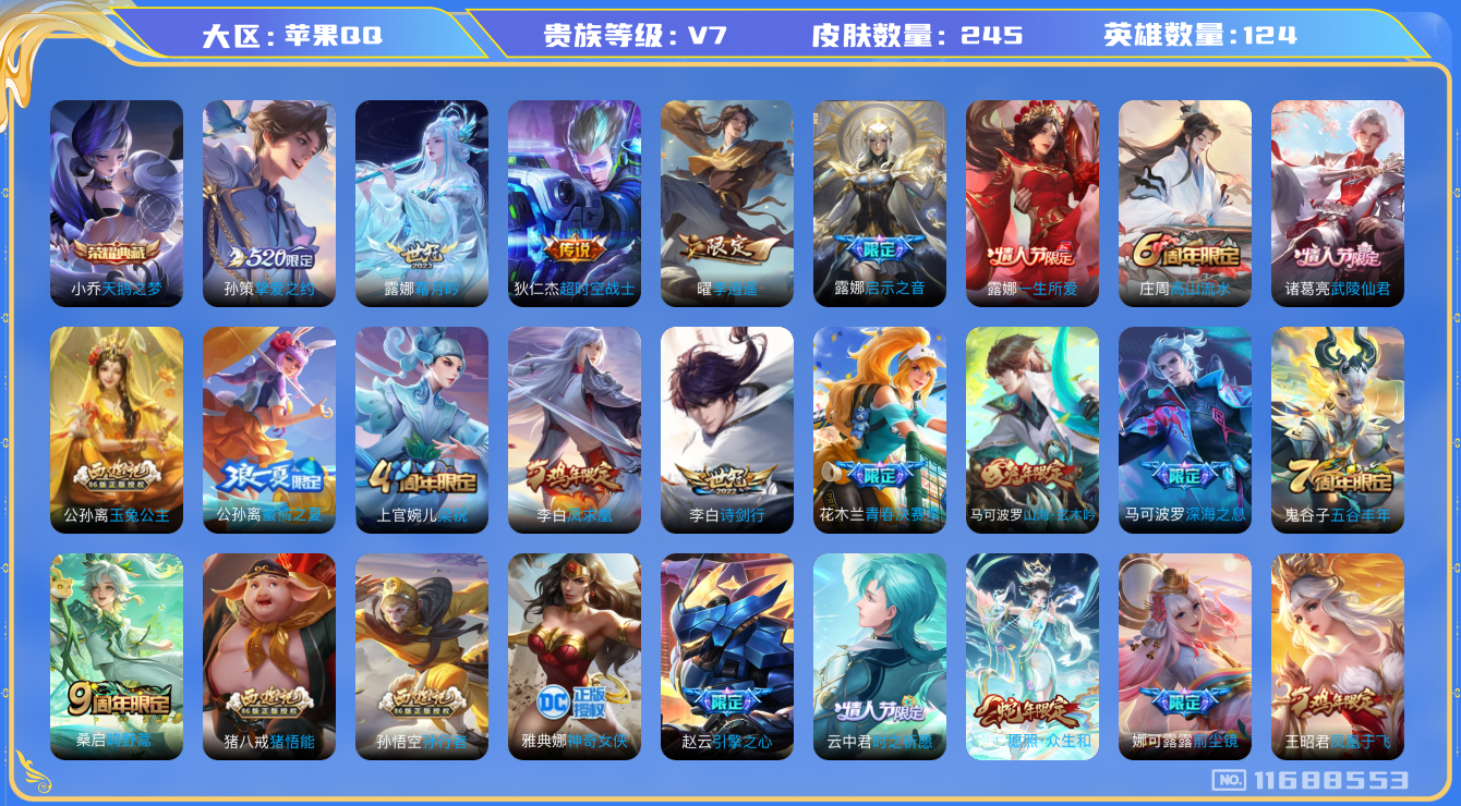 [11688553]V7 1典藏 12传说 124英雄 245皮肤 可修改实名 优质装备:天鹅之梦(小乔典藏),李逍遥,超时空战士-狄仁杰,挚爱之约,霜月吟 珍宝阁皮:妄想食味,优雅恋人 限定皮:愿照·众生和(妲己年限),鸣野蒿,凤求凰(白切鸡),凤凰于飞,武陵仙君(小桃花),前尘镜,高山流水,诗剑行,五谷丰年,梁祝,孙行者,猪悟能,一生所爱,引擎之心,青春决赛季,蜜橘之夏,神奇女侠,时之祈愿-云中君,玉兔公主,启示之音,深海之息(深海大菠萝),山海·玄木吟(马可年限) 史诗皮:星界战将,破空之剑,星界特工,遇见神鹿,紫霞仙子,电玩小子(小书包),白龙吟,黄金分割率,特工魅影,千年之狐,蒙恬荣光圣徽,冰冠公主,青蛇,偶像歌手,末日机甲-吕布,猫狗日记-孙策,节奏热浪,摇滚巨星,水果甜心,天才门将,心灵骇客,德古拉伯爵,暗隐猎兽者,幽灵船长,鬼剑武藏,乘风破浪,逐浪之夏,水晶猎龙者,金属风暴,原初追逐者,圣诞狂欢,圣诞恋歌,鹰眼统帅,魅力维加斯,黎明之约,赏金猎手,未来纪元-赵云