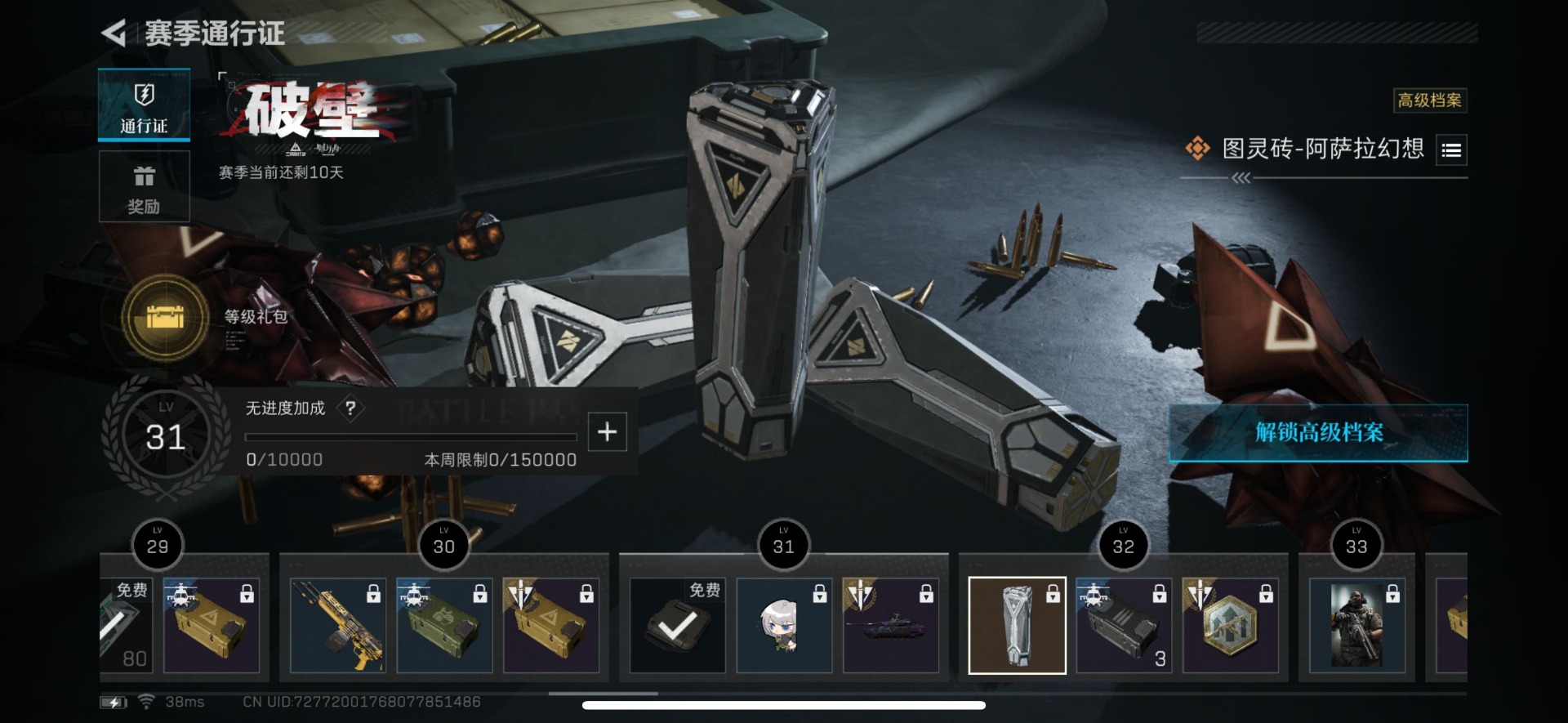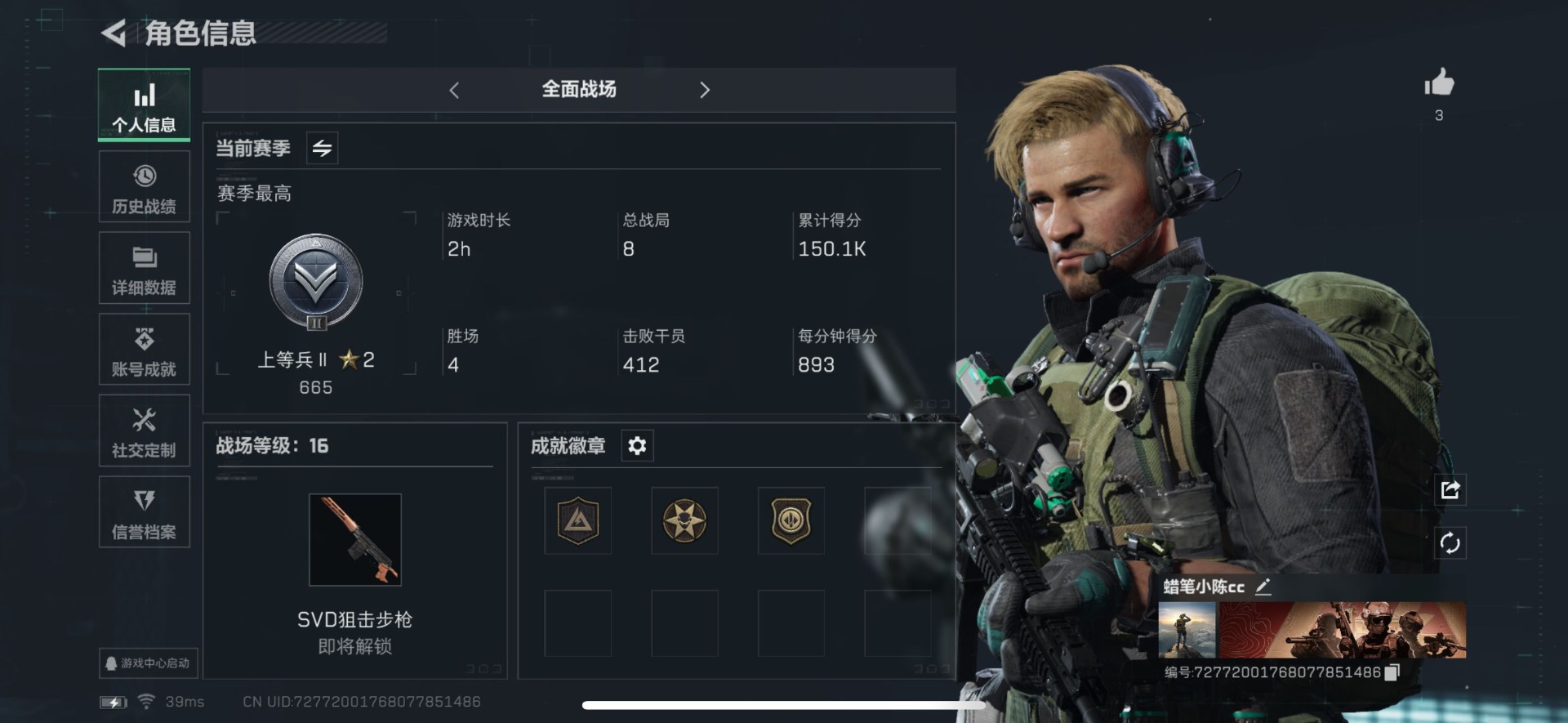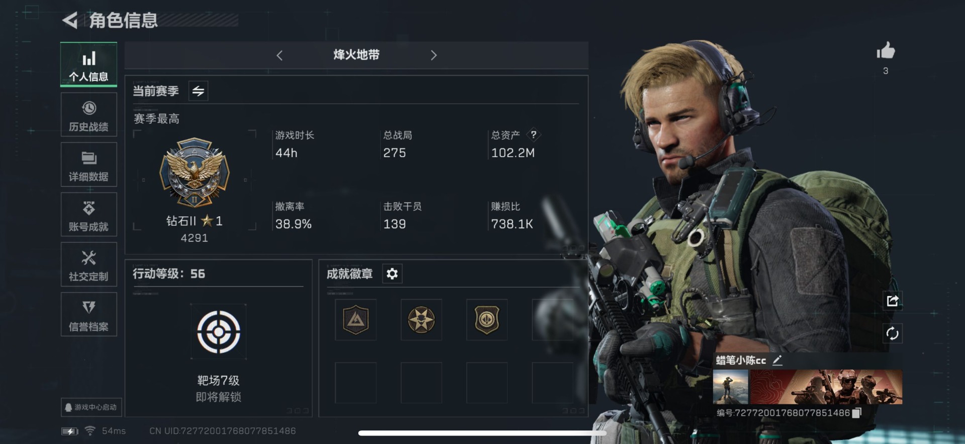 [11688727]总资产:102.2M 1传说枪械 哈夫币:32.077K 可二次 可修改实名 烽火地带段位:钻石 全面战场段位:上等兵 传说武器皮肤:复合弓-黑-天际线 史诗武器皮肤:M16A4突击步枪-竞赛选手,SV-98狙击步枪-林中猎手,SV-98狙击步枪-囚徒