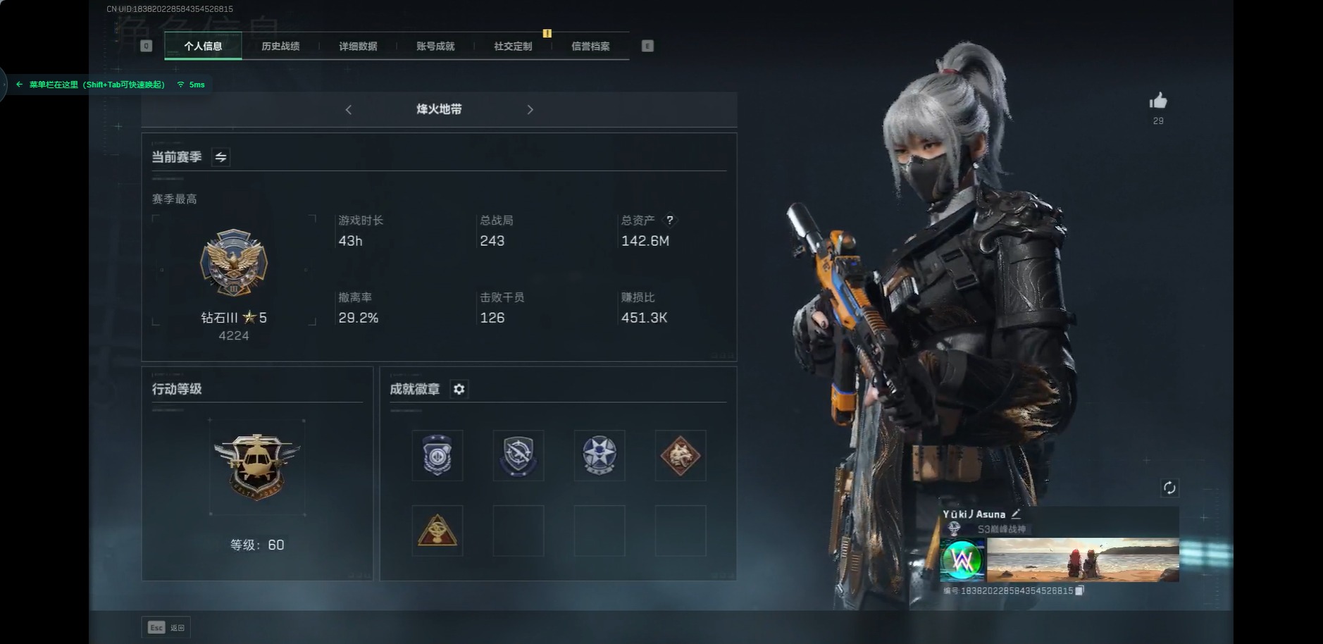 [11688772]总资产:142.6M 2干员外观 1近战传说 24传说枪械 哈夫币:2.773K 高级安全箱(2×3)9.15号到期 可二次 可修改实名 优质装备:近战-北极星,QBZ95-1突击步枪-王牌之剑(典藏) 烽火地带段位:钻石 全面战场段位:校官 传说武器皮肤:SR-25射手步枪-水墨云图,SCAR-H战斗步枪-水墨云图,SCAR-H战斗步枪-铁艺苍穹,AK-12突击步枪-夜鹰,SMG45冲锋枪-骑士,K437突击步枪-极速狂飙,G3战斗步枪-流光铂影,AKM突击步枪-流光铂影,UZI冲锋枪-流光铂影,93R-捞点薯条,AWM狙击步枪-捞点薯条,腾龙突击步枪-捞点薯条,CAR-15突击步枪-阿米娅,勇士冲锋枪-能天使-午夜邮差,复合弓-黑-天际线,M4A1突击步枪-阿米娅,725双管霰弹枪-送葬人-无题密令,K437突击步枪-北极星,QCQ171冲锋枪-北极星,M7战斗步枪-维京,M7战斗步枪-怜悯,ASh-12战斗步枪-怜悯 史诗武器皮肤:勇士冲锋枪-私人定制(典藏),AUG突击步枪-甜心子弹,M14射手步枪-甜心子弹,M249轻机枪-甜心子弹,SR-3M紧凑突击步枪-英雄,QBZ95-1突击步枪-ACE,M4A1突击步枪-特勤执行,AUG突击步枪-特勤执行,Vector冲锋枪-红色彗星,PTR-32战斗步枪-ACE,SKS射手步枪-ACE,AUG突击步枪-蝮蛇,PKM通用机枪-蝮蛇,G3战斗步枪-战场英杰,Ash-12战斗步枪-守夜人,M16A4突击步枪-竞赛选手,PKM通用机枪-守夜人,AS Val突击步枪-尖端治疗,M700狙击步枪-守夜人,SG552突击步枪-尖端治疗,SR-25射手步枪-尖端治疗,PKM通用机枪-荒野求生,MP5冲锋枪-深海恐惧,勇士冲锋枪-深海恐惧,SG552突击步枪-深海恐惧,AKM突击步枪-林中猎手,.357左轮-幸运时刻,SR-3M紧凑突击步枪-荒野求生,M1014霰弹枪-林中猎手,SV-98狙击步枪-林中猎手,AS Val突击步枪-典狱官,M250通用机枪-囚徒,SV-98狙击步枪-囚徒,SCAR-H战斗步枪-囚徒,PSG-1射手步枪-无垢,QBZ95-1突击步枪-曙光,UZI冲锋枪-危险实验,M249轻机枪-维京,SCAR-H战斗步枪-危险实验,沙漠之鹰-曙光,Vector冲锋枪-阿萨拉文明,SVD狙击步枪-阿萨拉工艺