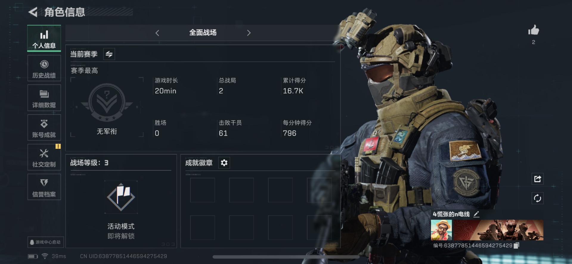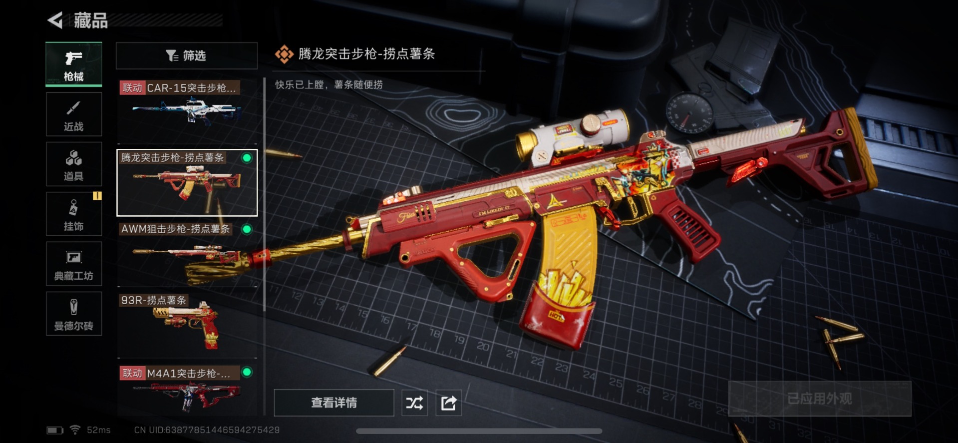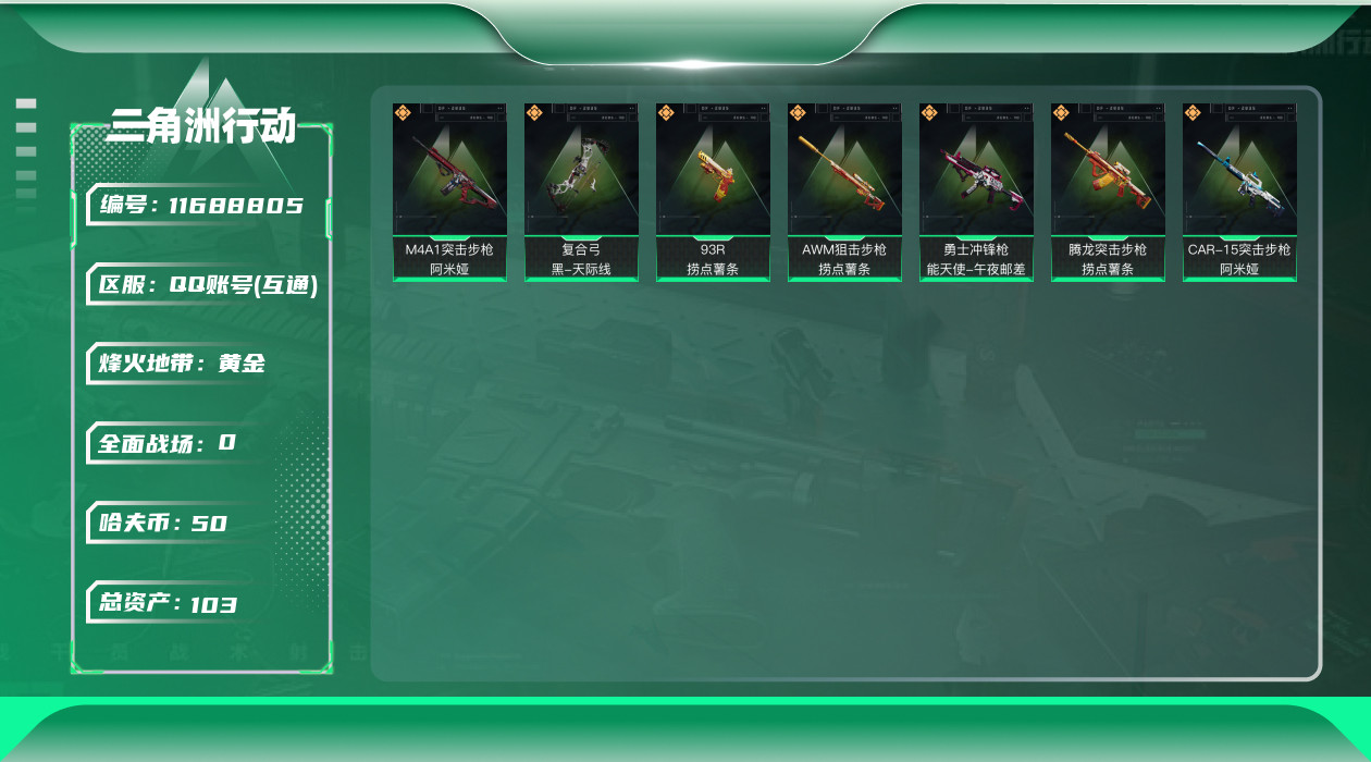 [11688805]总资产:103.1M 7传说枪械 哈夫币:50.186K 进阶安全箱(9.16到期) 可二次 可修改实名 烽火地带段位:黄金 全面战场段位:无段位 传说武器皮肤:AWM狙击步枪-捞点薯条,腾龙突击步枪-捞点薯条,93R-捞点薯条,勇士冲锋枪-能天使-午夜邮差,复合弓-黑-天际线,M4A1突击步枪-阿米娅,CAR-15突击步枪-阿米娅