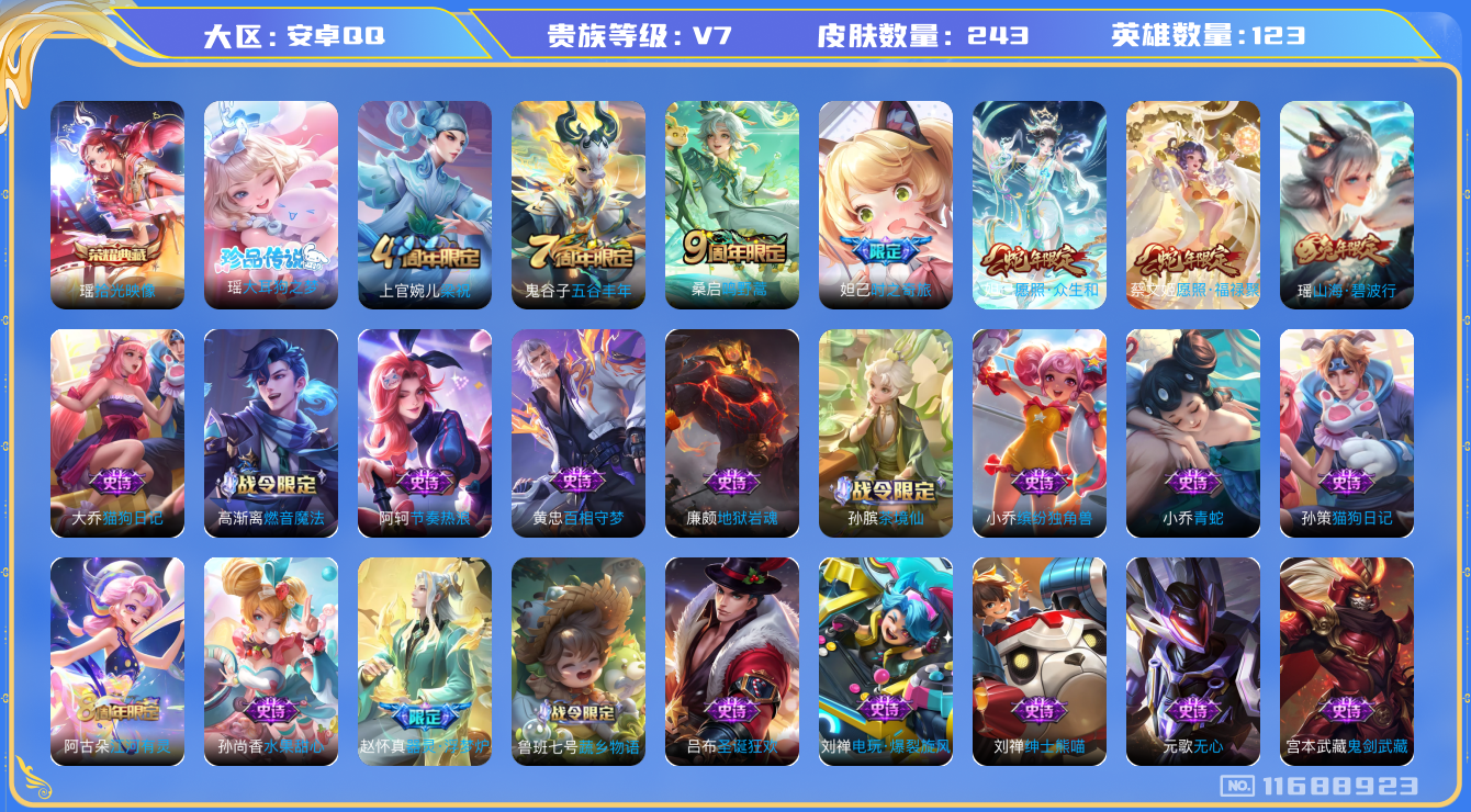 [11688923]V7 1典藏 1珍品传说 3传说 123英雄 243皮肤 可修改实名 优质装备:拾光映像(瑶典藏),大耳狗之梦 珍宝阁皮:妄想食味,蔷薇恋人 限定皮:愿照·福禄聚(蔡文姬年限),愿照·众生和(妲己年限),鸣野蒿,山海·碧波行(瑶年限),五谷丰年,梁祝,时之奇旅-妲己 史诗皮:器灵·浮梦炉,龙之律动,茶境仙,蔬乡物语(鲁班七号),百相守梦-黄忠,遇见神鹿,江河有灵,匿光侦查者,高渐离燃音魔法,青蛇,偶像歌手,电玩·爆裂旋风,猫狗日记-孙策,猫狗日记-大乔,节奏热浪,修罗,女仆咖啡,摇滚巨星,水果甜心,绅士熊喵,心灵骇客,鬼剑武藏,心灵战警,舞动绿茵,地狱岩魂,纤云弄巧,拒霜思,缤纷独角兽,逐浪之夏,水晶猎龙者,唤灵魅影,圣诞狂欢,圣诞恋歌,鹰眼统帅,魅力维加斯,奇遇舞章,无心