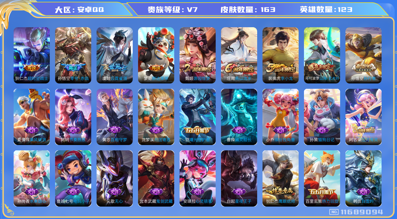 [11689094]V7 4传说 123英雄 163皮肤 可修改实名 优质装备:云霓雀翎,零号·赤焰,胖达荣荣,超时空战士-狄仁杰 珍宝阁皮:妄想食味,胡桃夹子 限定皮:高山流水,游园惊梦,李小龙,孙行者,山海·玄木吟(马可年限) 史诗皮:百相守梦-黄忠,遇见神鹿,电玩小子(小书包),白龙吟,江河有灵,猫狗日记-孙策,节奏热浪,修罗,女仆咖啡,水果甜心,星夜王子,心灵骇客,幽灵船长,鬼剑武藏,缤纷独角兽,乘风破浪,逐浪之夏,月团寄思,曙光守护者,热力回旋,金属风暴,鹰眼统帅,魅力维加斯,无心