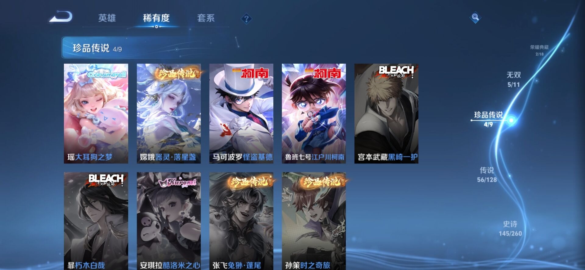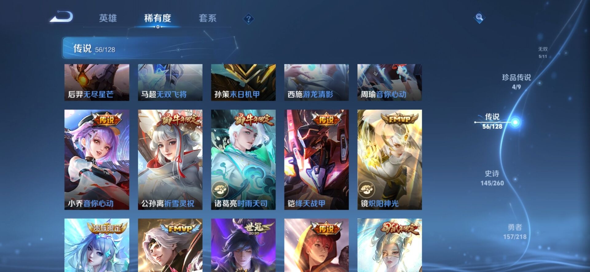 夏侯惇霜北刀,黄忠烈魂,甄姬幽恒,铠青龙志,盾山梦圆繁星,伽罗太华,赵云百木心枪,干将莫邪冰霜恋舞曲,典韦岱宗,不知火舞绯月行,牛魔奔雷神使,项羽霸王别姬,后羿无尽星芒,吕布御风骁将,后羿如梦令,后羿辉光之辰,庄周玄嵩,诸葛亮时雨天司,公孙离祈雪灵祝,司空震愿照·山河定,裴擒虎李小龙,上官婉儿梁祝,李白诗剑行,安琪拉魔法小厨娘,马可波罗山海·玄木吟,马可波罗深海之息,桑启鸣野蒿,女娲愿照·千秋盛,芈月白晶晶,孙悟空至尊宝,百里玄策白虎志,赵云引擎之心,妲己愿照·众生和,百里守约朱雀志,蔡文姬愿照·福禄聚,瑶山海·碧波行,澜愿照·九州拓,虞姬霸王别姬,虞姬愿照·岁时盈,娜可露露前尘镜,王昭君凤凰于飞,嫦娥如梦令,橘右京枫霜尽