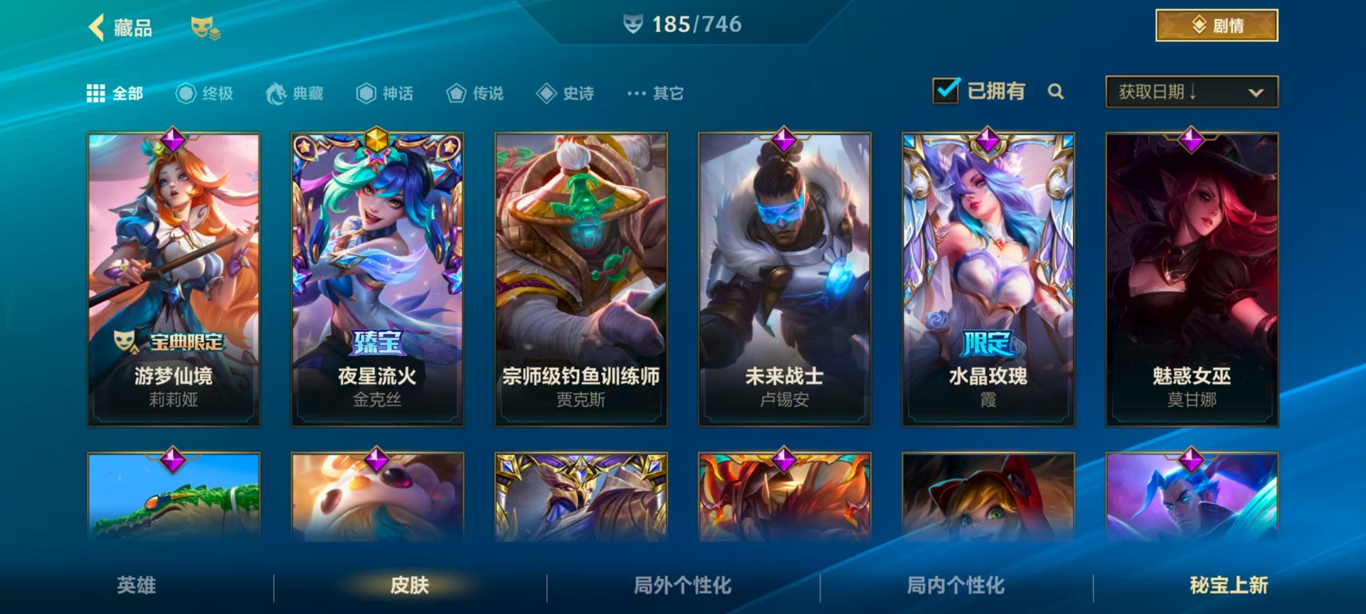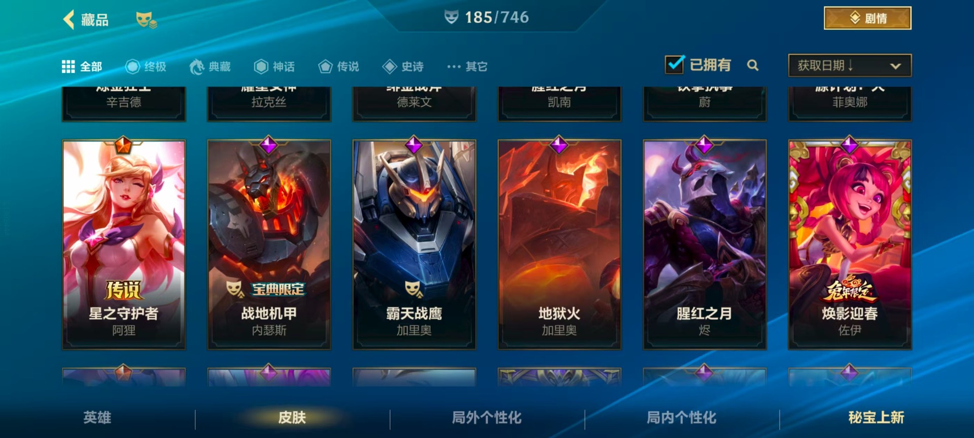 - [12126924]1橙皮 1紫皮 13皮肤 20英雄 40卡面 130已用源晶 黄金 优质装备:狂徒-盖亚的复仇,威龙之刃
