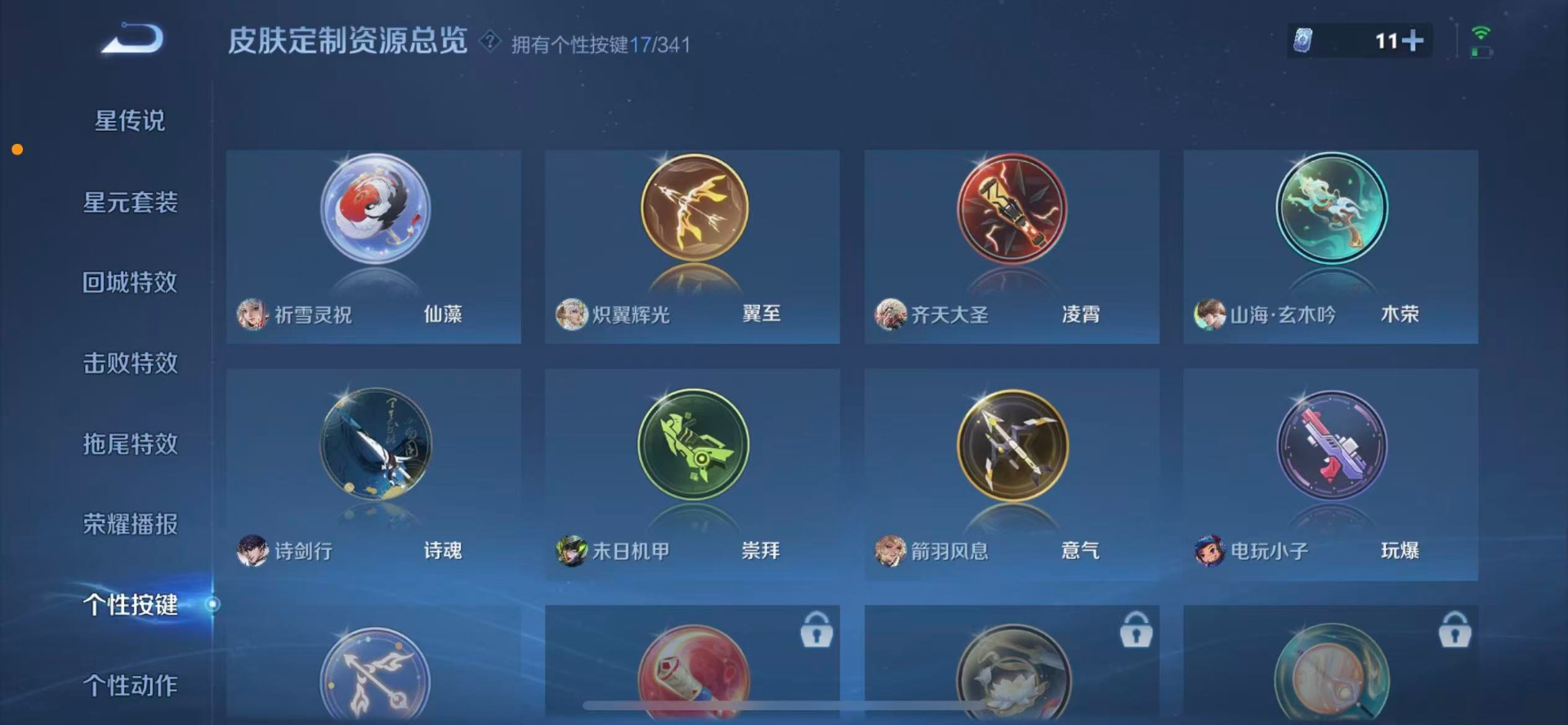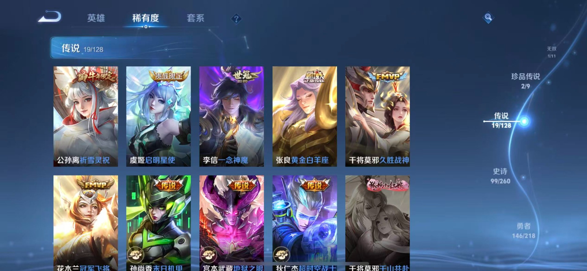 大乔猫狗日记,刘邦德古拉伯爵,夏侯惇乘风破浪,阿轲节奏热浪,铠曙光守护者,曹操幽灵船长,廉颇地狱岩魂,伽罗箭羽风息,小乔缤纷独角兽,小乔青蛇,孙尚香时之恋人,孙策猫狗日记,不知火舞魅语,赵怀真器灵·浮梦炉,鲁班七号电玩小子,项羽苍穹之光,吕布圣诞狂欢,露娜紫霞仙子,吕布末日机甲,诸葛亮黄金分割率,刘禅电玩·爆裂旋风,司马懿暗渊魔法,刘禅天才门将,刘禅绅士熊喵,宫本武藏鬼剑武藏,公孙离无限星赏官,兰陵王暗隐猎兽者,貂蝉圣诞恋歌,貂蝉唤灵魅影,花木兰水晶猎龙者,夏洛特永昼,李白千年之狐,安琪拉心灵骇客,艾琳奇遇舞章,杨戬天秀·启明,西施诗语江南,白起星夜王子,亚瑟心灵战警,嬴政摇滚巨星,嬴政暗夜贵公子,程咬金功夫厨神,雅典娜冰冠公主,百里守约特工魅影,李元芳逐浪之夏,墨子龙骑士,墨子金属风暴,蔡文姬舞动绿茵,瑶遇见神鹿,澜赏金猎手,娜可露露晚萤,王昭君偶像歌手,钟馗乐园奇幻夜,橘右京修罗