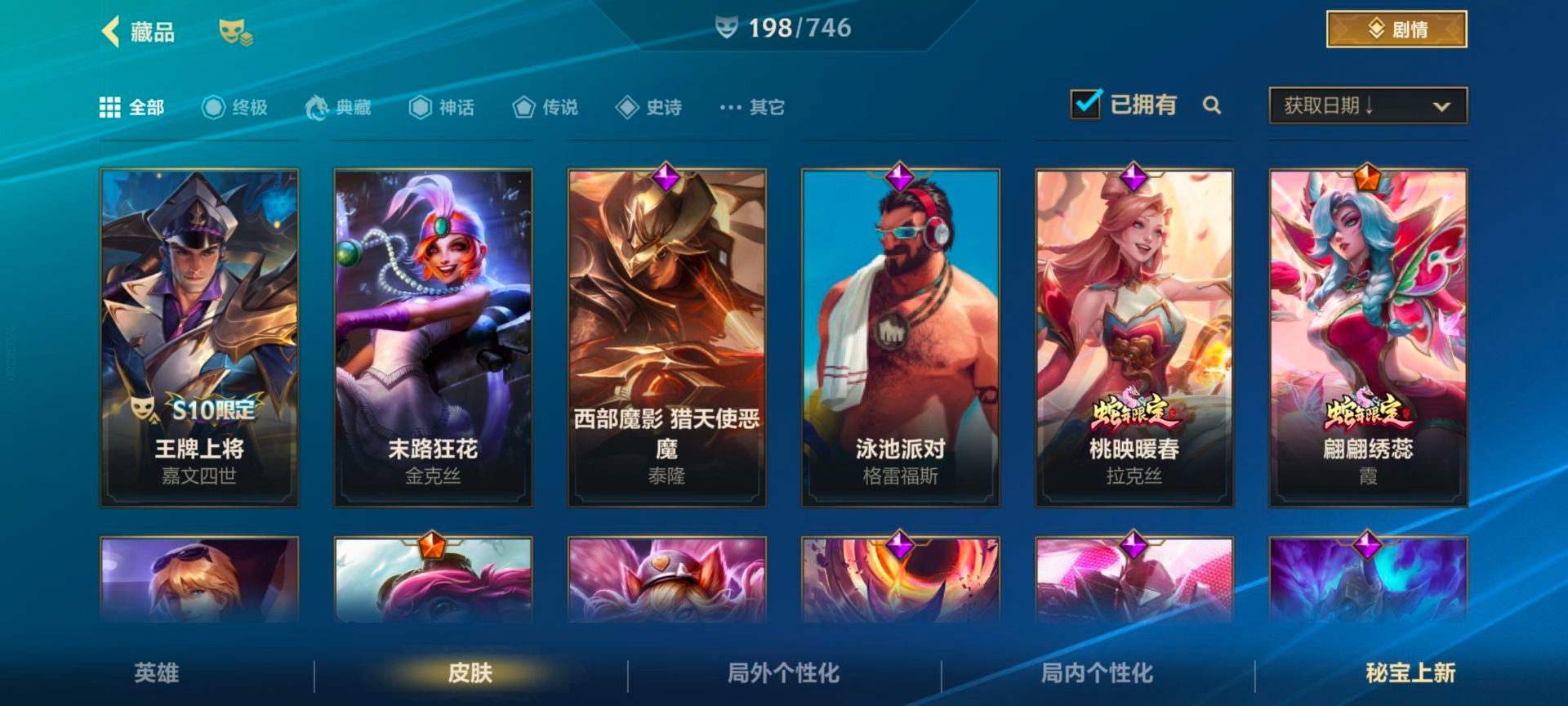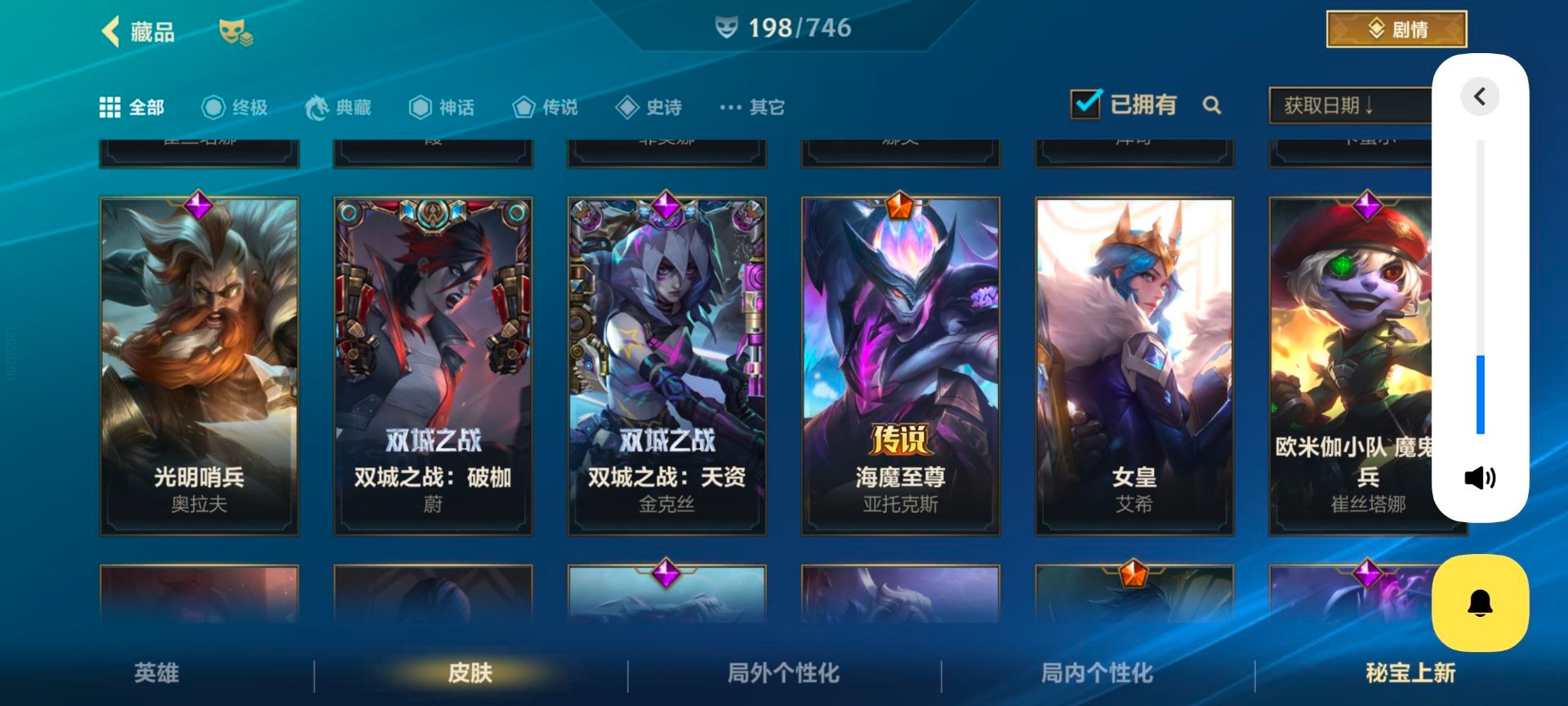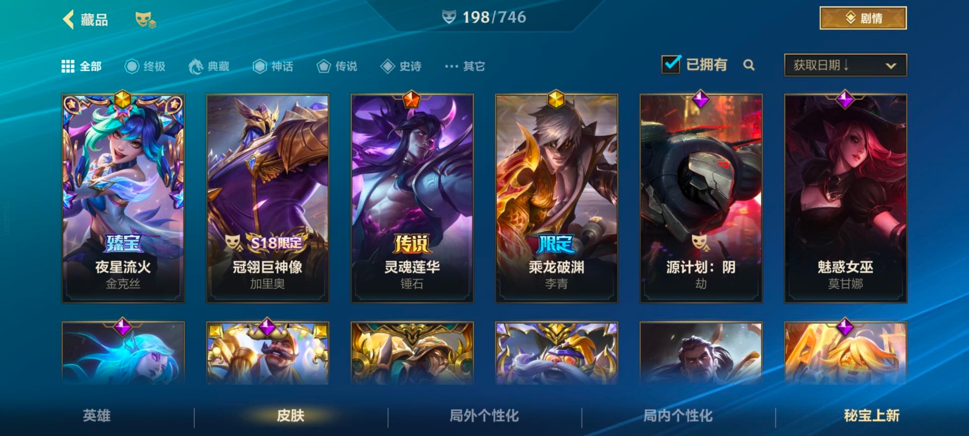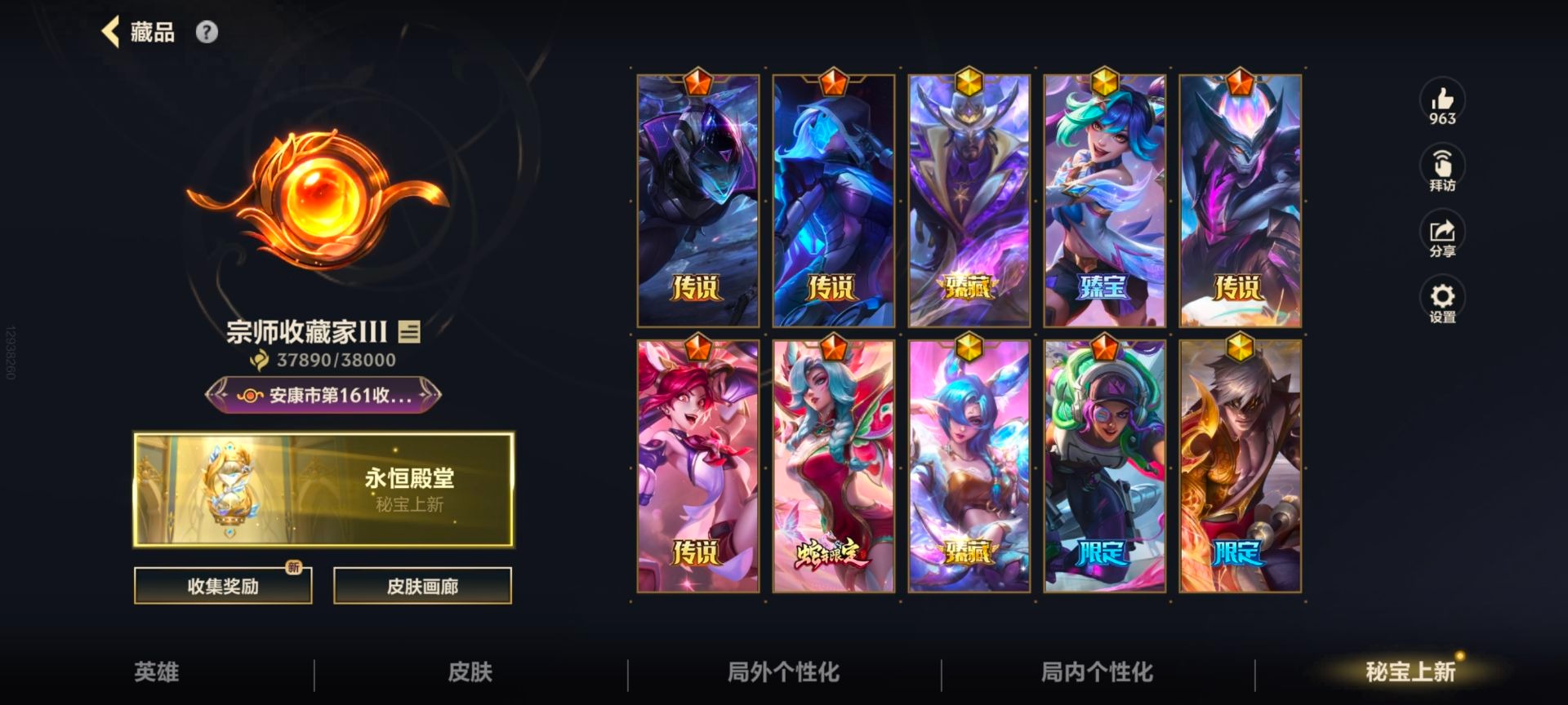 - [11884220]V6 3传说 119英雄 105皮肤 可修改实名 优质装备:一念神魔 传说皮:幻光神枪 珍宝阁皮:蔷薇恋人 限定皮:武陵仙君(小桃花),傲雪梅枪,神威(电光马子),五谷丰年,青龙志(铠年限),梁祝,李小龙,逐梦之影,匿光追影者,玉兔公主 史诗皮:化蝶舞,龙之律动,乱世虎臣,女仆咖啡,水果甜心,星夜王子,暗隐猎兽者,鬼剑武藏,地狱岩魂,纤云弄巧,拒霜思,乘风破浪,逐浪之夏,圣诞恋歌,鹰眼统帅,未来纪元-赵云