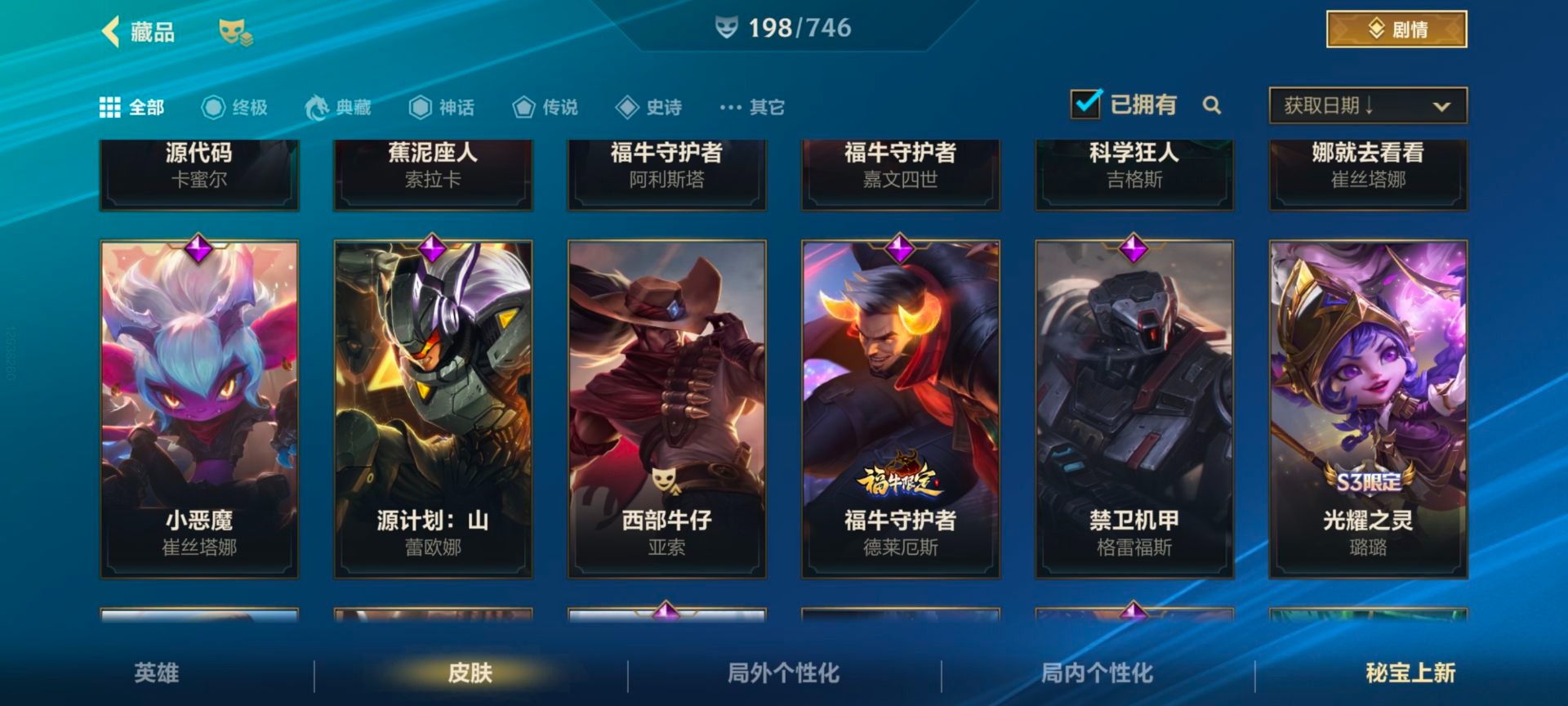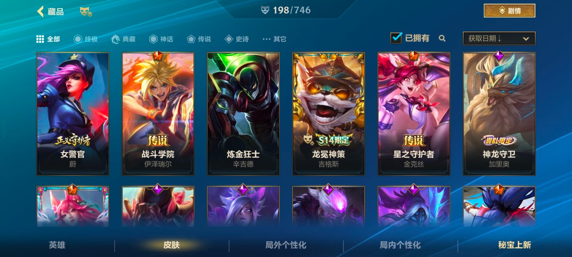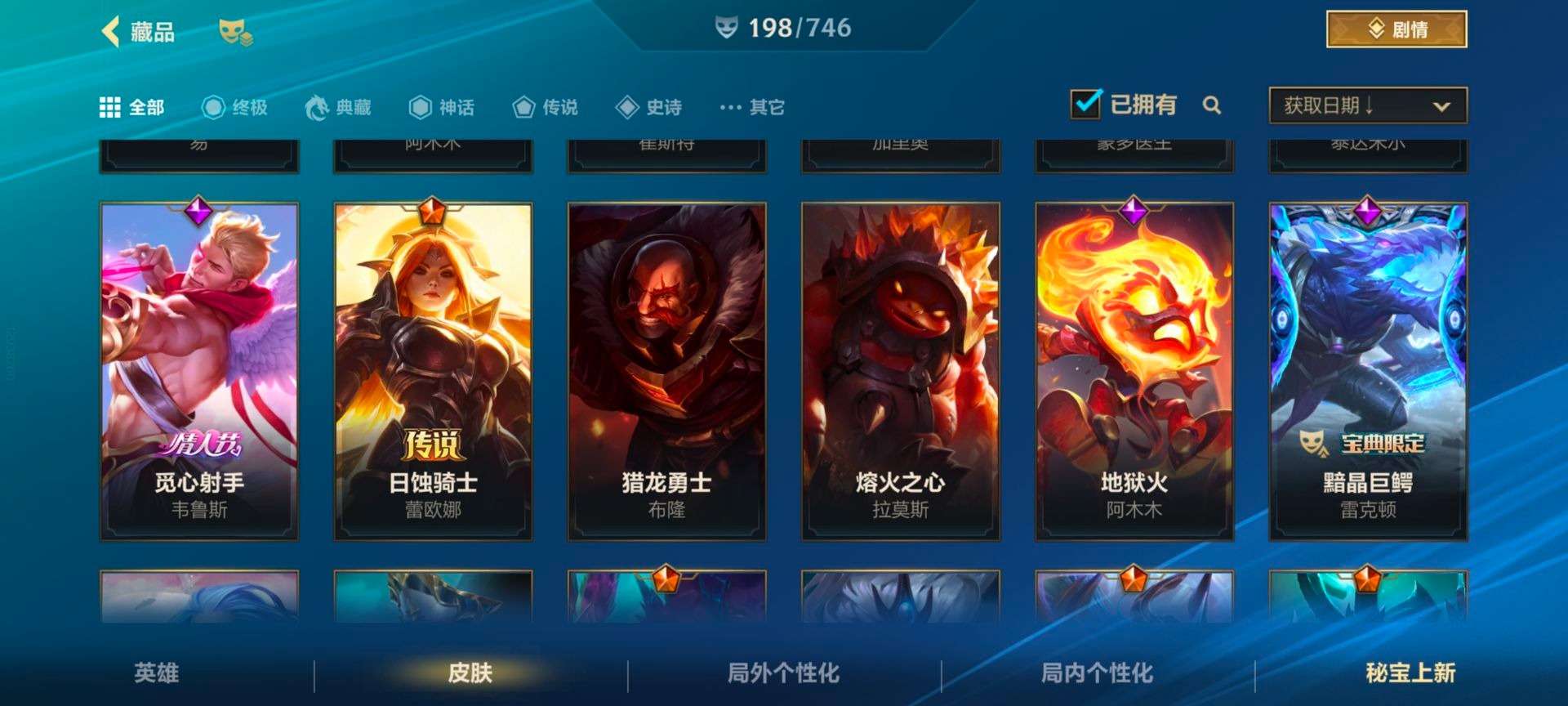- [11884220]V6 3传说 119英雄 105皮肤 可修改实名 优质装备:一念神魔 传说皮:幻光神枪 珍宝阁皮:蔷薇恋人 限定皮:武陵仙君(小桃花),傲雪梅枪,神威(电光马子),五谷丰年,青龙志(铠年限),梁祝,李小龙,逐梦之影,匿光追影者,玉兔公主 史诗皮:化蝶舞,龙之律动,乱世虎臣,女仆咖啡,水果甜心,星夜王子,暗隐猎兽者,鬼剑武藏,地狱岩魂,纤云弄巧,拒霜思,乘风破浪,逐浪之夏,圣诞恋歌,鹰眼统帅,未来纪元-赵云