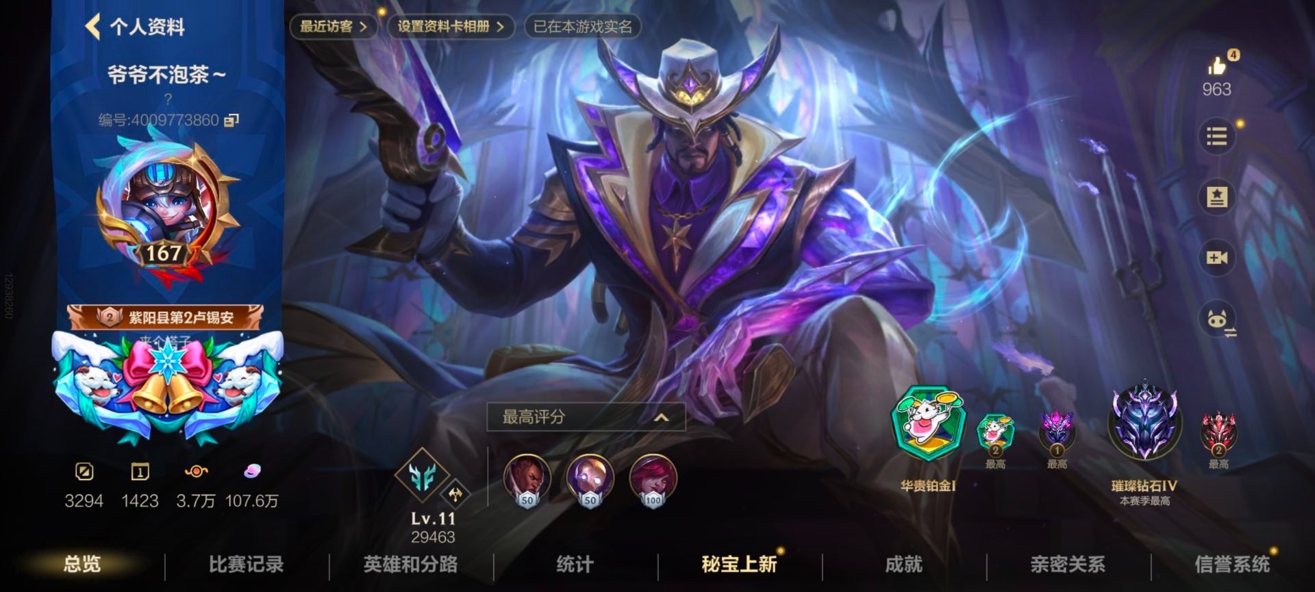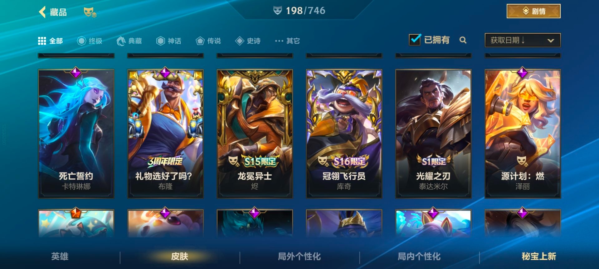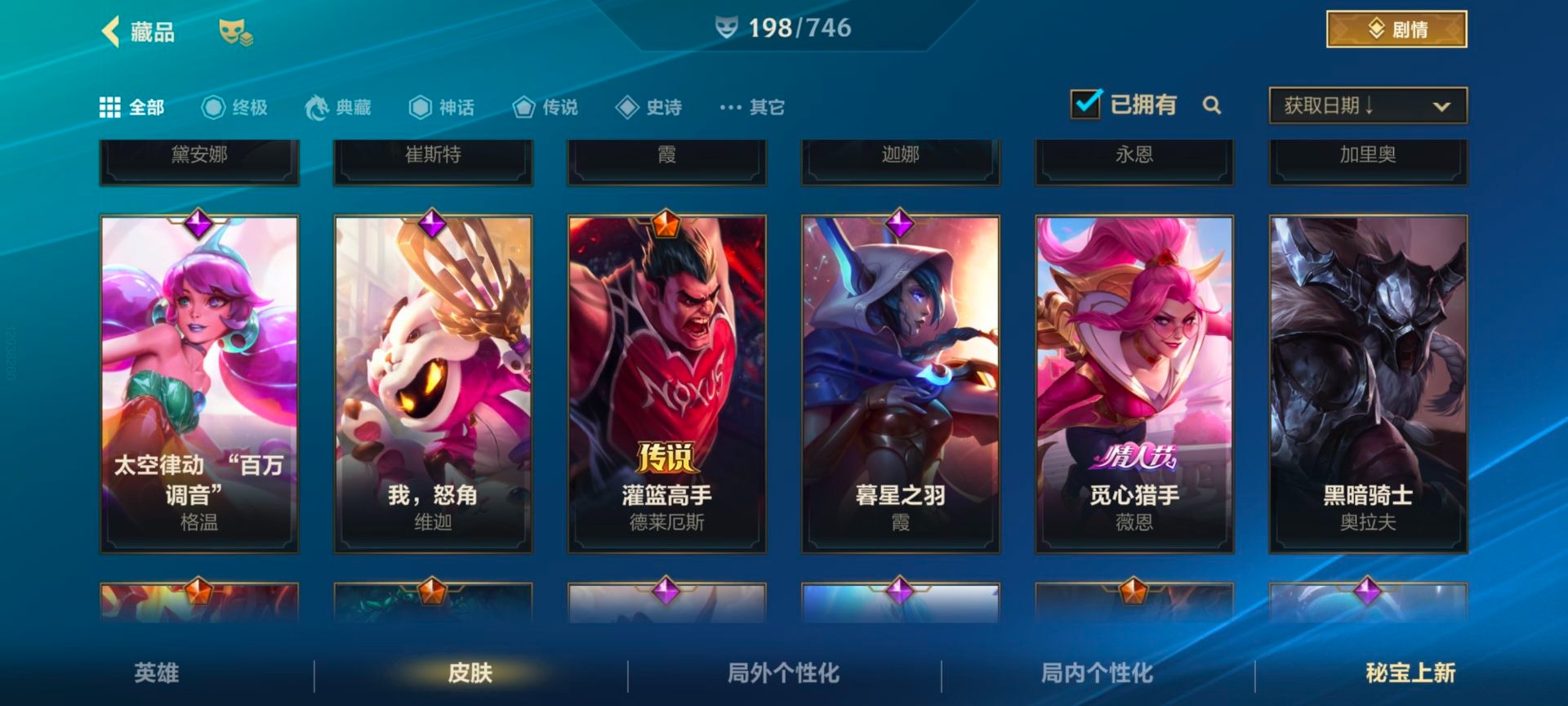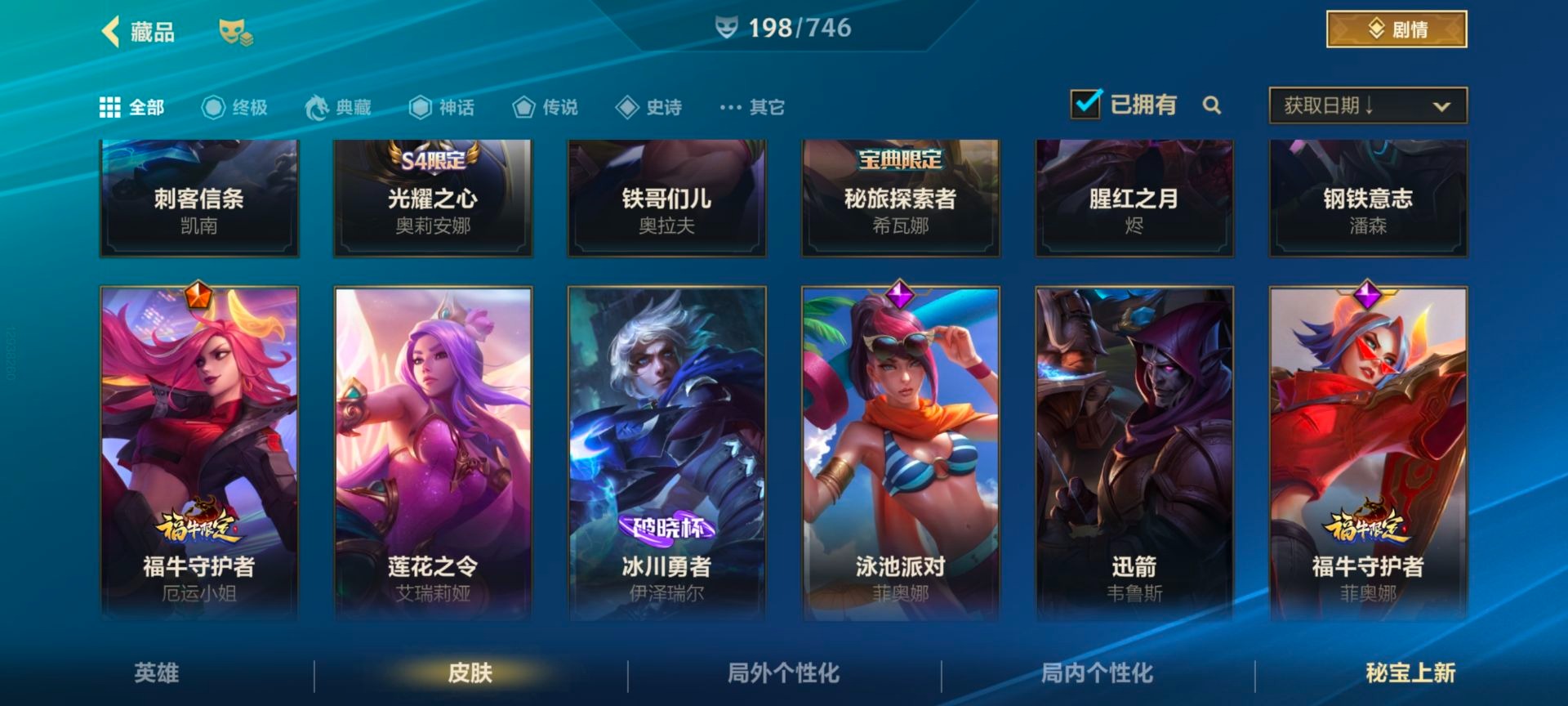 - [11884220]V6 3传说 119英雄 105皮肤 可修改实名 优质装备:一念神魔 传说皮:幻光神枪 珍宝阁皮:蔷薇恋人 限定皮:武陵仙君(小桃花),傲雪梅枪,神威(电光马子),五谷丰年,青龙志(铠年限),梁祝,李小龙,逐梦之影,匿光追影者,玉兔公主 史诗皮:化蝶舞,龙之律动,乱世虎臣,女仆咖啡,水果甜心,星夜王子,暗隐猎兽者,鬼剑武藏,地狱岩魂,纤云弄巧,拒霜思,乘风破浪,逐浪之夏,圣诞恋歌,鹰眼统帅,未来纪元-赵云