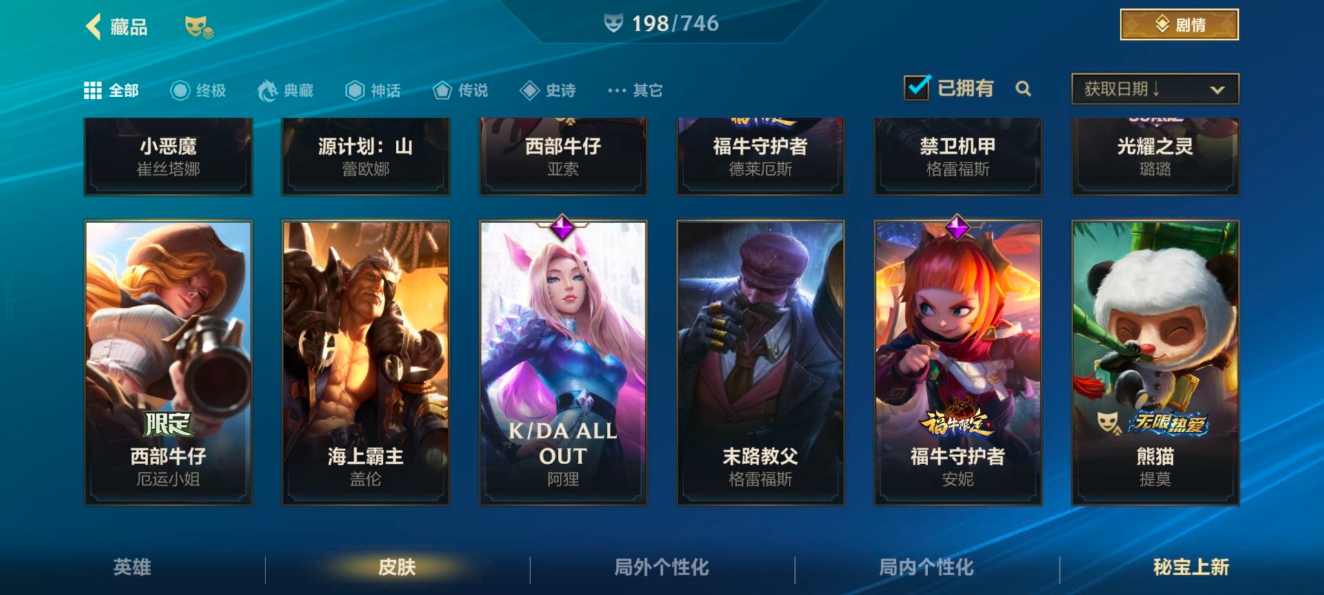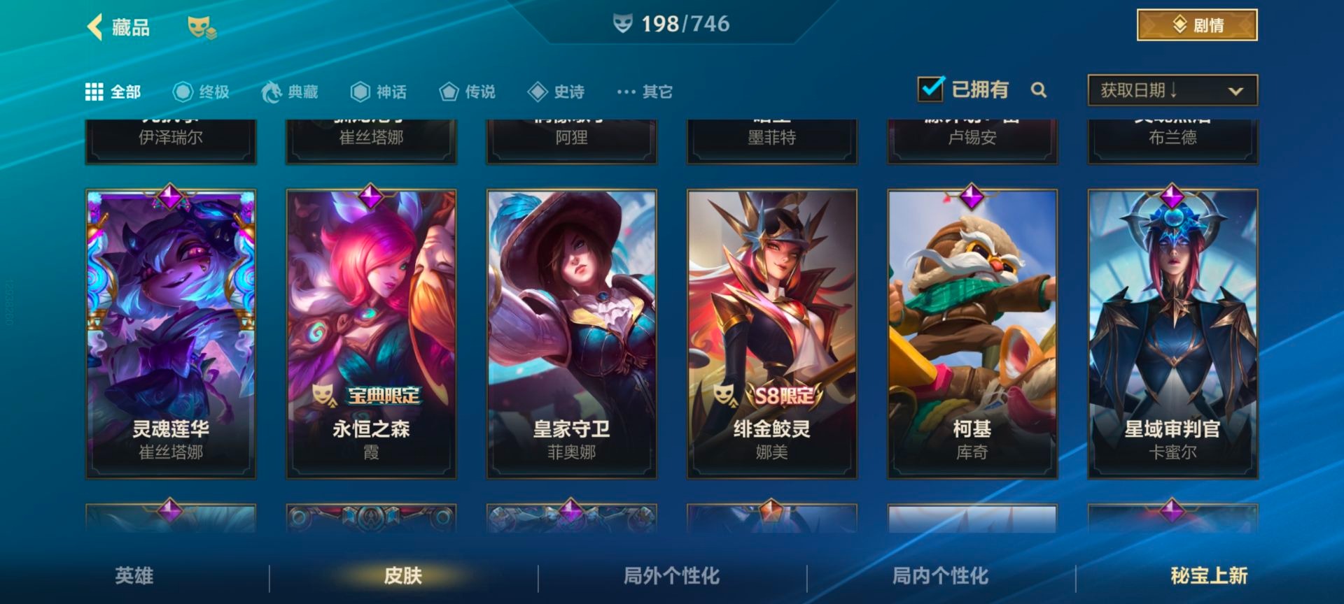 - [11227910]V8 1典藏 11传说 124英雄 304皮肤 可修改实名 荣耀水晶:星域神启(倪克斯贼亮) 传说皮:黄金射手座,零号·赤焰,地狱火,淬星耀世,超时空战士-狄仁杰,挚爱之约,燃星之曲 珍宝阁皮:优雅恋人,女武神 限定皮:鸣野蒿,至尊宝,太华(伽罗年限),玄嵩(庄周年限),齐天大圣,五谷丰年,幽恒(沐浴露),烈魂,李小龙,逐梦之影,朱雀志(守约年限),孙行者,大圣娶亲,山海·玄木吟(马可年限) 史诗皮:星界战将,龙之律动,东方月初,蒙犽顽岩魄,芈月浮光幕影,怒海争锋,蔬乡物语(鲁班七号),破空之剑,遇见神鹿,电玩小子(小书包),黄金分割率,特工魅影,千年之狐,蒙恬荣光圣徽,青蛇,偶像歌手,电玩·爆裂旋风,龙骑士(小龙虾),末日机甲-吕布,猫狗日记-孙策,猫狗日记-大乔,时之恋人-孙尚香,节奏热浪,女仆咖啡,摇滚巨星,水果甜心,绅士熊喵,天才门将,心灵骇客,功夫厨神,德古拉伯爵,暗隐猎兽者,幽灵船长,鬼剑武藏,心灵战警,地狱岩魂,纤云弄巧,繁星吟游(呼啦呼啦),缤纷独角兽,乘风破浪,逐浪之夏,水晶猎龙者,曙光守护者,箭羽风息,金属风暴,原初追逐者,圣诞狂欢,圣诞恋歌,鹰眼统帅,黎明之约,无心,未来纪元-赵云