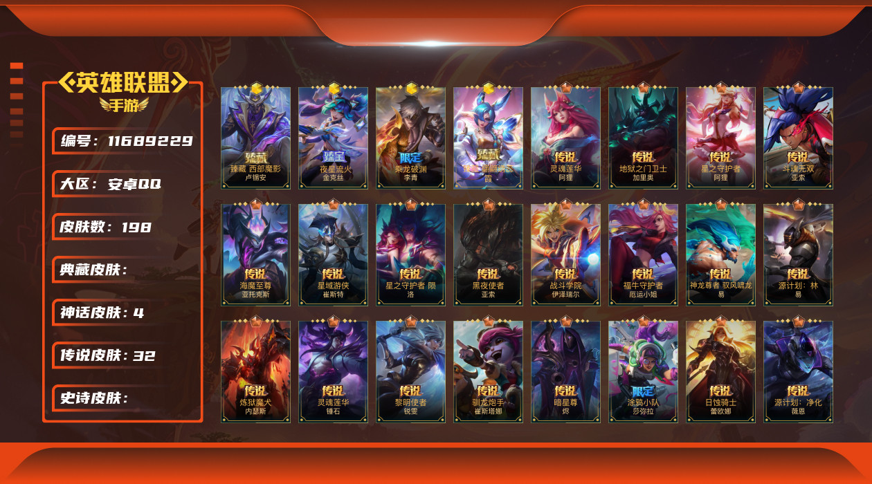 [11689229]3神话 32传说 85史诗 198皮肤 129英雄 钻石 可二次 可修改实名 优质装备:暗星尊,福牛守护者女枪,灌篮高手,光明哨兵薇恩,黑夜使者亚索,黎明使者锐雯,炼狱魔犬,欧米伽小队 幽灵特工,日蚀骑士蕾欧娜,神龙尊者 驭风啸龙,神拳盲僧,星域游侠卡牌,星之守护者金克丝,星之守护者阿狸,星之守护者 落,星之守护者 陨,驯龙炮手,源计划:净化,源计划:联合,战斗学院ez,玉剑传说 武剑仙,灵魂莲华锤石,涂鸦小队莎弥拉,源计划:林,源计划:泯灭,最终BOSS维迦,灵魂莲华阿狸 段位:钻石 神话皮:夜星流火 金克丝,臻藏西部魔影卢锡安,乘龙破渊 李青,臻藏 翩翩绣蕊 霞 限定皮肤:星之守护者霞,星之守护者洛,关羽云长,涂鸦小队莎弥拉 传说皮:太空律动机器人,翩翩绣蕊 霞,海魔至尊 亚托克斯,斗魂无双亚索,地狱之门卫士,黎明使者永恩