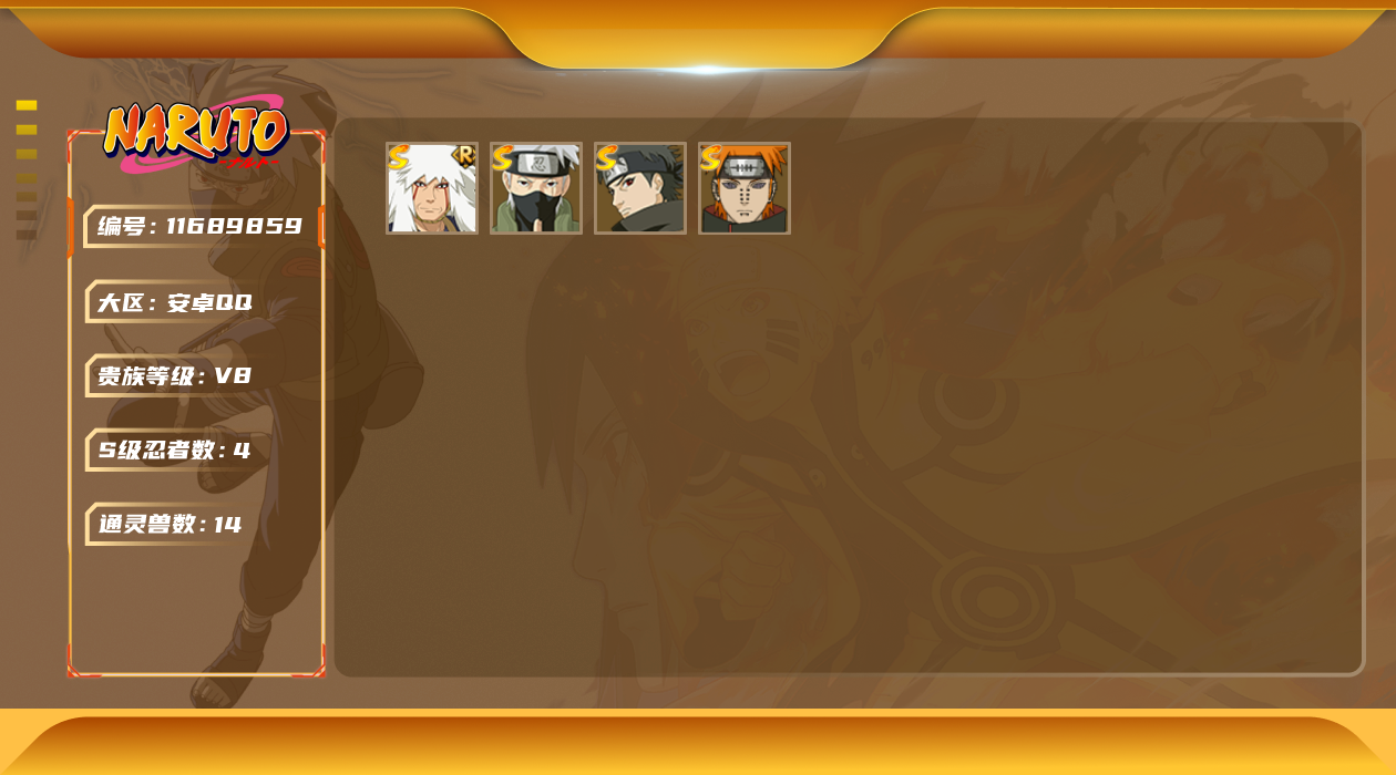 [11689859]V8 4S忍 12A忍 14通灵 446.7W战力 可二次 可修改实名 优质装备:宇智波止水「须佐能乎」,旗木卡卡西「须佐能乎」 S级忍者:自来也 「舞之豪杰」,佩恩「天道」