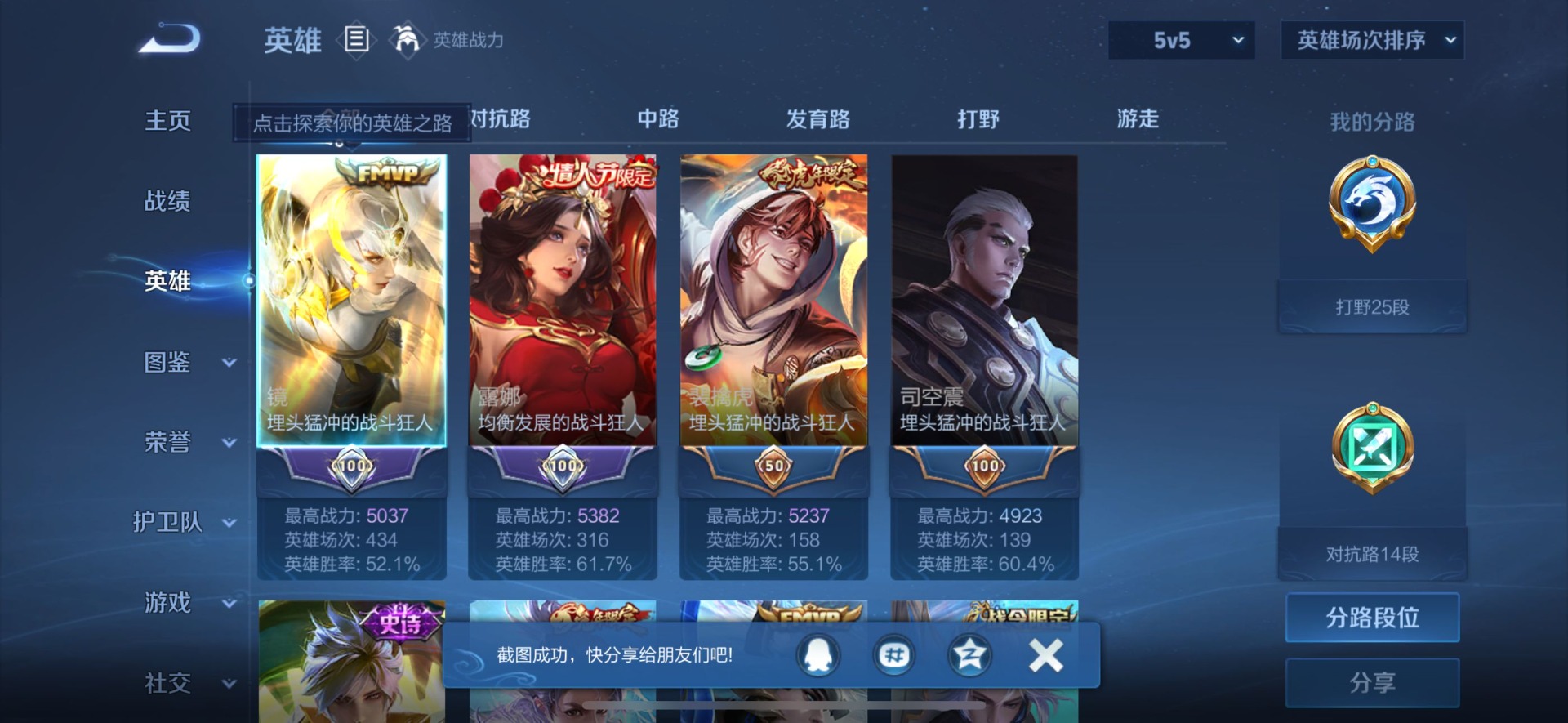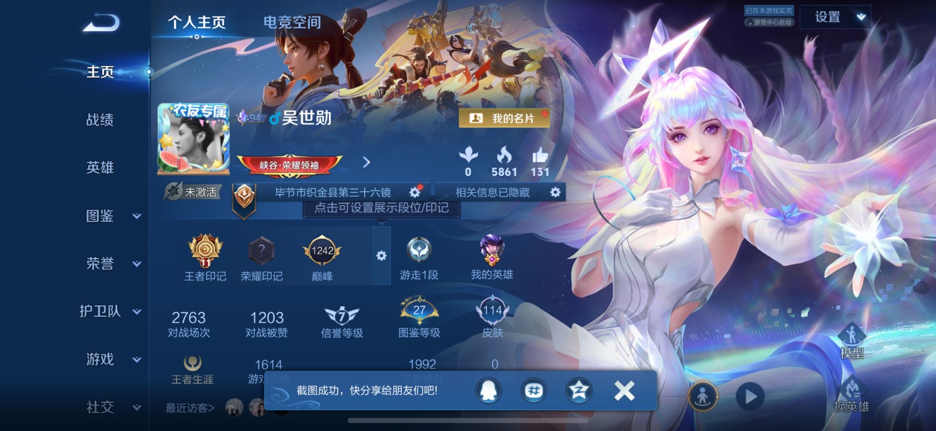 - PX_2103249-贵族等级: V6 英雄数: 124 皮肤数: 289 荣耀水晶: 星域神启 无双皮: 青丘·九尾,碎月剑心,小乔时之魔女,韩信群星魔术团 星传说: 时之愿境,金色仲夏夜,玉鸾吟 传说皮: 绛天战甲,猫影幻舞,炽阳神光,一念神魔,云霓雀翎,末日机甲-孙尚香,仲夏夜之梦,乞巧织情,游龙清影,挚爱之约,挚爱花嫁,无双飞将,记忆之芯,青丘·九尾,大乔-时之奇旅,霜月吟,乘龙·问璇玑,