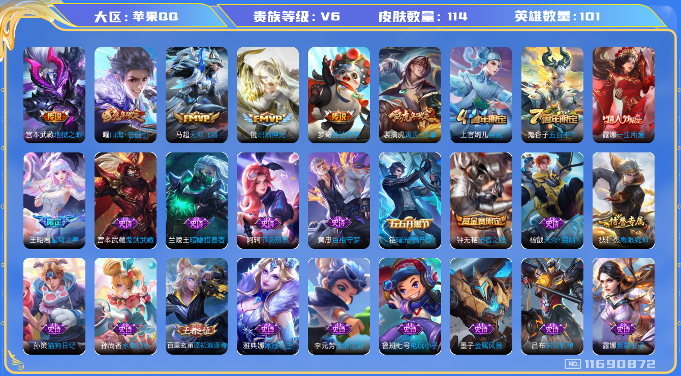 [11690872]V6 7传说 101英雄 114皮肤 可修改实名 优质装备:炽阳神光,地狱之眼,胖达荣荣,无双飞将,山海·苍雷引(电光曜子) 珍宝阁皮:胡桃夹子 限定皮:星穹之声,五谷丰年,梁祝,一生所爱,寅虎·赤拳(老虎年限) 史诗皮:鸭鸭历险记-刘禅,龙之律动,百相守梦-周瑜,百相守梦-黄忠,紫霞仙子,电玩小子(小书包),黄金分割率,蒙恬荣光圣徽,冰冠公主,偶像歌手,末日机甲-吕布,猫狗日记-孙策,节奏热浪,水果甜心,天才门将,暗隐猎兽者,鬼剑武藏,天秀·启明,逐浪之夏,曙光守护者,金属风暴,原初追逐者,鹰眼统帅,王者之锤,魅力维加斯,赏金猎手,无心