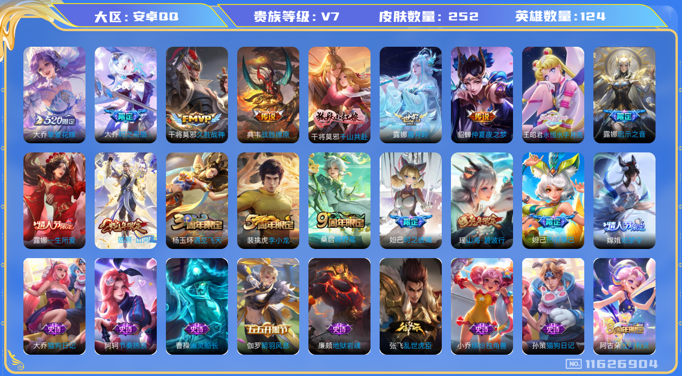 [11626904]V7 11传说 124英雄 252皮肤 可修改实名 女号 优质装备:久胜战神,仲夏夜之梦(大飞蛾),挚爱花嫁,大乔-时之奇旅,永恒水手月亮,霜月吟,千山共赴 传说皮:典韦战鼓燎原 珍宝阁皮:蔷薇恋人,女武神 限定皮:愿照·山河定(司空震年限),鸣野蒿,时之彼端,山海·碧波行(瑶年限),遇见飞天,李小龙,如梦令-嫦娥,一生所爱,热情桑巴,启示之音 史诗皮:星界战将,龙之律动,乘龙·聚宝船(安琪拉年限),织梦人,遇见神鹿,紫霞仙子,黄金分割率,特工魅影,江河有灵,百解令(蒙犽),无限星赏官,冰冠公主,偶像歌手,末日机甲-吕布,猫狗日记-孙策,猫狗日记-大乔,乱世虎臣,节奏热浪,女仆咖啡,水果甜心,天才门将,星夜王子,心灵骇客,功夫厨神,暗隐猎兽者,幽灵船长,鬼剑武藏,舞动绿茵,地狱岩魂,纤云弄巧,拒霜思,缤纷独角兽,逐浪之夏,水晶猎龙者,箭羽风息,唤灵魅影,金属风暴,圣诞狂欢,圣诞恋歌,鹰眼统帅,魅力维加斯,黎明之约,无心
