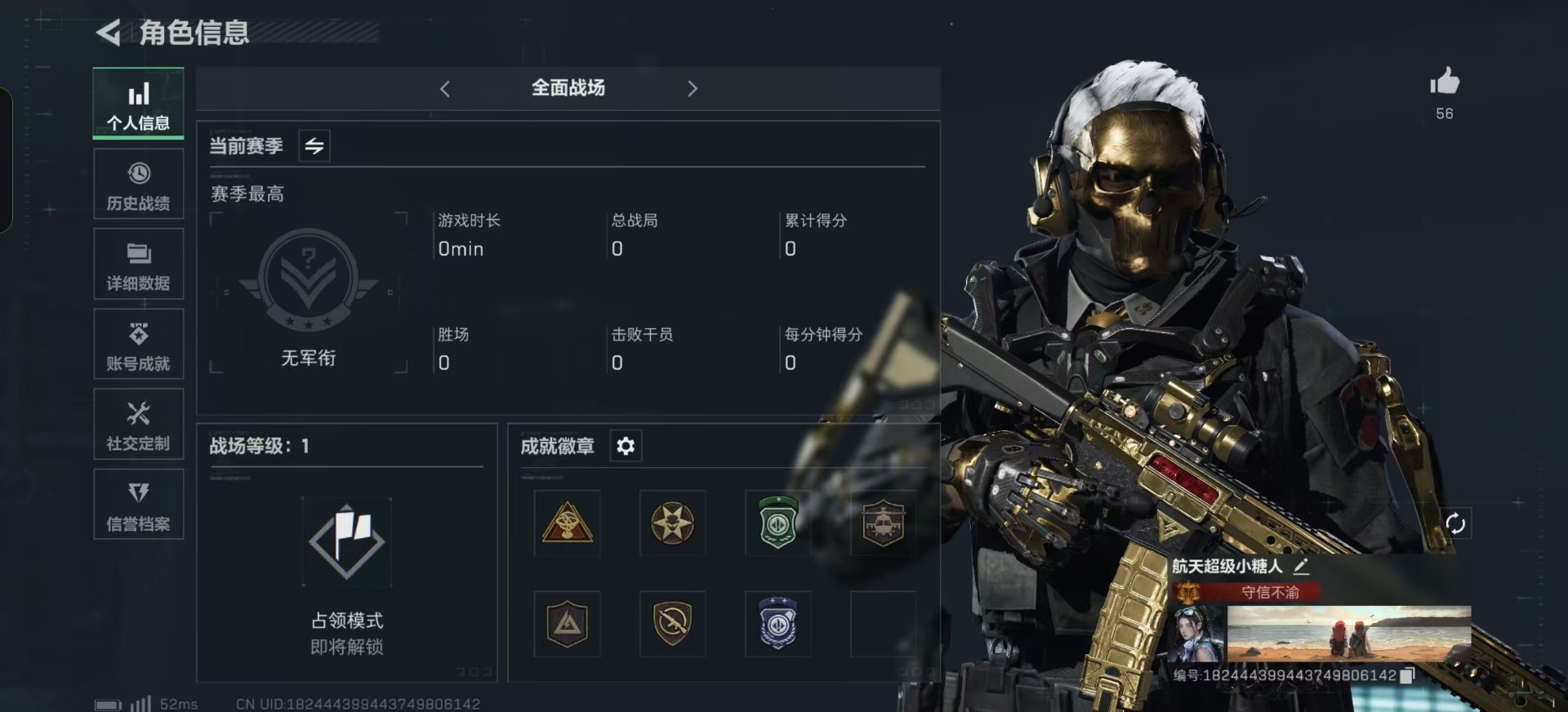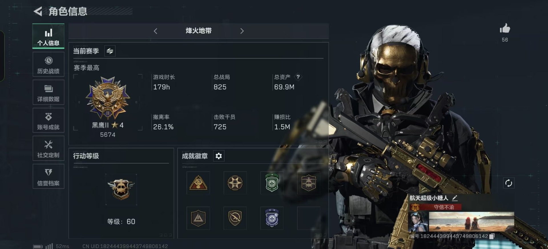 [11631915]总资产:69.9M 3干员外观 17传说枪械 哈夫币:19.595K 高级安全箱(2×3)9.15号到期 可二次 可修改实名 烽火地带段位:黑鹰 全面战场段位:无段位 传说武器皮肤:SR-25射手步枪-水墨云图,SCAR-H战斗步枪-水墨云图,SCAR-H战斗步枪-铁艺苍穹,AK-12突击步枪-夜鹰,SMG45冲锋枪-骑士,93R-捞点薯条,AWM狙击步枪-捞点薯条,腾龙突击步枪-捞点薯条,AK-12突击步枪-特斯拉线圈,SR-3M紧凑突击步枪-特斯拉线圈,UZI冲锋枪-特斯拉线圈,勇士冲锋枪-能天使-午夜邮差,复合弓-黑-天际线,M4A1突击步枪-阿米娅,725双管霰弹枪-送葬人-无题密令,M7战斗步枪-怜悯,M4A1突击步枪-蚀金玫瑰 史诗武器皮肤:AK-12突击步枪-原型机(典藏),SR-3M紧凑突击步枪-英雄,QBZ95-1突击步枪-ACE,AUG突击步枪-特勤执行,Vector冲锋枪-红色彗星,PTR-32战斗步枪-ACE,SKS射手步枪-ACE,M700狙击步枪-蝮蛇,PKM通用机枪-蝮蛇,G3战斗步枪-战场英杰,Ash-12战斗步枪-守夜人,M16A4突击步枪-竞赛选手,PKM通用机枪-守夜人,AS Val突击步枪-尖端治疗,M700狙击步枪-守夜人,SG552突击步枪-尖端治疗,SR-25射手步枪-尖端治疗,PKM通用机枪-荒野求生,勇士冲锋枪-深海恐惧,SG552突击步枪-深海恐惧,SR-3M紧凑突击步枪-荒野求生,SV-98狙击步枪-林中猎手,SVD狙击步枪-荒野求生,M250通用机枪-囚徒,SV-98狙击步枪-囚徒,SCAR-H战斗步枪-囚徒,腾龙突击步枪-无垢,MP7冲锋枪-无垢,PSG-1射手步枪-无垢,M14射手步枪-禁卫,QBZ95-1突击步枪-曙光,Vector冲锋枪-阿萨拉文明,M7战斗步枪-禁卫,PKM通用机枪-英雄,M700狙击步枪-竞技风,QSZ92G-风林火山 干员外观:红狼-蚀金玫瑰,骇爪-水墨云图,露娜-黑·天际线