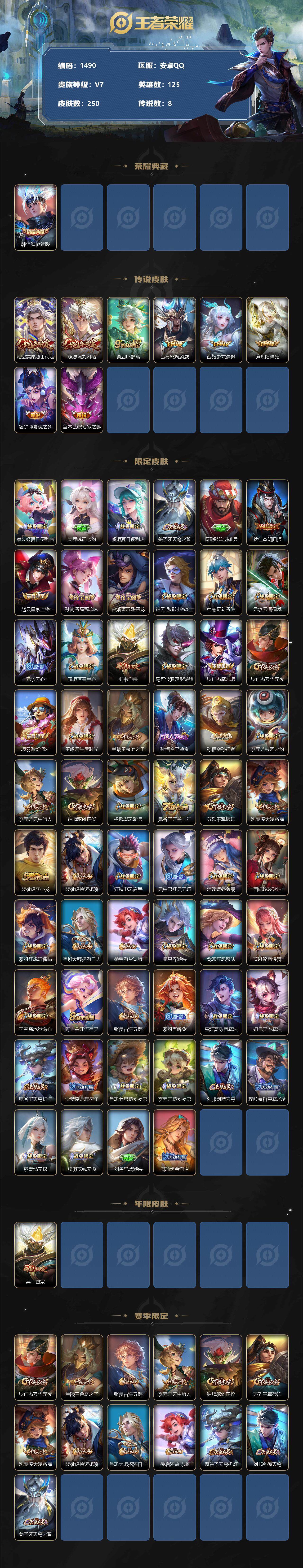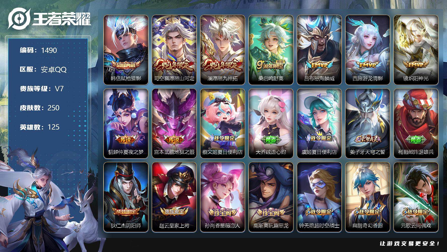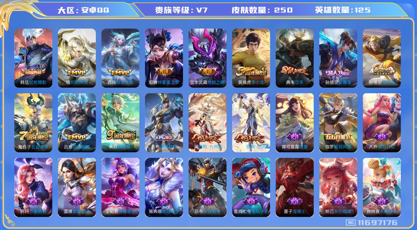 [11697176]【商品标题】:安卓Q-V7-最强王者段位-125英雄-250皮肤-1典藏-0珍品无双-0无双-0珍品传说-8传说-75史诗