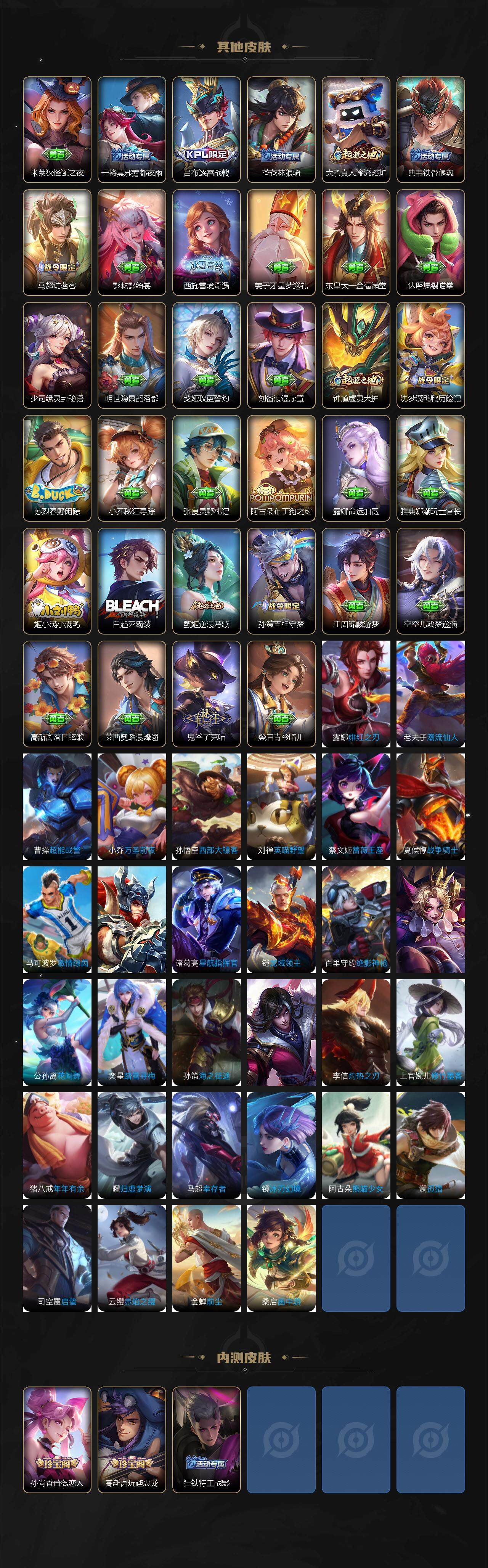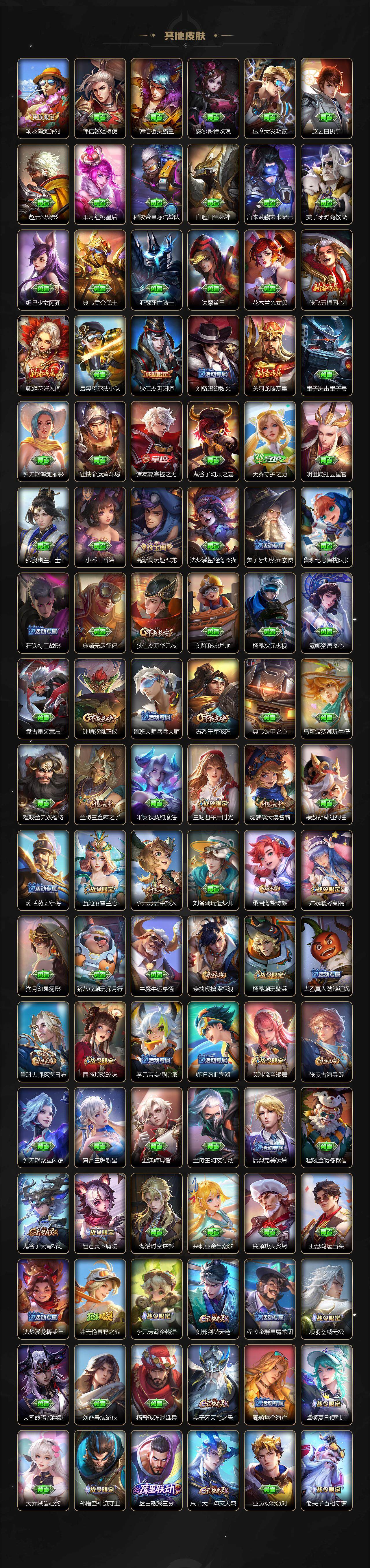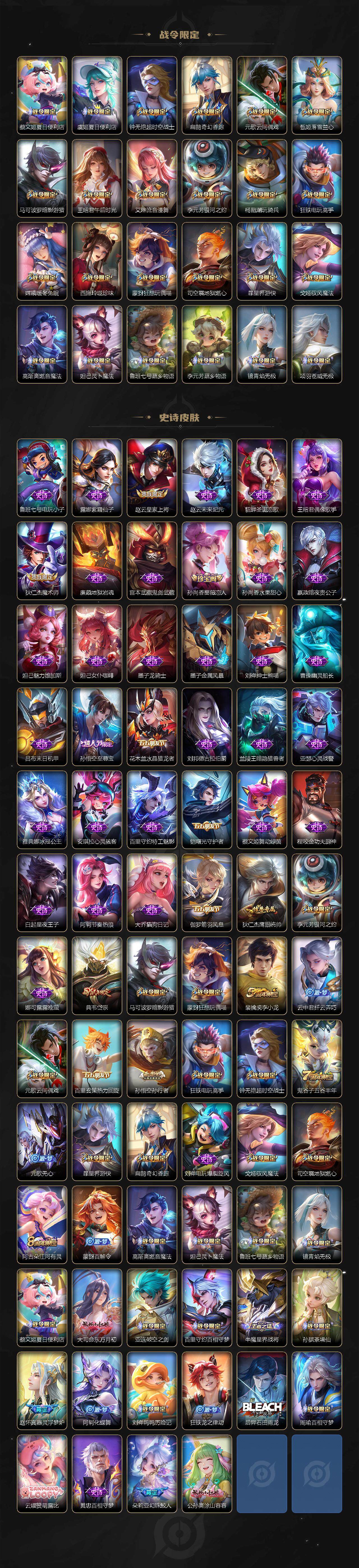 【限定皮肤】:蔡文姬夏日便利店,大乔绒语心约,虞姬夏日便利店,姜子牙天穹之誓,杨戬破阵退雄兵,狄仁杰阴阳师,赵云皇家上将,孙尚香蔷薇恋人,高渐离玩趣恶龙,钟无艳超时空战士,扁鹊奇幻香踪,元歌云间偶戏,元歌无心,甄姬落雪兰心,典韦岱宗,马可波罗暗影游猎,狄仁杰魔术师,狄仁杰万华元夜,项羽海滩派对,王昭君午后时光,兰陵王金庭之子,孙悟空至尊宝,孙悟空孙行者,李元芳银河之约,李元芳云中旅人,钟馗驱傩正仪,杨戬潮玩骑兵,鬼谷子五谷丰年,苏烈千军破阵,沈梦溪大漠名商,裴擒虎李小龙,裴擒虎擒涛扼浪,狂铁电玩高手,云中君纤云弄巧,嫦娥暖冬兔眠,西施玲珑珍味,蒙犽狂想玩偶喵,鲁班大师探海日志,桑启海盐诗旅,暃星界游侠,戈娅驭风魔法,艾琳流音漫舞,司空震地狱燃心,阿古朵江河有灵,张良古海寻踪,蒙犽百解令,高渐离燃音魔法,妲己灵卜魔法,鬼谷子天穹祈灯,沈梦溪龙舞盛年,鲁班七号蔬乡物语,李元芳蔬乡物语,刘邦剑破天穹,程咬金群星魔术团,镜青焰无极,项羽苍威无极,刘备异域游侠,周瑜熔金海岸