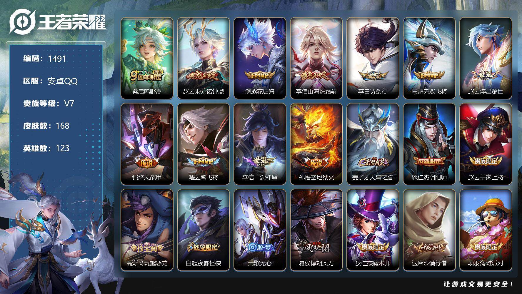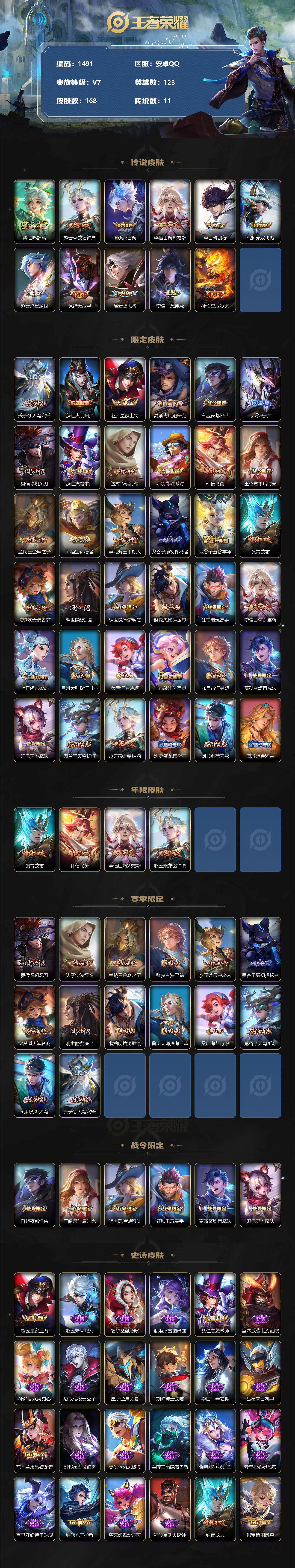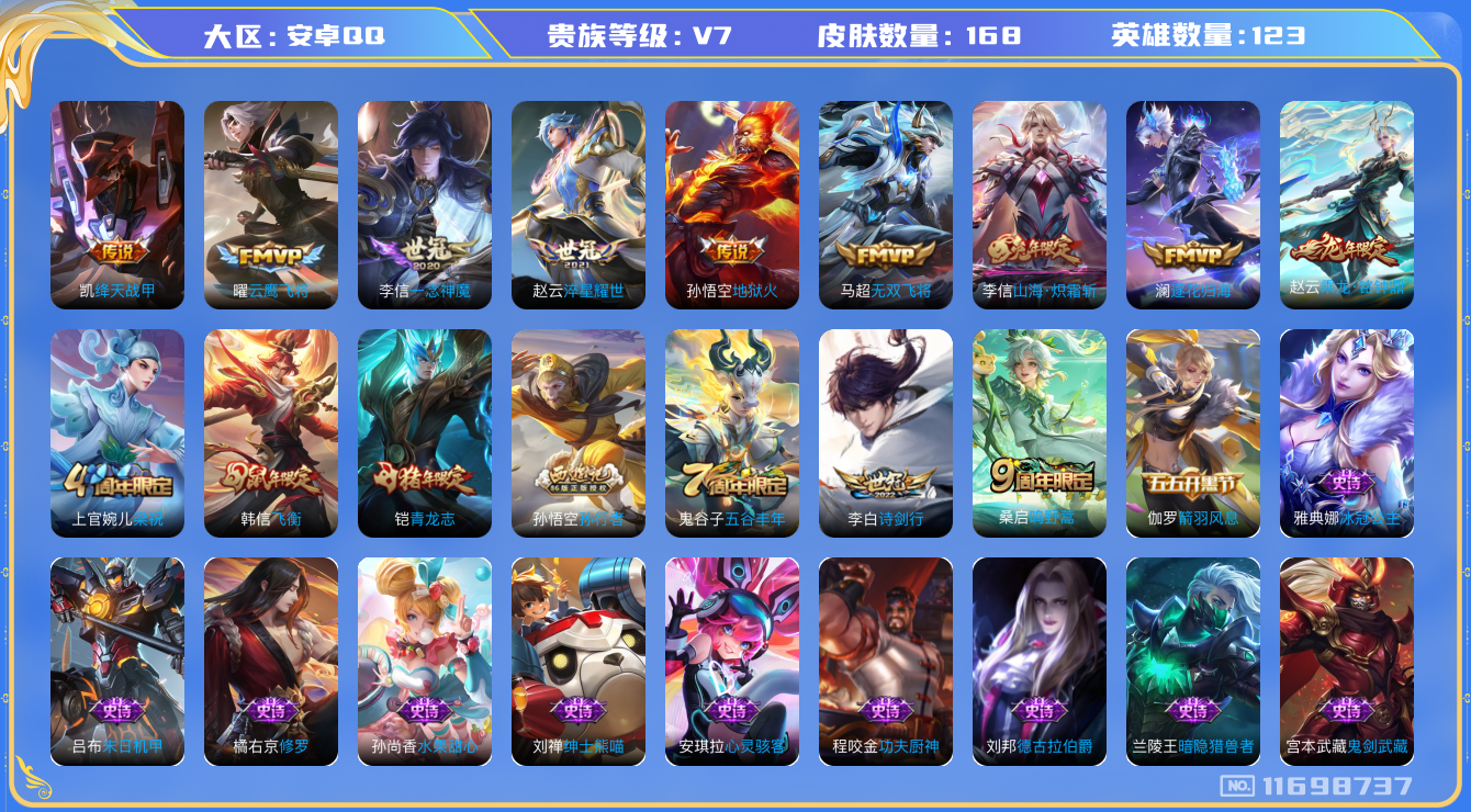 [11698737]【商品标题】:安卓Q-V7-最强王者段位-123英雄-168皮肤-0典藏-0珍品无双-0无双-0珍品传说-11传说-44史诗