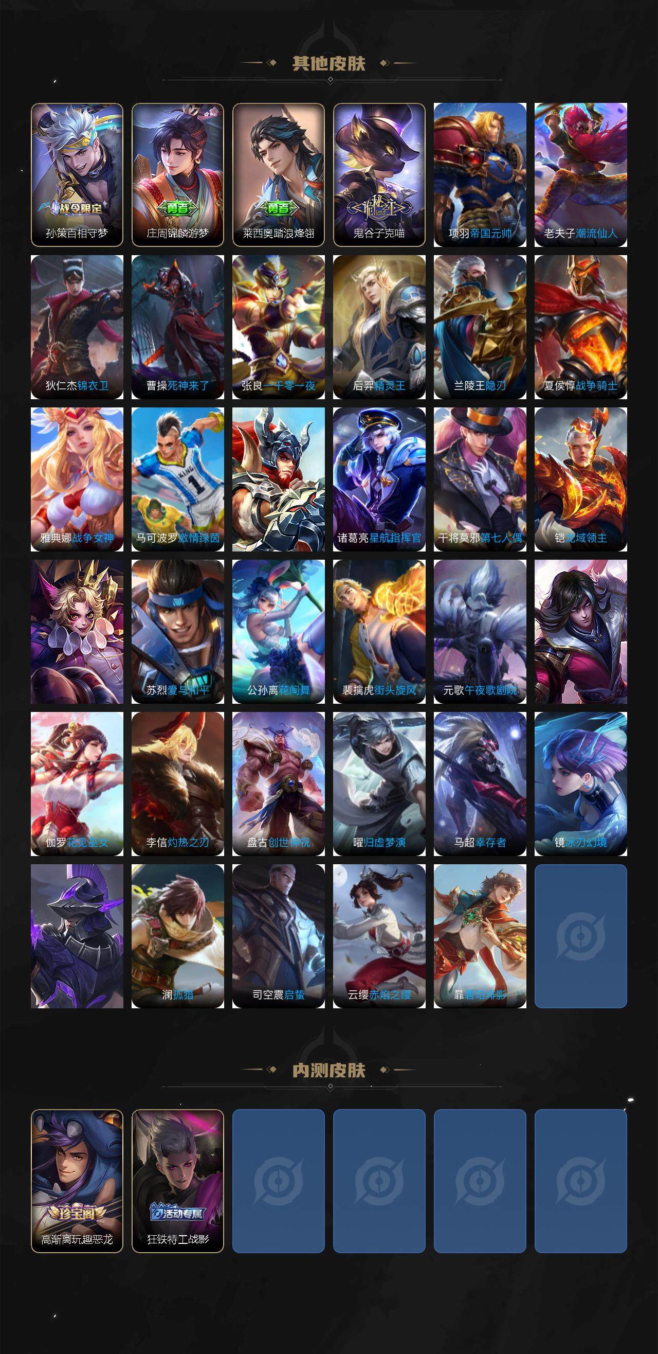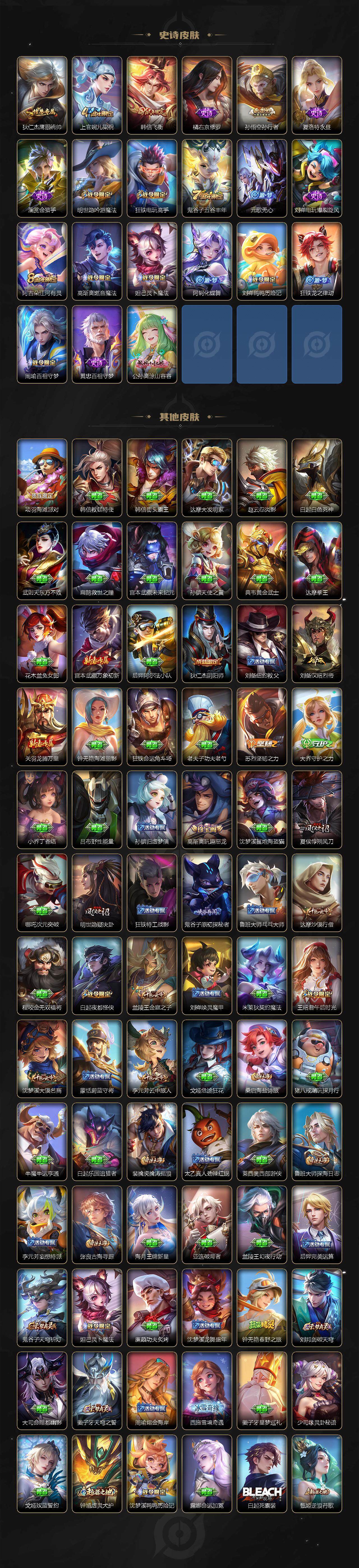 【史诗皮肤】:赵云皇家上将,赵云未来纪元,貂蝉圣诞恋歌,甄姬冰雪圆舞曲,狄仁杰魔术师,宫本武藏鬼剑武藏,孙尚香水果甜心,嬴政暗夜贵公子,墨子金属风暴,刘禅绅士熊喵,李白千年之狐,吕布末日机甲,花木兰水晶猎龙者,刘邦德古拉伯爵,夏侯惇乘风破浪,兰陵王暗隐猎兽者,雅典娜冰冠公主,安琪拉心灵骇客,百里守约特工魅影,铠曙光守护者,蔡文姬舞动绿茵,程咬金功夫厨神,铠青龙志,伽罗箭羽风息,狄仁杰鹰眼统帅,上官婉儿梁祝,韩信飞衡,橘右京修罗,孙悟空孙行者,夏洛特永昼,澜赏金猎手,明世隐吟游魔法,狂铁电玩高手,鬼谷子五谷丰年,元歌无心,刘禅电玩爆裂旋风,阿古朵江河有灵,妲己灵卜魔法,高渐离燃音魔法,阿轲化蝶舞,刘禅鸭鸭历险记,狂铁龙之律动,周瑜百相守梦,黄忠百相守梦,公孙离涂山容容