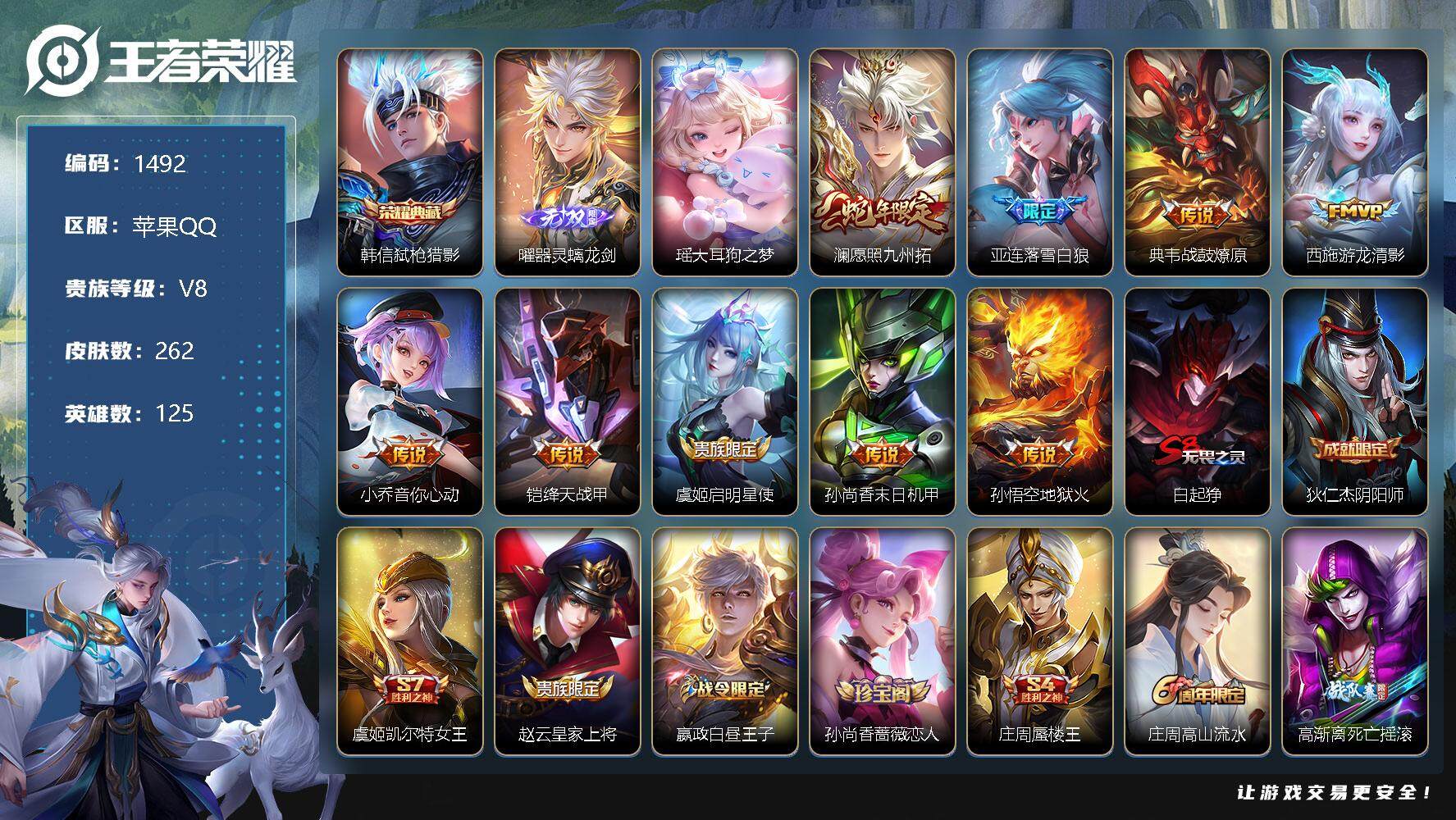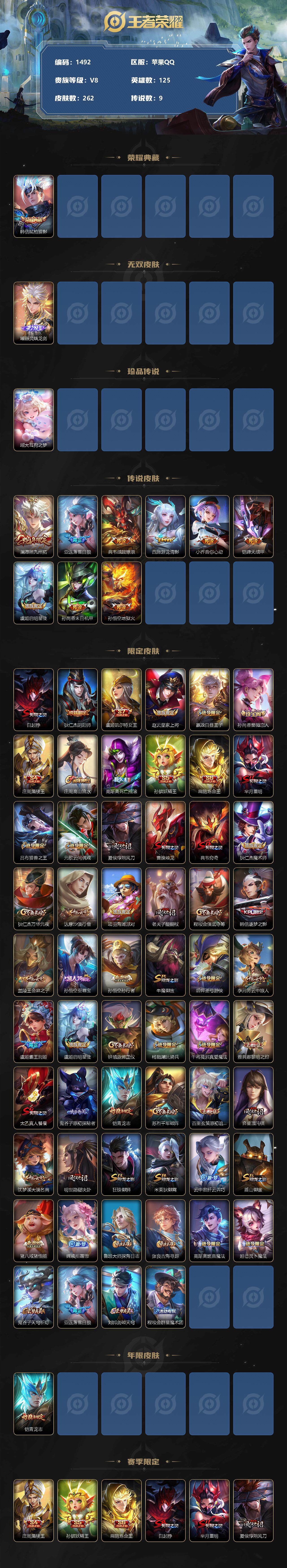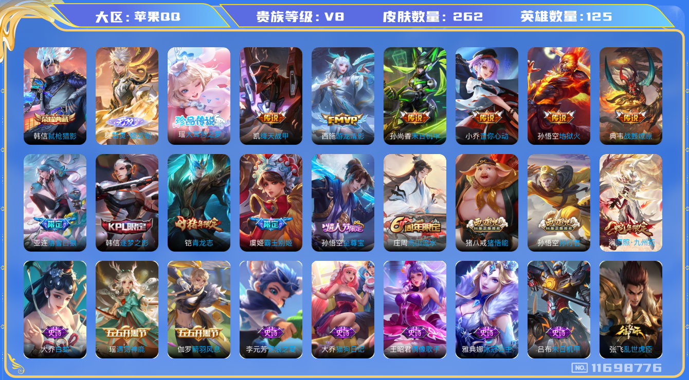 [11698776]【商品标题】:苹果Q-V8-最强王者段位-125英雄-262皮肤-1典藏-0珍品无双-1无双-1珍品传说-9传说-58史诗