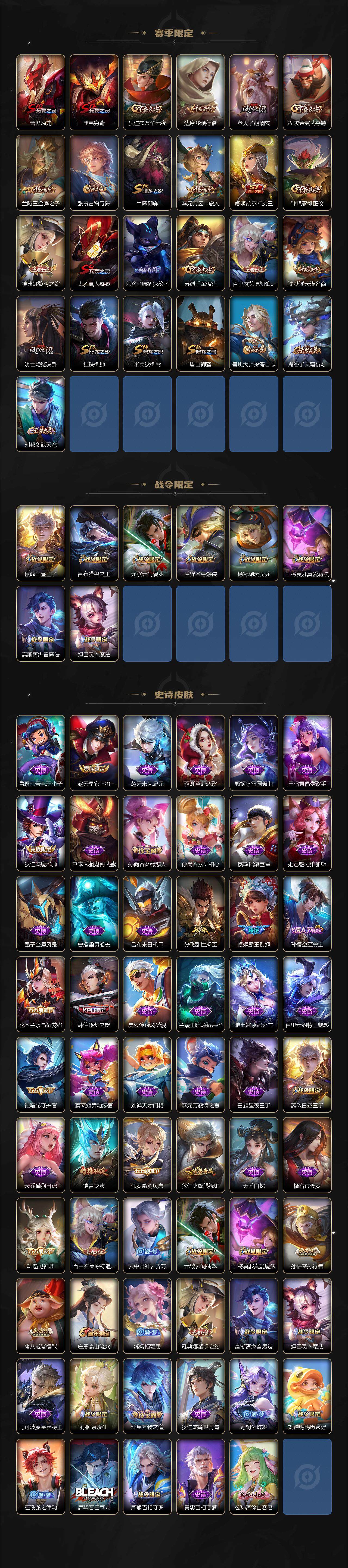 【赛季限定】:庄周蜃楼王,孙膑妖精王,扁鹊炼金王,白起狰,芈月重明,夏侯惇朔风刀,曹操烛龙,典韦穷奇,狄仁杰万华元夜,达摩沙漠行僧,老夫子醍醐杖,程咬金演武夺筹,兰陵王金庭之子,张良古海寻踪,牛魔御旌,李元芳云中旅人,虞姬凯尔特女王,钟馗驱傩正仪,雅典娜黎明之约,太乙真人饕餮,鬼谷子原初探秘者,苏烈千军破阵,百里玄策原初追逐者,弈星混沌棋,沈梦溪大漠名商,明世隐疑决卦,狂铁御狮,米莱狄御霄,盾山御銮,鲁班大师探海日志,鬼谷子天穹祈灯,刘邦剑破天穹