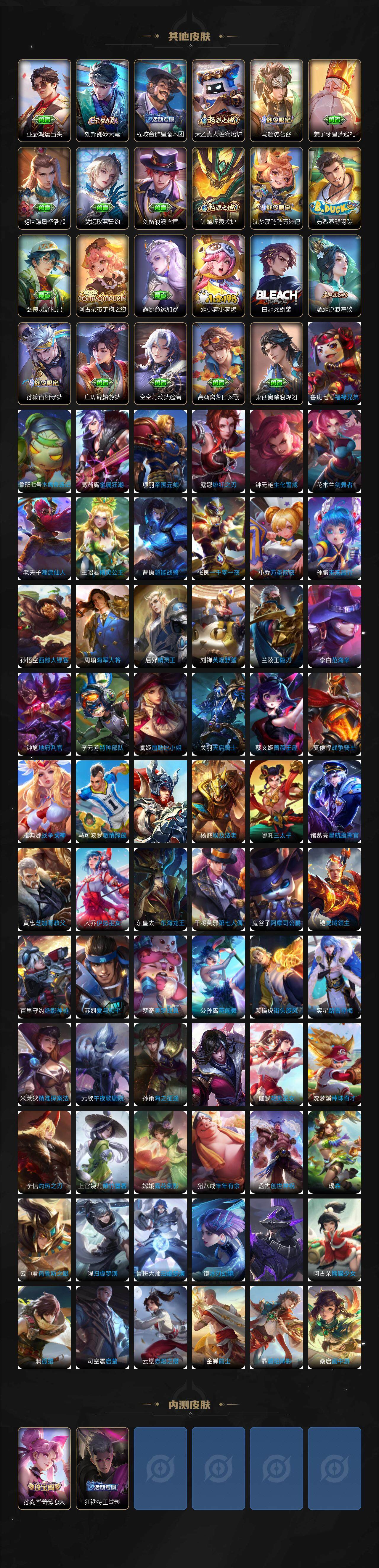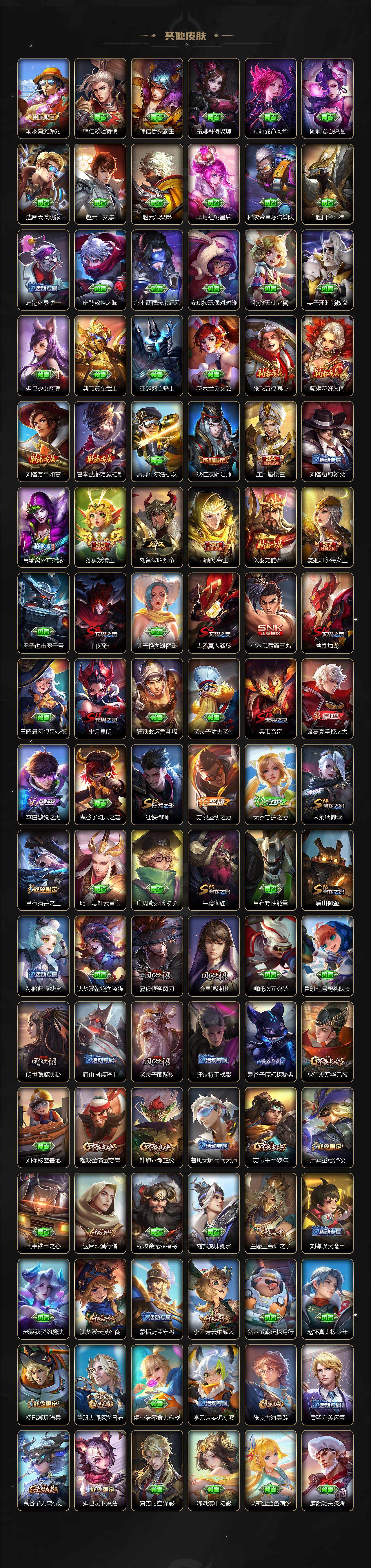 【限定皮肤】:白起狰,狄仁杰阴阳师,虞姬凯尔特女王,赵云皇家上将,嬴政白昼王子,孙尚香蔷薇恋人,庄周蜃楼王,庄周高山流水,高渐离死亡摇滚,孙膑妖精王,扁鹊炼金王,芈月重明,吕布猎兽之王,元歌云间偶戏,夏侯惇朔风刀,曹操烛龙,典韦穷奇,狄仁杰魔术师,狄仁杰万华元夜,达摩沙漠行僧,项羽海滩派对,老夫子醍醐杖,程咬金演武夺筹,韩信逐梦之影,兰陵王金庭之子,孙悟空至尊宝,孙悟空孙行者,牛魔御旌,后羿圣弓游侠,李元芳云中旅人,虞姬霸王别姬,虞姬启明星使,钟馗驱傩正仪,杨戬潮玩骑兵,干将莫邪真爱魔法,雅典娜黎明之约,太乙真人饕餮,鬼谷子原初探秘者,铠青龙志,苏烈千军破阵,百里玄策原初追逐者,弈星混沌棋,沈梦溪大漠名商,明世隐疑决卦,狂铁御狮,米莱狄御霄,云中君纤云弄巧,盾山御銮,猪八戒猪悟能,嫦娥拒霜思,鲁班大师探海日志,张良古海寻踪,高渐离燃音魔法,妲己灵卜魔法,鬼谷子天穹祈灯,亚连落雪白狼,刘邦剑破天穹,程咬金群星魔术团