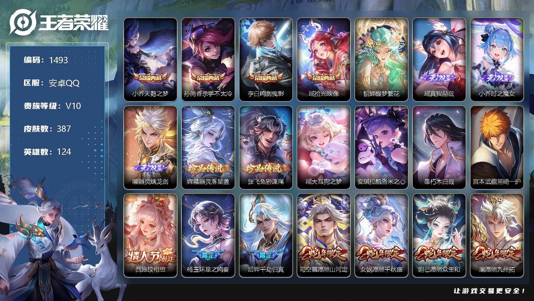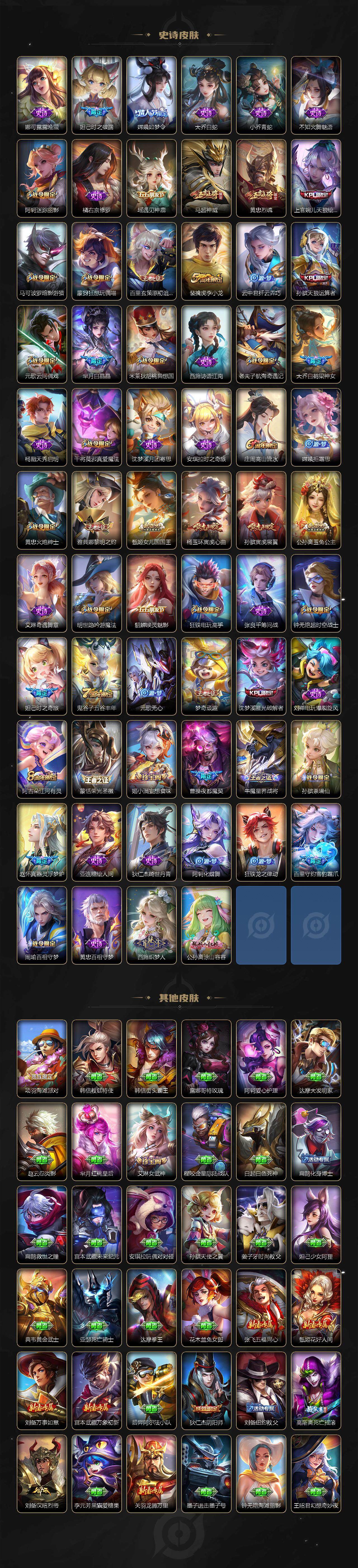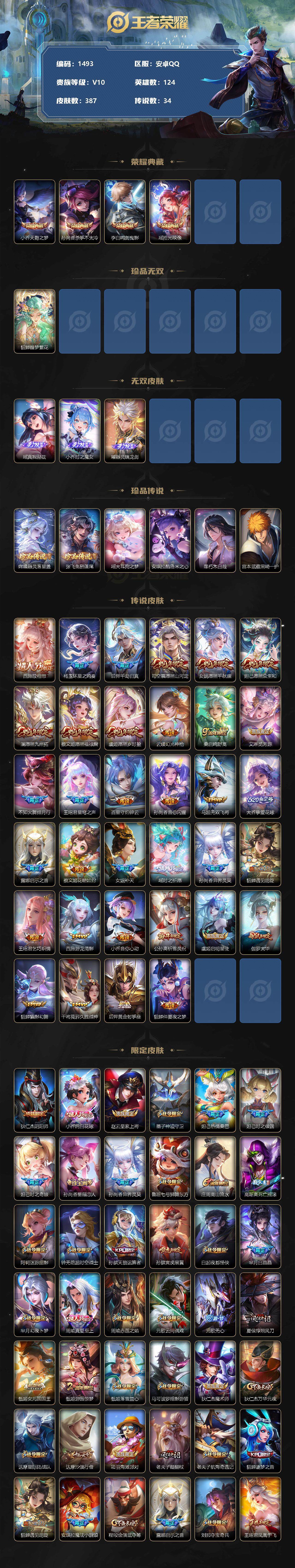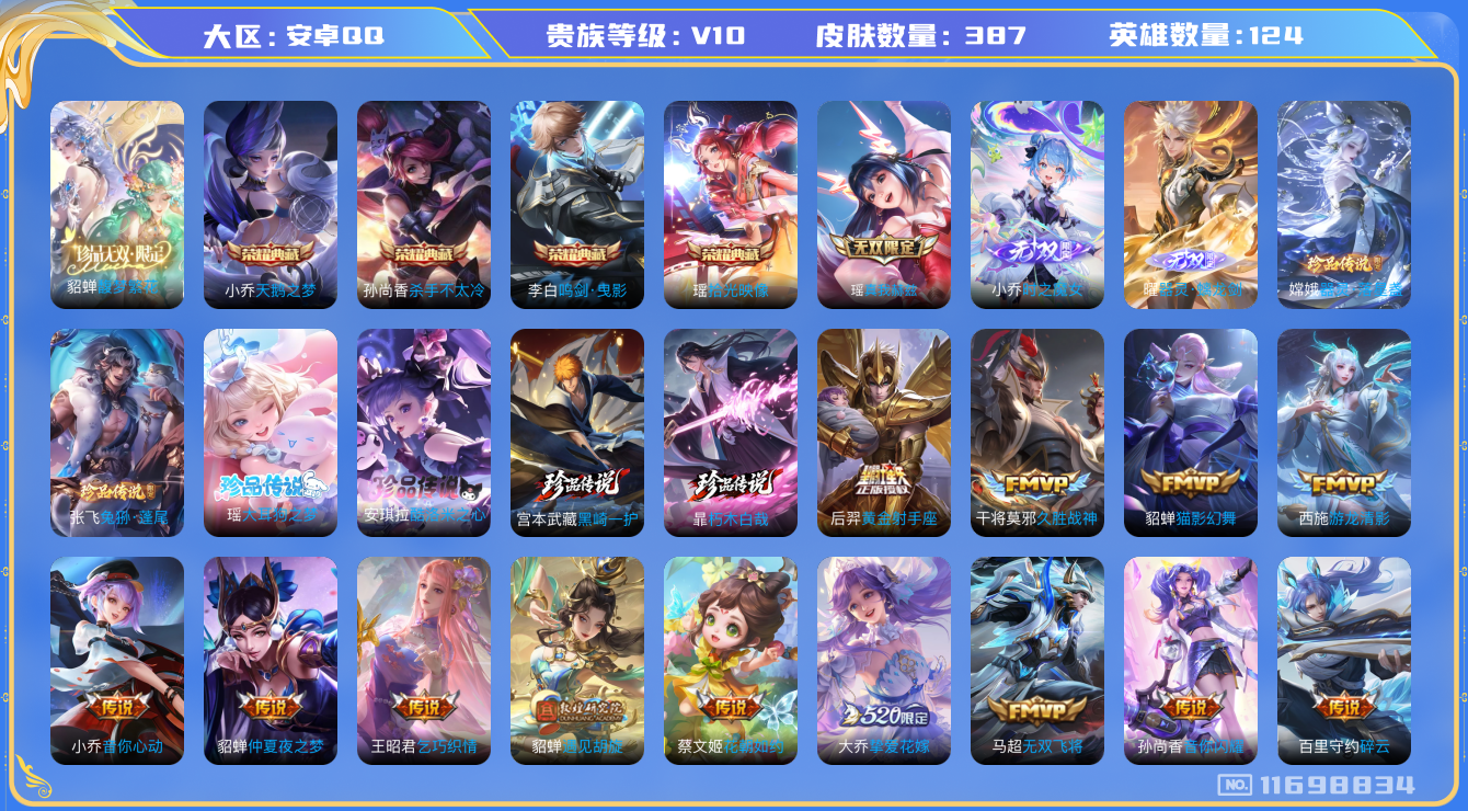 [11698834]【商品标题】:安卓Q-V10-最强王者段位-124英雄-387皮肤-4典藏-1珍品无双-3无双-6珍品传说-34传说-124史诗