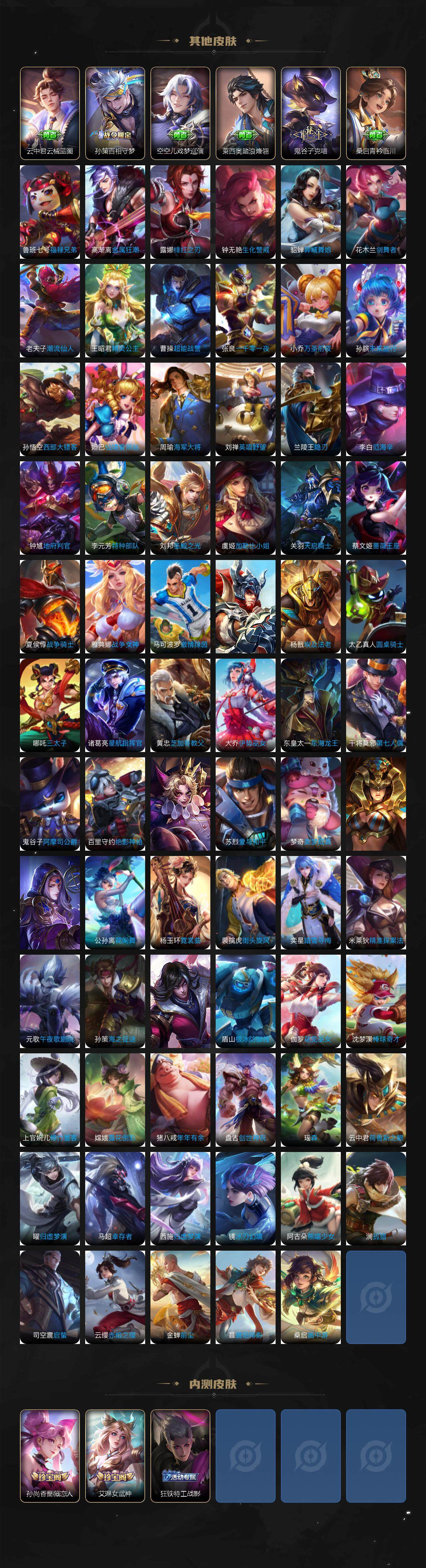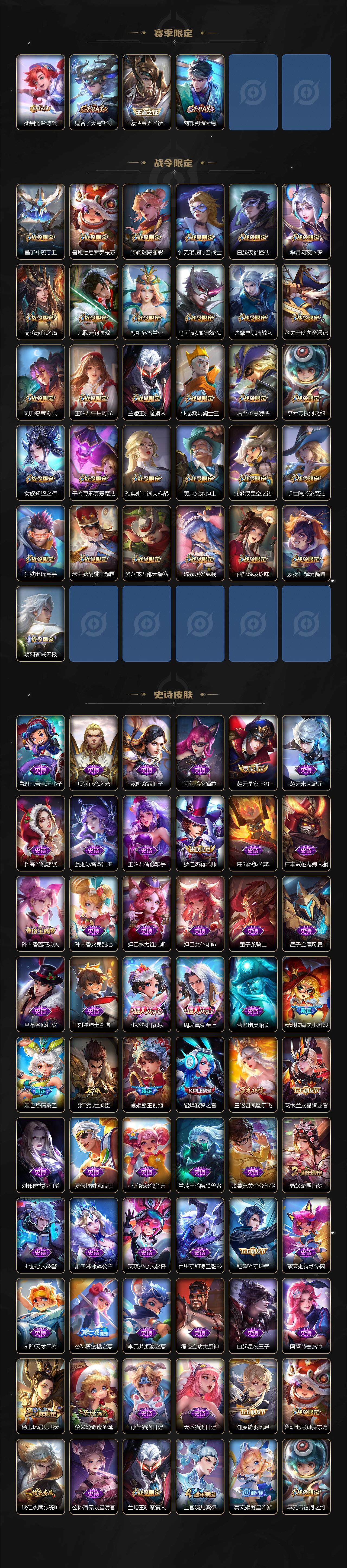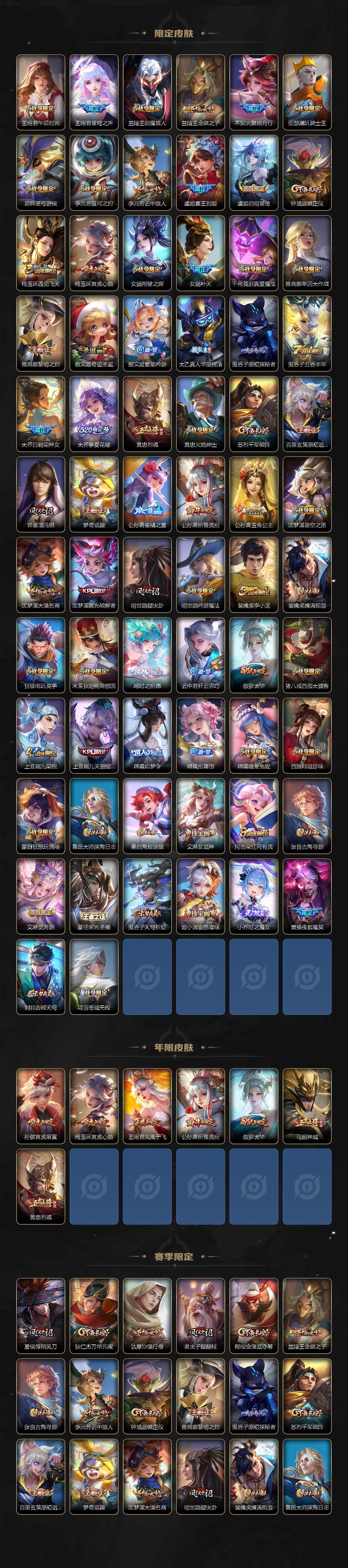 【限定皮肤】:狄仁杰阴阳师,小乔纯白花嫁,赵云皇家上将,墨子神迹守卫,妲己热情桑巴,妲己时之彼端,妲己时之奇旅,孙尚香蔷薇恋人,孙尚香异界灵契,鲁班七号狮舞东方,庄周高山流水,高渐离死亡摇滚,阿轲迷踪丽影,钟无艳超时空战士,孙膑天狼运算者,孙膑寅虎展翼,白起夜都怪侠,芈月白晶晶,芈月幻夜卜梦,周瑜真爱至上,周瑜赤莲之焰,元歌云间偶戏,元歌无心,夏侯惇朔风刀,甄姬女儿国国王,甄姬游园惊梦,甄姬落雪兰心,马可波罗暗影游猎,狄仁杰魔术师,狄仁杰万华元夜,达摩星际陆战队,达摩沙漠行僧,项羽海滩派对,老夫子醍醐杖,老夫子航海奇遇记,貂蝉逐梦之音,貂蝉遇见胡旋,安琪拉魔法小厨娘,程咬金演武夺筹,露娜启示之音,刘邦夺宝奇兵,王昭君凤凰于飞,王昭君午后时光,王昭君星穹之声,兰陵王驯魔猎人,兰陵王金庭之子,不知火舞绯月行,亚瑟潮玩骑士王,后羿圣弓游侠,李元芳银河之约,李元芳云中旅人,虞姬霸王别姬,虞姬启明星使,钟馗驱傩正仪,杨玉环遇见飞天,杨玉环寅虎心曲,女娲朔望之晖,女娲补天,干将莫邪真爱魔法,雅典娜单词大作战,雅典娜黎明之约,蔡文姬奇迹圣诞,蔡文姬繁星吟游,太乙真人华丽摇滚,鬼谷子原初探秘者,鬼谷子五谷丰年,大乔白鹤梁神女,大乔挚爱花嫁,黄忠烈魂,黄忠火炮绅士,苏烈千军破阵,百里玄策原初追逐者