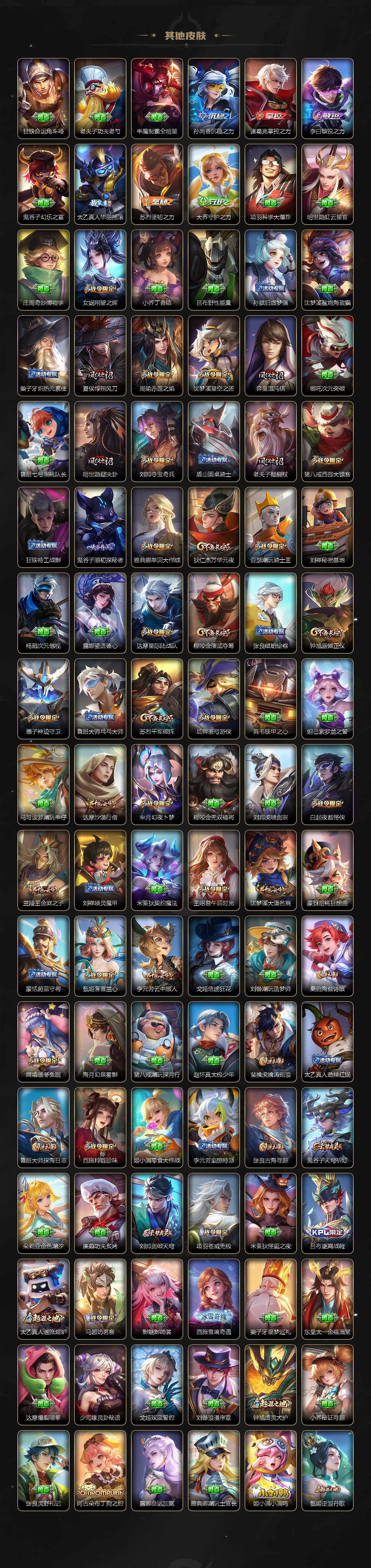 小乔青蛇,大乔白蛇,瑶遇见神鹿,娜可露露晚萤,伽罗箭羽风息,李元芳逐浪之夏,不知火舞魅语,公孙离无限星赏官,大乔猫狗日记,孙策猫狗日记,阿轲节奏热浪,露娜紫霞仙子,诸葛亮黄金分割率,王昭君偶像歌手,项羽苍穹之光,阿轲暗夜猫娘,雅典娜冰冠公主,鲁班七号电玩小子,橘右京修罗,墨子龙骑士,刘禅绅士熊喵,刘禅天才门将,白起星夜王子,安琪拉心灵骇客,安琪拉时之奇旅,程咬金功夫厨神,刘邦德古拉伯爵,兰陵王暗隐猎兽者,曹操幽灵船长,宫本武藏鬼剑武藏,亚瑟心灵战警,杨戬天秀·启明,蔡文姬舞动绿茵,廉颇地狱岩魂,西施诗语江南,小乔缤纷独角兽,夏侯惇乘风破浪,花木兰水晶猎龙者,铠曙光守护者,墨子金属风暴,百里玄策原初追逐者,吕布圣诞狂欢,貂蝉圣诞恋歌,百里守约特工魅影,嫦娥拒霜思,雅典娜黎明之约,艾琳奇遇舞章,貂蝉唤灵魅影,张良千筹问战,沈梦溪匿光破解者,刘禅电玩·爆裂旋风,曹操夜都魔契,赵怀真器灵·浮梦炉,亚连糖绘人间,狄仁杰绮世丹青
