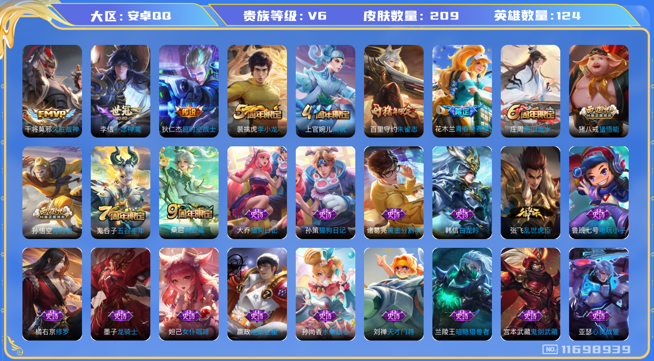 [11698939]【商品标题】:安卓Q-V5-最强王者段位-123英雄-209皮肤-0典藏-0珍品无双-0无双-0珍品传说-4传说-53史诗