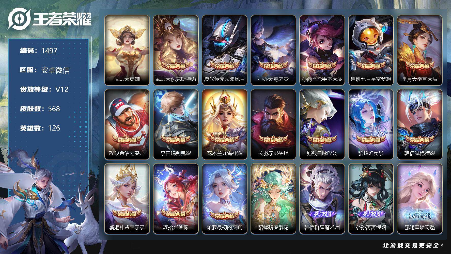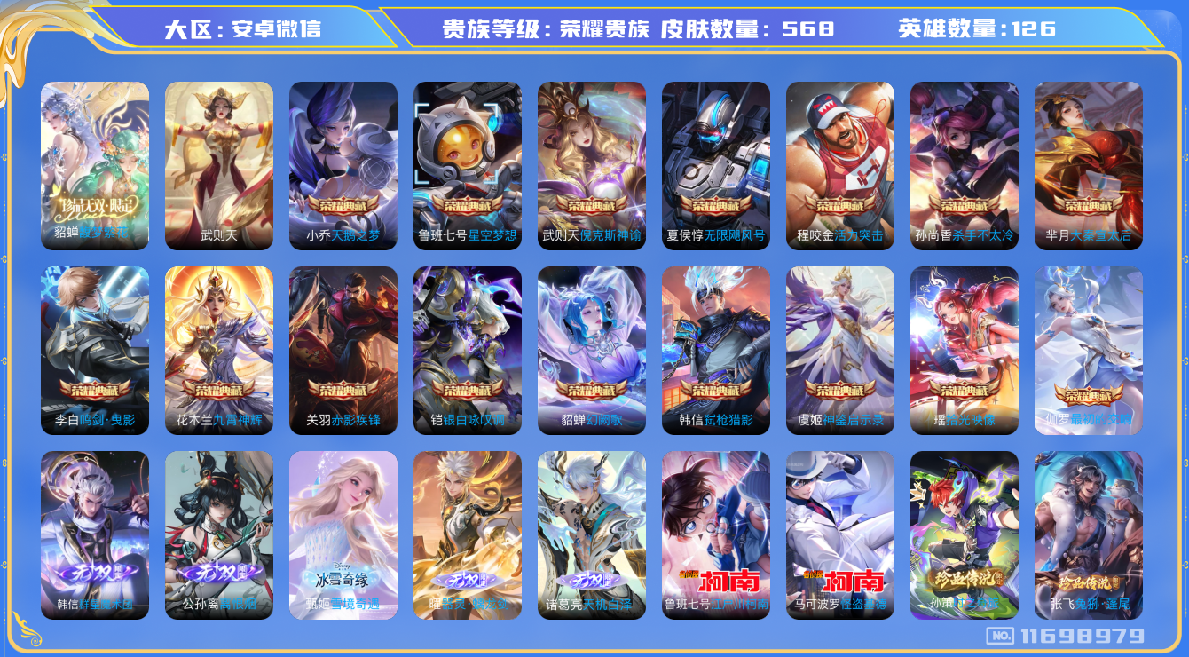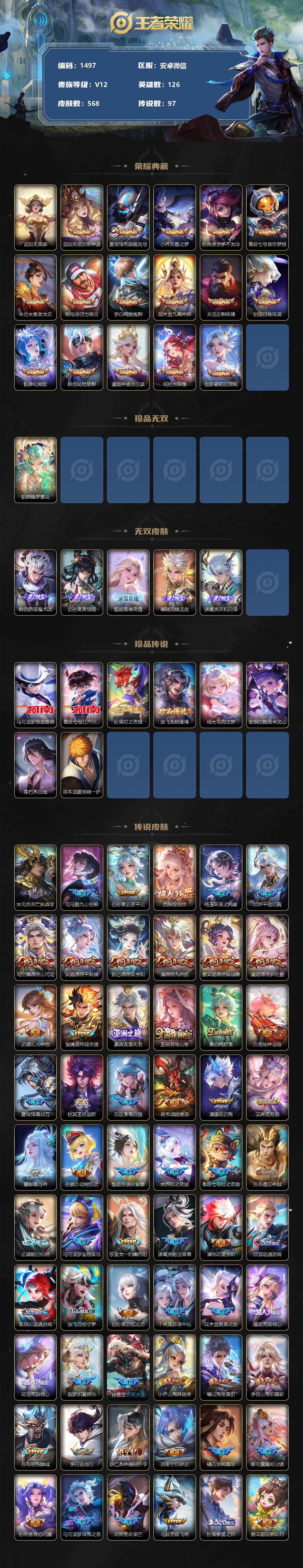 [11698979]【商品标题】:安卓WX-V12-最强王者段位-126英雄-568皮肤-16典藏-1珍品无双-5无双-8珍品传说-97传说-196史诗