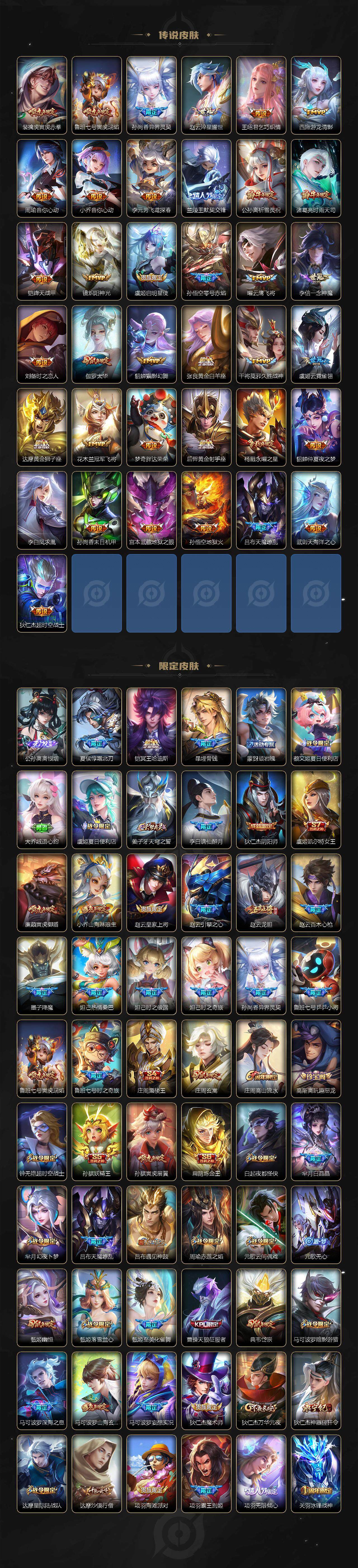 【传说皮肤】:大司命死亡执政官,司马懿九山相柳,公孙离云诺千山,西施续相思,杨玉环星之鸣奏,后羿千劫归真,司空震愿照山河定,女娲愿照千秋盛,妲己愿照众生和,澜愿照九州拓,蔡文姬愿照福禄聚,虞姬愿照岁时盈,云缨幻光神枪,裴擒虎祥瑞亨通,嬴政玄雷天君,王昭君映山客,桑启鸣野蒿,庄周牧神诗旅,夏侯惇霜北刀,铠冥王哈迪斯,亚连落雪白狼,典韦战鼓燎原,澜逐花归海,艾琳觅芳踪,露娜霜月吟,孙膑小动物乐团,甄姬至美化雀舞,大乔时之奇旅,鲁班七号时之奇旅,吕布遇见神鼓,云缨鹤归松栖,马可波罗妄想实况,东皇太一灼幽烈阳,诸葛亮鹤羽星尊,澜电玩雷克斯,亚瑟追逃游戏,安琪拉追逃游戏,张飞百相守梦,公孙离记忆之芯,干将莫邪画中仙,花木兰燃星之曲,虞姬无限倾心,项羽无限倾心,伽罗炽翼辉光,孙悟空齐天大圣,小乔山海琳琅生,曜山海苍雷引,李信山海炽霜斩,吕布怒海麟威,李白诗剑行,狄仁杰神器狴犴令,百里守约碎云,橘右京枫霜尽,娜可露露前尘镜,孙尚香音你闪耀,马可波罗深海之息,后羿无尽星芒,马超无双飞将,孙策挚爱之约,蔡文姬花朝如约,裴擒虎寅虎赤拳,鲁班七号寅虎瑞焰,孙尚香异界灵契,赵云淬星耀世,王昭君乞巧织情,西施游龙清影,周瑜音你心动,小乔音你心动,李元芳飞鸢探春,兰陵王默契交锋,公孙离祈雪灵祝,诸葛亮时雨天司,铠绛天战甲,镜炽阳神光,虞姬启明星使,孙悟空零号赤焰,曜云鹰飞将,李信一念神魔,刘备时之恋人,伽罗太华,貂蝉猫影幻舞,张良黄金白羊座,干将莫邪久胜战神,虞姬云霓雀翎,达摩黄金狮子座,花木兰冠军飞将,梦奇胖达荣荣,后羿黄金射手座,杨戬永