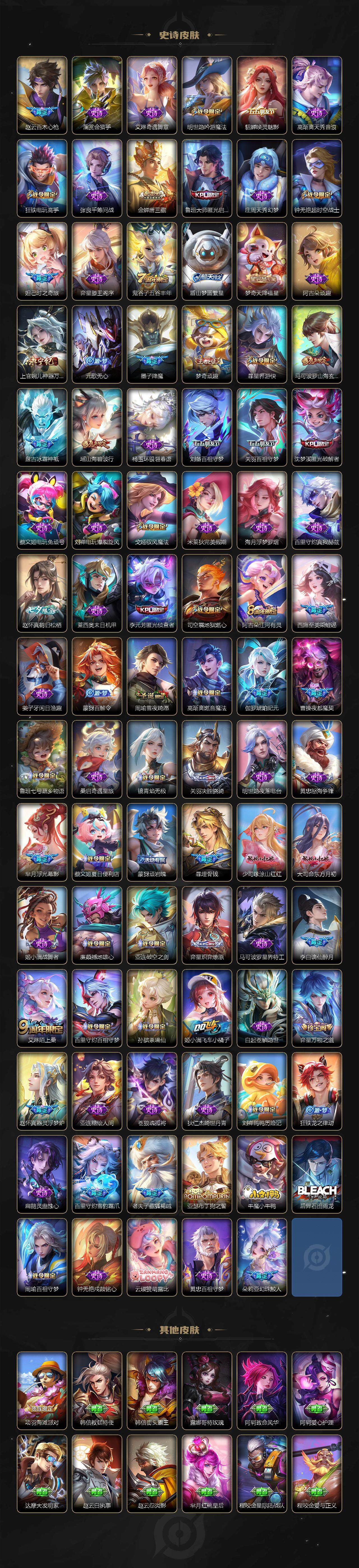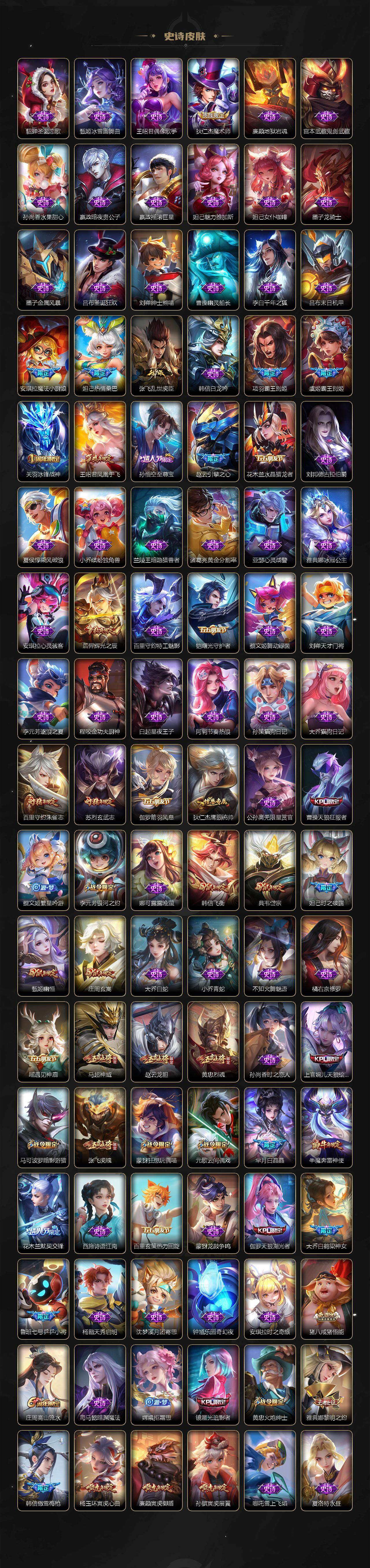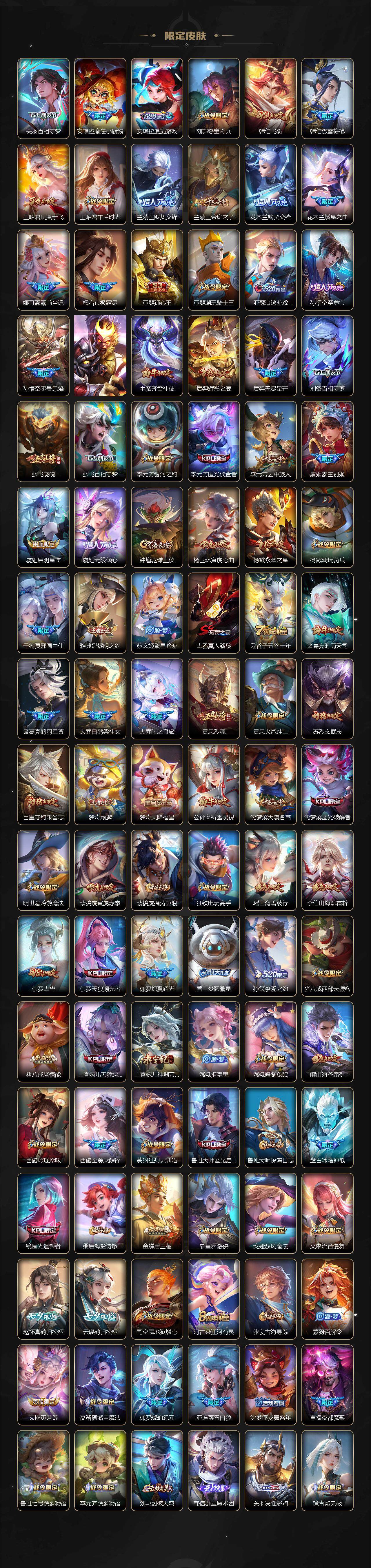 关羽冰锋战神,牛魔奔雷神使,公孙离祈雪灵祝,诸葛亮时雨天司,赵云龙胆,黄忠烈魂,张飞虎魄,马超神威,后羿辉光之辰,庄周玄嵩,典韦岱宗,甄姬幽恒,韩信飞衡,伽罗太华,曹操天狼征服者,上官婉儿天狼绘梦者,伽罗天狼溯光者,苏烈玄武志,百里守约朱雀志,王昭君凤凰于飞,项羽霸王别姬,虞姬霸王别姬,花木兰默契交锋,兰陵王默契交锋,孙悟空至尊宝,雅典娜神奇女侠,妲己热情桑巴,妲己时之彼端,芈月白晶晶,安琪拉魔法小厨娘,赵云引擎之心,鲁班七号乒乒小将,大乔白鹤梁神女,猪八戒猪悟能,廉颇寅虎·御盾,孙尚香异界灵契,镜匿光追影者,韩信傲雪梅枪,鲁班七号寅虎·瑞焰,孙膑寅虎·展翼,杨玉环寅虎·心曲,裴擒虎寅虎·赤拳,赵云百木心枪,后羿无尽星芒,马可波罗深海之息,金蝉唐三藏,娜可露露前尘镜,橘右京枫霜尽,鲁班大师匿光启智者,妲己时之奇旅,上官婉儿神器·万象笔,盾山梦圆繁星,墨子降魔,李白诗剑行,马可波罗山海·玄木吟,盘古冰霜神祇,瑶山海·碧波行,西施至美·乘鲤谣,甄姬至美·化雀舞,夏侯惇霜北刀,桑启鸣野蒿,艾琳陌上桑,王昭君映山客,澜愿照·九州拓,蔡文姬愿照·福禄聚,虞姬愿照·岁时盈,司空震愿照·山河定,妲己愿照·众生和,女娲愿照·千秋盛