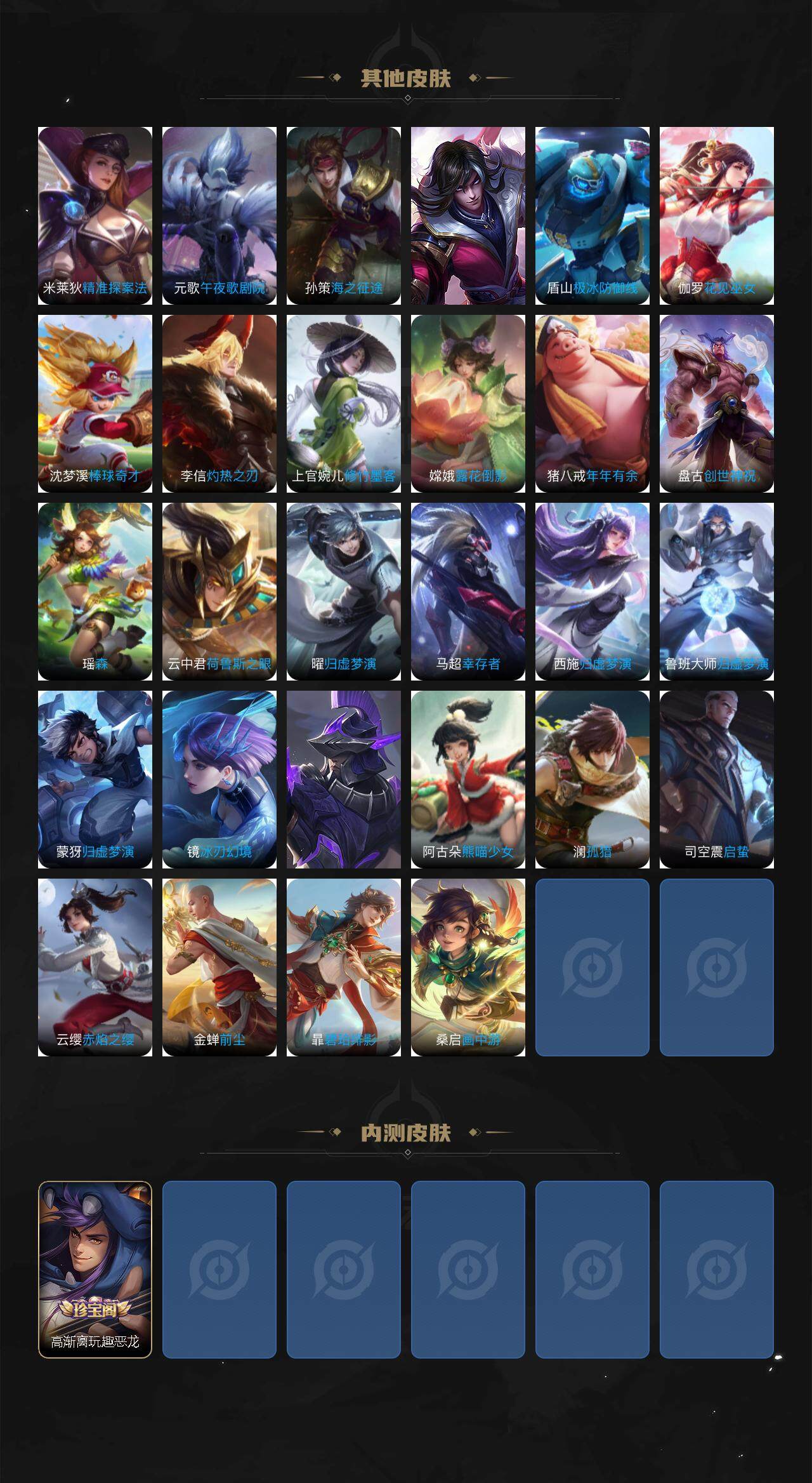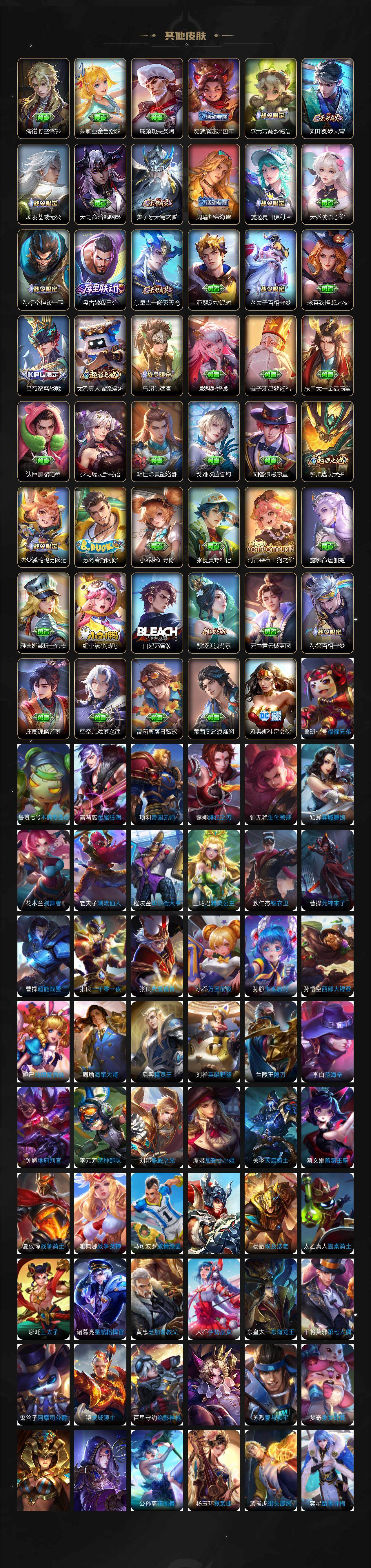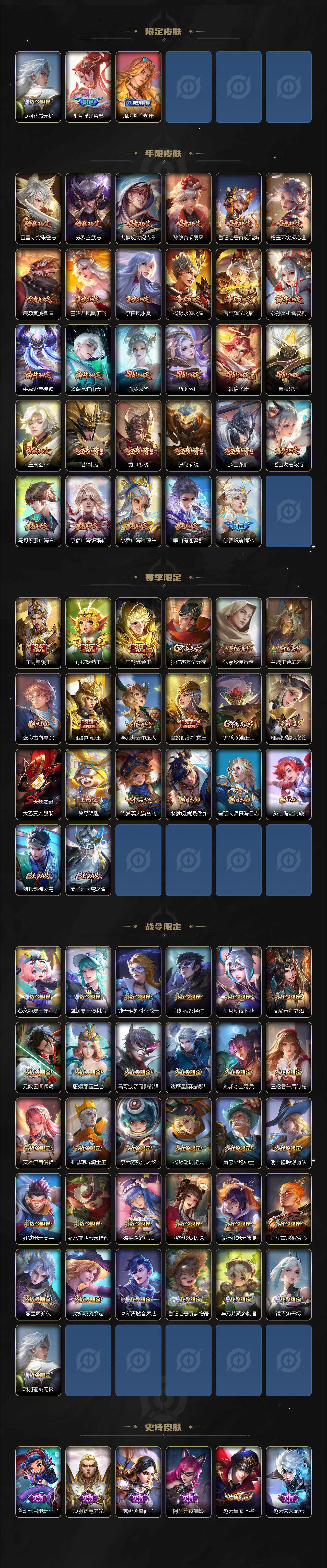 关羽冰锋战神,牛魔奔雷神使,公孙离祈雪灵祝,诸葛亮时雨天司,赵云龙胆,黄忠烈魂,张飞虎魄,马超神威,后羿辉光之辰,庄周玄嵩,典韦岱宗,甄姬幽恒,韩信飞衡,伽罗太华,曹操天狼征服者,上官婉儿天狼绘梦者,伽罗天狼溯光者,苏烈玄武志,百里守约朱雀志,王昭君凤凰于飞,项羽霸王别姬,虞姬霸王别姬,花木兰默契交锋,兰陵王默契交锋,孙悟空至尊宝,雅典娜神奇女侠,妲己热情桑巴,妲己时之彼端,芈月白晶晶,安琪拉魔法小厨娘,赵云引擎之心,鲁班七号乒乒小将,大乔白鹤梁神女,猪八戒猪悟能,廉颇寅虎·御盾,孙尚香异界灵契,镜匿光追影者,韩信傲雪梅枪,鲁班七号寅虎·瑞焰,孙膑寅虎·展翼,杨玉环寅虎·心曲,裴擒虎寅虎·赤拳,赵云百木心枪,后羿无尽星芒,马可波罗深海之息,金蝉唐三藏,娜可露露前尘镜,橘右京枫霜尽,鲁班大师匿光启智者,妲己时之奇旅,上官婉儿神器·万象笔,盾山梦圆繁星,墨子降魔,李白诗剑行,马可波罗山海·玄木吟,盘古冰霜神祇,瑶山海·碧波行,西施至美·乘鲤谣,甄姬至美·化雀舞,夏侯惇霜北刀,桑启鸣野蒿,艾琳陌上桑,王昭君映山客,澜愿照·九州拓,蔡文姬愿照·福禄聚,虞姬愿照·岁时盈,司空震愿照·山河定,妲己愿照·众生和,女娲愿照·千秋盛