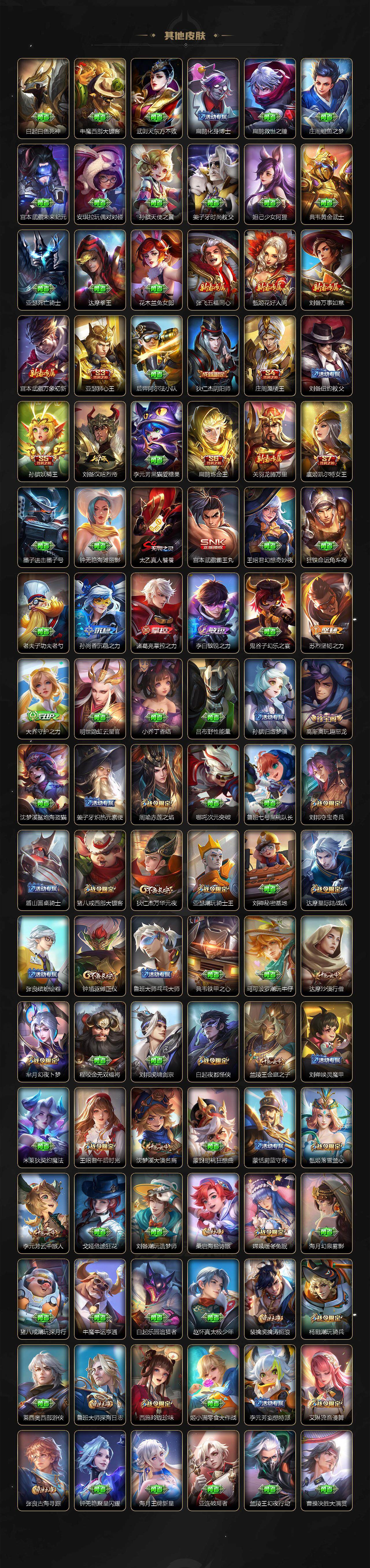 小乔青蛇,大乔白蛇,瑶遇见神鹿,娜可露露晚萤,伽罗箭羽风息,李元芳逐浪之夏,不知火舞魅语,公孙离无限星赏官,大乔猫狗日记,孙策猫狗日记,阿轲节奏热浪,露娜紫霞仙子,诸葛亮黄金分割率,王昭君偶像歌手,韩信白龙吟,项羽苍穹之光,孙尚香时之恋人,阿轲暗夜猫娘,雅典娜冰冠公主,吕布末日机甲,鲁班七号电玩小子,蒙犽龙鼓争鸣,橘右京修罗,墨子龙骑士,嬴政摇滚巨星,刘禅绅士熊喵,刘禅天才门将,白起星夜王子,安琪拉心灵骇客,安琪拉时之奇旅,程咬金功夫厨神,刘邦德古拉伯爵,兰陵王暗隐猎兽者,曹操幽灵船长,宫本武藏鬼剑武藏,司马懿暗渊魔法,亚瑟心灵战警,钟馗乐园奇幻夜,杨戬天秀·启明,蔡文姬舞动绿茵,廉颇地狱岩魂,西施诗语江南,小乔缤纷独角兽,夏侯惇乘风破浪,花木兰水晶猎龙者,铠曙光守护者,百里玄策热力回旋,墨子金属风暴,吕布圣诞狂欢,貂蝉圣诞恋歌,百里守约特工魅影,嬴政暗夜贵公子,嫦娥拒霜思,雅典娜黎明之约,李白千年之狐,哪吒雪上飞焰,夏洛特永昼,澜赏金猎手,艾琳奇遇舞章,貂蝉唤灵魅影,高渐离天秀·音浪,张良千筹问战,庄周天秀·幻梦,弈星滕王阁序,阿古朵顽趣,杨玉环银翎春语,刘备百相守梦,关羽百相守梦,沈梦溪匿光破解者,蔡文姬电玩·兔顽号,刘禅电玩·爆裂旋风,海月浮梦罗烟,百里守约真我赫兹,赵怀真鹤归松栖,莱西奥末日机甲,李元芳匿光侦查者,姜子牙闲日渔趣,蒙犽百解令,周瑜雪夜绮愿,高渐离燃音魔法,伽罗琥珀纪元,曹操夜都魔契,桑启奇遇星旅,关羽决胜骁骑,明世隐夜落电台,李白谪仙醉月,姬小满飞车小橘子,白起苍鳞隐世,赵怀真器灵·浮梦炉,亚连糖绘人间,苍狼魂孤将,狄仁杰绮世丹青