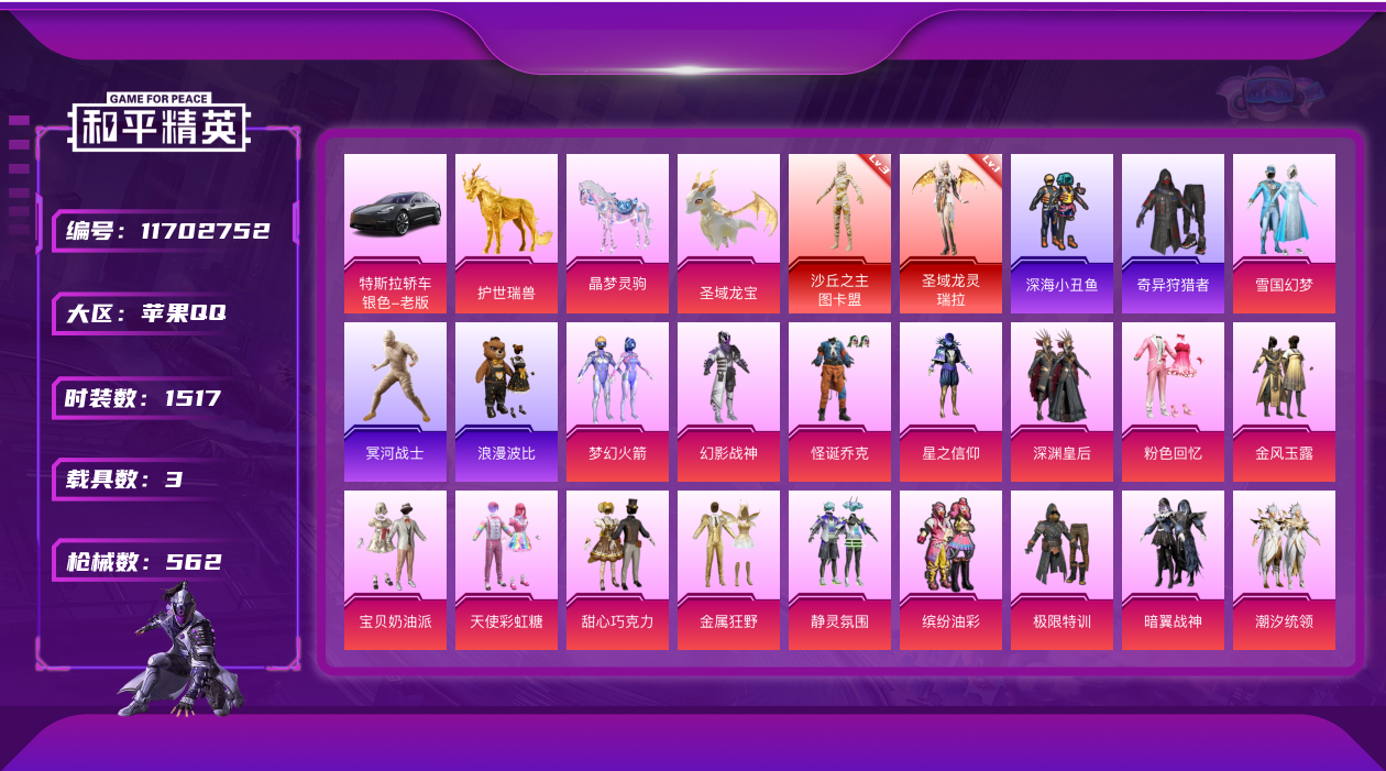 [11702752]苹果q 极品🆔雅观 实名: 可修改 时装数: 1517 载具数: 3 枪械数: 562 战备数: 383 神级装扮: 沙丘之主-图卡盟,圣域龙灵-瑞拉 热门装扮: 奇异狩猎者,梦幻火箭(新101),极限特训,幻影战神,甜心巧克力,怪诞乔克,深海小丑鱼,星之信仰,深渊皇后,金风玉露,宝贝奶油派,浪漫波比,天使彩虹糖,梦魇先生,放客神游,金属狂野,静灵氛围,鹰眼刺客,缤纷油彩,爱崽白熊,粉色回忆,都市猎人,暗翼战神,黄伞悠悠,绚金战神,草莓生巧,炙焰红王,花间之火,冰霜白皇,精灵迷巫,潮汐统领,童趣迷兔,迷蝶贵族,雪国幻梦,俏皮狐尾,星空之魅,山涧鹿灵,相思残雪,馨动时刻,迪迦闪耀型,冥河战士,蜜桃特工,彩虹鹿灵,俏雪含霜,洛天依,蓝莓炮弹,精灵娃娃,酣梦娃娃,甜心娃娃,焦糖拿铁,百合蜜语,甜梦小狐,筑梦精灵,圣光天使,霞光圣骑,寒光使者,妙趣可丽,暖熊萌萌,复仇流浪者,绒雪飘舞,垂柳戏鸭,灵感创作师,彩虹甜喵,女娲后裔-赵灵儿,甜蜜草莓,旋转彩虹,冰川粉黛,冰川红玫,冰川幽秘,潮萌小黄鸭,大橘为重,恶魔喵喵,激萌罗小黑,罗小黑,萌神柯基,奶芙汪汪,胖达团团,奇迹天团,软萌银虎,神秘黑猫,动感兔斯基,兔兔白日梦,启明星,音爆索尼克,派对舞王,仲夏莫吉托,雪梅暗香,诡夜天鹅,第五大道,飒粉甜心,小可学妹,白勺歌姬,呆萌星弥,南国舞曲,未来歌姬,闲梦青缨,傲傲奶龙,镜光幻境,蜜语绒猫,严莉莉,美雪,美琪,小蓝,千金淑猫,樱桃泡泡,智耀战神,星穹咏叹调,荧海星豚 载具: 特斯拉Model 3(冷光银),护世瑞兽,晶梦灵驹,僚机-圣域龙宝 稀有枪皮: MG3洛神天依,M762甜蜜誓约,AKM炫紫旋律,SCAR-L梦幻火箭,AKM甜心宝贝,AWM花间之火,M416心之恋语,M416全功率超战,SCAR-L童趣迷兔,AUG星之彼岸,汤姆逊怪笑疯兔,M249蓝莓炮弹,GROZA焦糖拿铁,UMP45恐龙拽拽,SCAR-L甜梦小狐,UZI筑梦精灵,AUG妙趣可丽,M16A4垂柳戏鸭,M249彩虹甜喵,P90甜蜜草莓,GROZA旋转彩虹,M417第五大道,Vector飒粉甜心,Kar98K未来歌姬,平底锅仲夏莫吉托,M416超新星,M24莲影清波,PKM江南烟雨,AMR鸢尾晶梦,AKM-幽焰骑士,DP-28-千金淑猫,Kar98K-巳巳如意,SCAR-L金蛇镇世,破片手榴弹-热量炸弹,MK14-樱桃泡泡,Fa