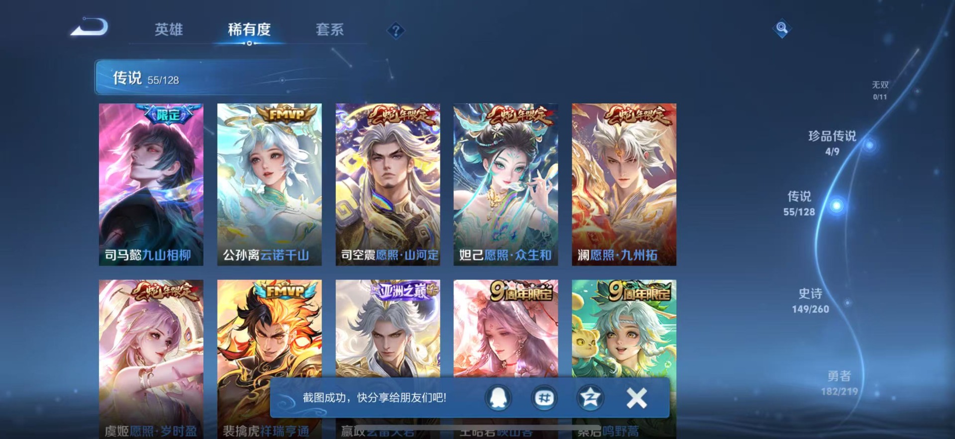 - PX_2098584-1 安卓QQ/ v7/ 211皮肤/ 121英雄 【8 稀有英雄】嬴政,不知火舞,橘右京,夏洛特,娜可露露,韩信,艾琳,赵云, 【3 珍品传说】江户川柯南 鲁班七号,怪盗基德 马可波罗,时之奇旅 孙策, 【1 典藏皮肤】星域神启 诸葛亮, 【9 传说皮肤】逐花归海 澜,地狱火 孙悟空,齐天大圣 孙悟空,黄金射手座 后羿,时之恋人 刘备,乘龙·铭钟鼎 赵云,绛天战甲 铠,冥王