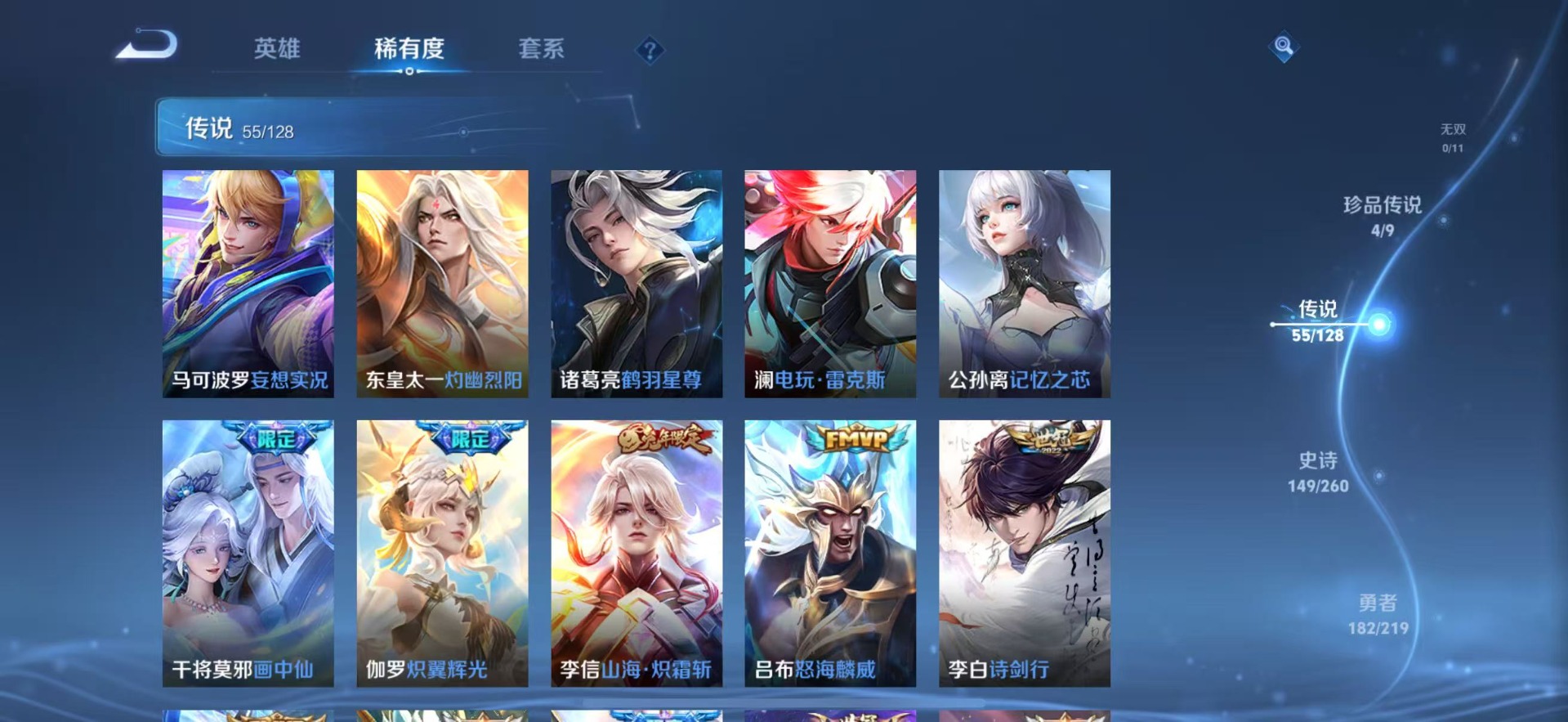 - PX_2089990-43 安卓QQ/非凡王者/247皮肤/123英雄/2典藏/0珍品无双/0无双/0珍品传说/8传说/68史诗/8稀有英雄 【2 典藏皮肤】鸣剑·曳影 李白,拾光映像 瑶, 【8 传说皮肤】无双飞将 马超,地狱之眼 宫本武藏,炽阳神光 镜,乘龙·问璇玑 孙尚香,一念神魔 李信,愿照·九州拓 澜,祥瑞亨通 裴擒虎,鸣野蒿 桑启, 【68 史诗皮肤】末日机甲 吕布,蔬乡物语 鲁班七号