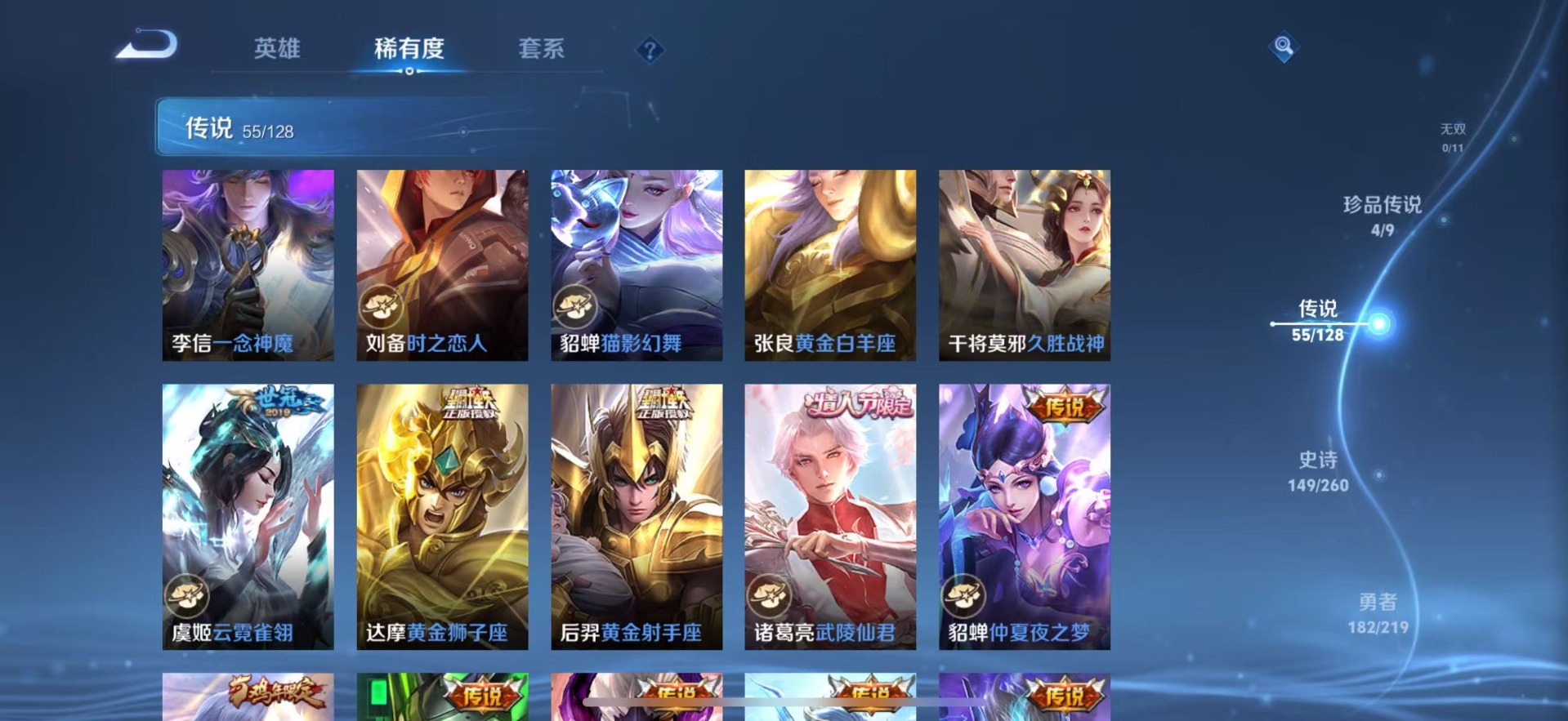 刘备时之恋人,铠绛天战甲,孙膑小动物乐团,赵云淬星耀世,干将莫邪久胜战神,典韦战鼓燎原,干将莫邪画中仙,李信一念神魔,孙策末日机甲,达摩黄金狮子座,海月金乌负日,王昭君乞巧织情,露娜霜月吟,庄周牧神诗旅,镜炽阳神光,公孙离记忆之芯,宫本武藏惊梅引,裴擒虎祥瑞亨通,貂蝉猫影幻舞,艾琳觅芳踪,嬴政玄雷天君,张良黄金白羊座,曜云鹰飞将,马超无双飞将,云中君群星魔术团,墨子黄金天蝎座,澜逐花归海,虞姬云霓雀翎