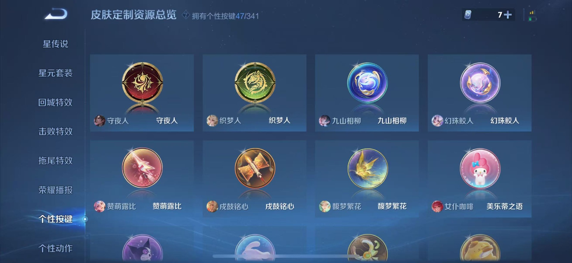 伽罗天狼溯光者,赵云百木心枪,孙尚香异界灵契,镜匿光追影者,诸葛亮时雨天司,司空震愿照·山河定,裴擒虎李小龙,上官婉儿梁祝,上官婉儿神器·万象笔,李白诗剑行,艾琳陌上桑,桑启鸣野蒿,孙悟空孙行者,孙悟空大圣娶亲,孙悟空至尊宝,芈月白晶晶,马超神威,赵云引擎之心,妲己愿照·众生和,韩信傲雪梅枪,韩信逐梦之影,百里守约朱雀志,澜愿照·九州拓,虞姬霸王别姬,虞姬愿照·岁时盈,王昭君映山客
