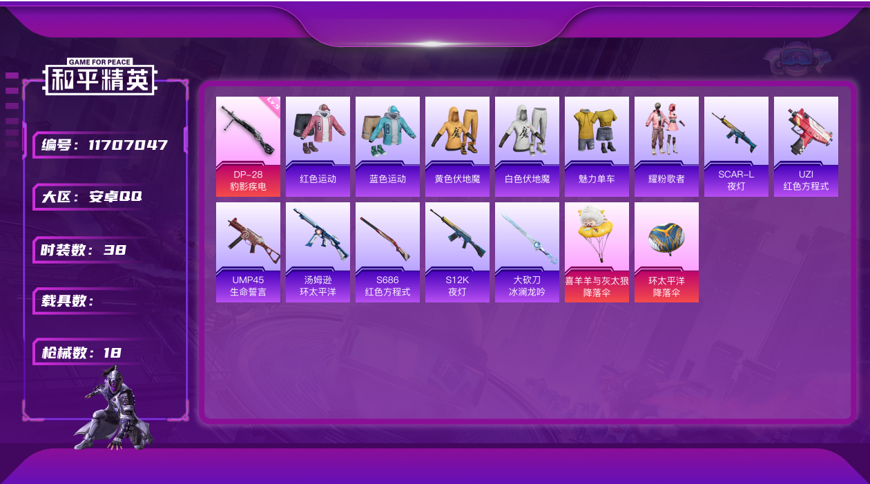 [11707047]1红装 1特效枪 可二次 可修改实名 稀有枪皮:DP-28-豹影疾电 五级特效枪:五级DP-28-豹影疾电 紫色装扮:蓝色运动,魅力单车,黄色伏地魔,白色伏地魔,红色运动,耀粉歌者 优质战备:喜羊羊与灰太狼降落伞,环太平洋降落伞