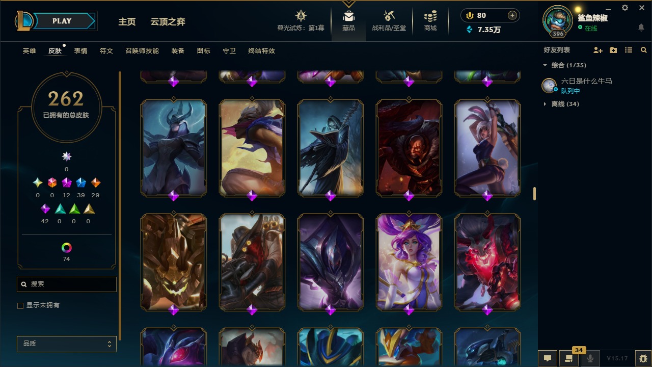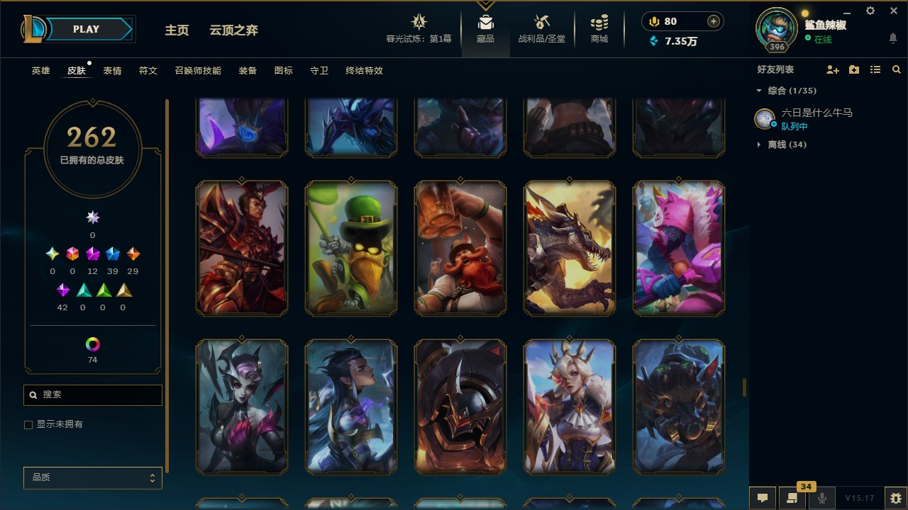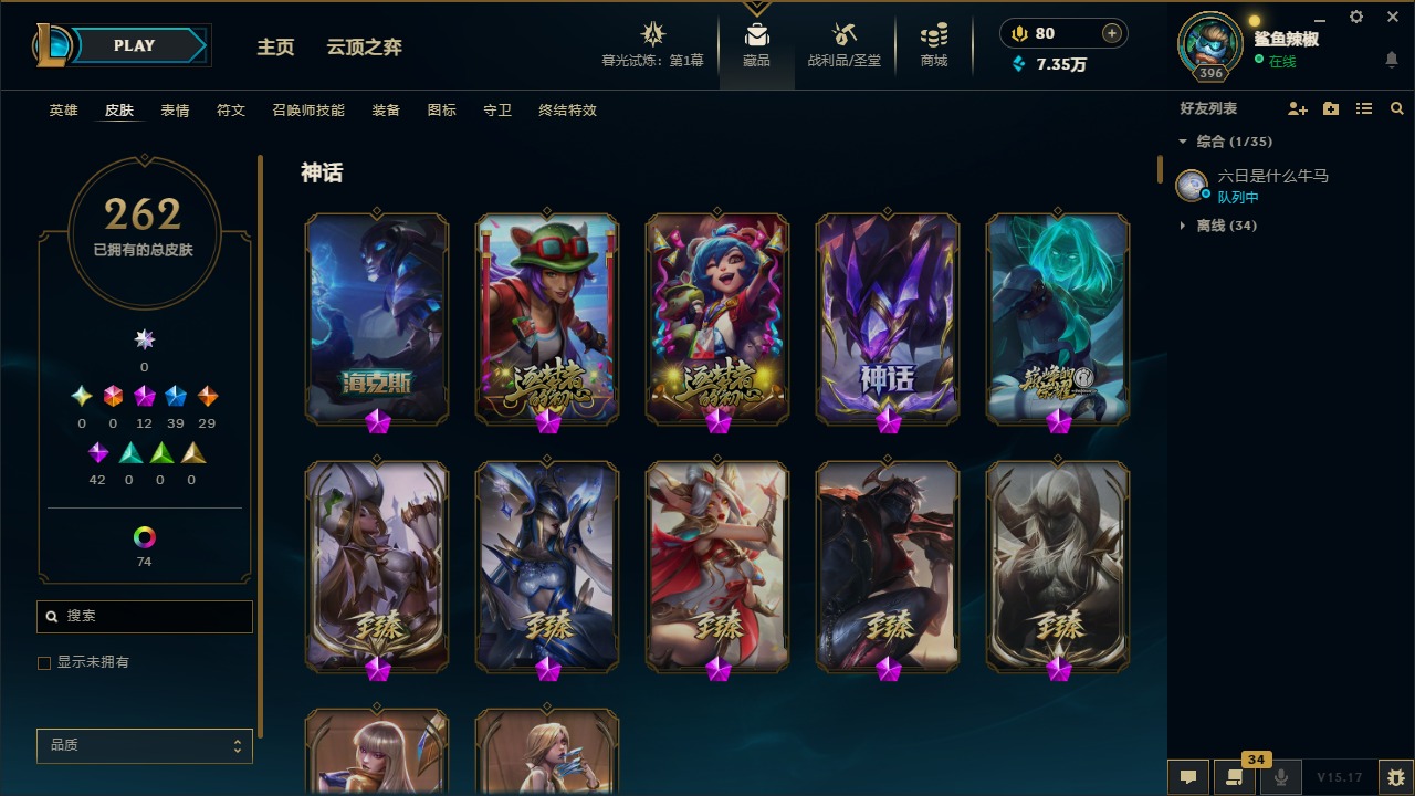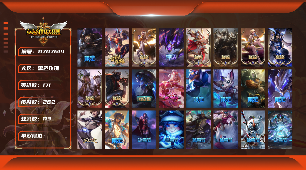 [11707614]12神话 39限定 29传说 42史诗 262皮肤 113炫彩 171英雄 可二次 可修改实名 优质装备:至臻 腥红之月 亚托克斯,至臻 魅惑女巫 厄运小姐,至臻 K/DA 卡莎,至臻 K/DA 伊芙琳,至臻 神凰行者 烈羽焰凰 霞,至臻 西部魔影 泰隆,至臻 青花瓷 丽桑卓 至臻:水晶掠夺者 卡兹克 海克斯:海克斯 玛尔扎哈 限定:双城之战2 范德尔 沃里克,玉剑传说 舞龙卫 情人节限定:甜心宝贝 娑娜 赛季限定皮:胜利之运 崔斯特,胜利剑圣 易,胜利女神 娑娜,胜利巨口 克格莫 冠军限定系列:S1FNC 酒桶,S5 SKT T1 阿利斯塔,S7 SSG 纳尔,S8 IG 卡密尔,S12 DRX 茂凯 冰雪节限定:“主人不要我了” 阿木木,冰封王子 蒙多,寒冬精灵 璐璐,魄罗骑士 瑟庄妮,幸福女神 乐芙兰,雪默丁格,北极星圣贤 基兰,北极星猎人 斯维因 泳池派对:海之歌 永恩 万圣节限定:鬼影森森 茂凯,伯爵 卡萨丁,大魔法锅 布里茨,鬼影重重 魔腾,古拉伯爵 克烈,魅惑女巫 波比,魅惑女巫 悠米,南瓜头 费德提克,死亡誓约 维克托,无头骑士 人马